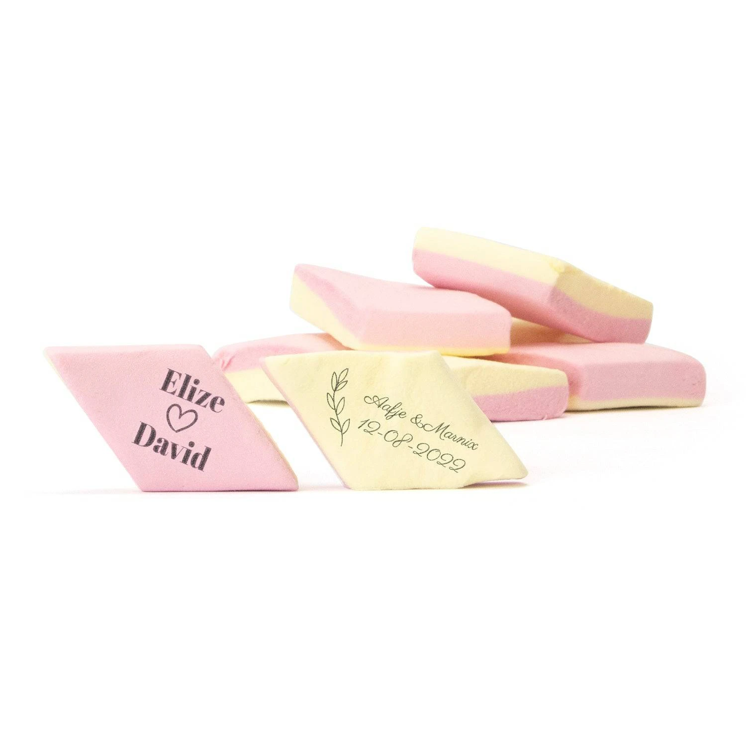 Heerlijke ruitspekken met jouw persoonlijk bedrukking. Ze worden geleverd per emmer van 700 gram (ca 100 stuks). De spekken worden bedrukt in één kleur met een korte tekst, bijvoorbeeld namen en trouwdatum.
