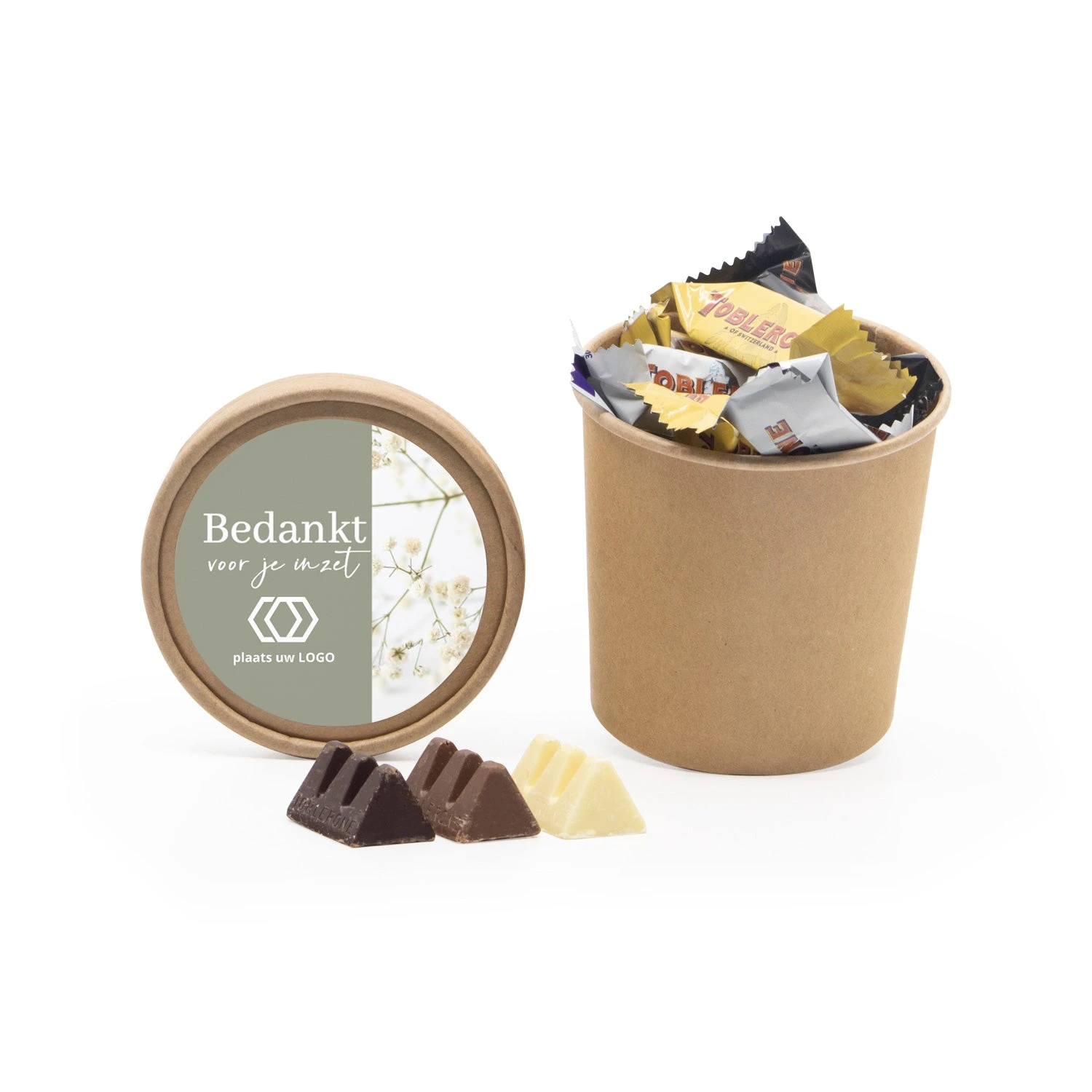 Een leuke kraftbeker voorzien van een eigen etiket op het deksel. Deze beker heeft een natuurlijke uitstraling en is afgevuld met een chocolade vulling naar keuze, zodat het aansluit bij jouw boodschap.