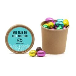 Een leuke kraftbeker met paaseitjes, voorzien van een eigen paasetiket op het deksel. Deze beker met natuurlijke uitstraling is afgevuld met melkchocolade paaseitjes. Een leuk cadeau om weg te geven als bedankje voor de Pasen!