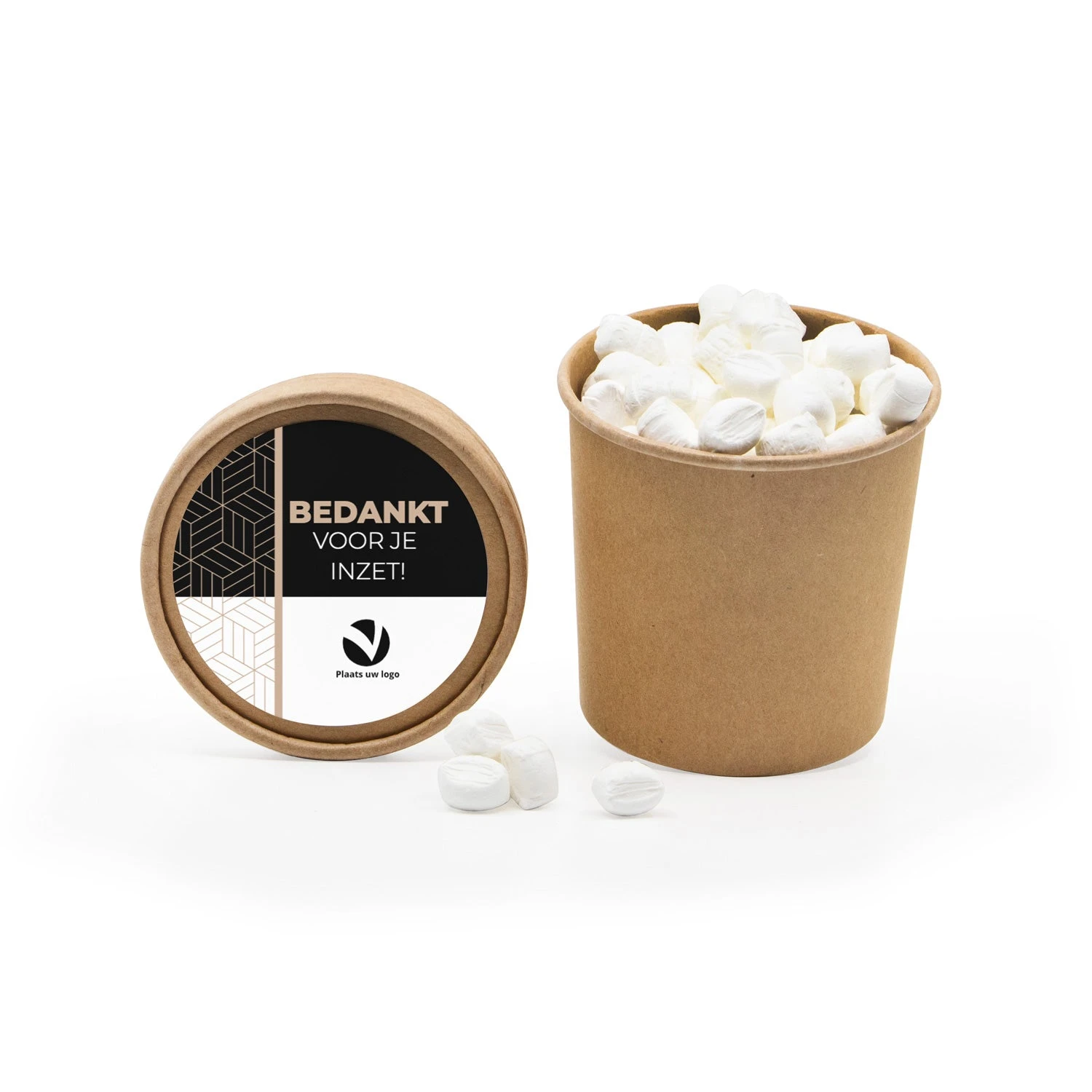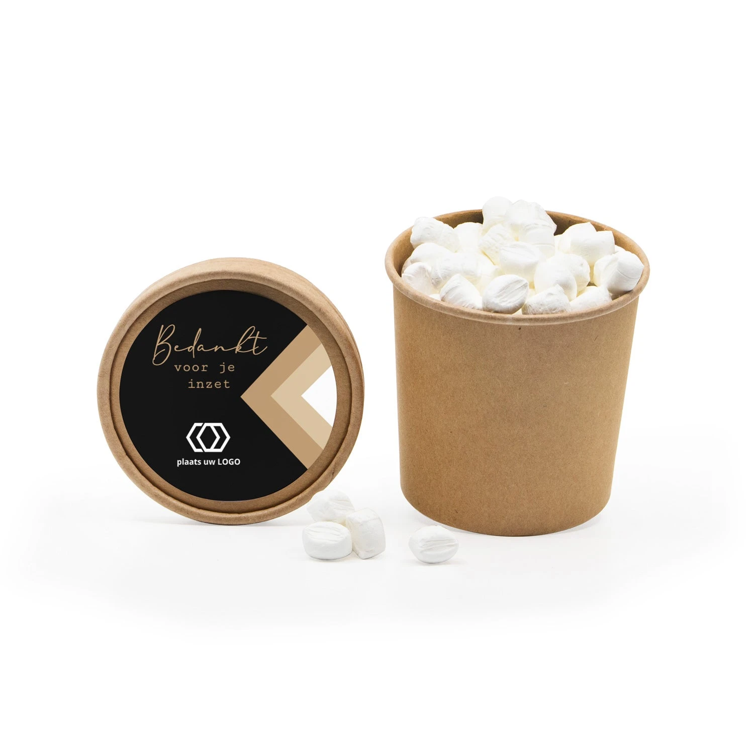 Een leuke kraftbeker voorzien van een eigen etiket op het deksel. Deze beker heeft een natuurlijke uitstraling en is afgevuld met een vulling naar keuze, zodat het aansluit bij jouw boodschap.Â