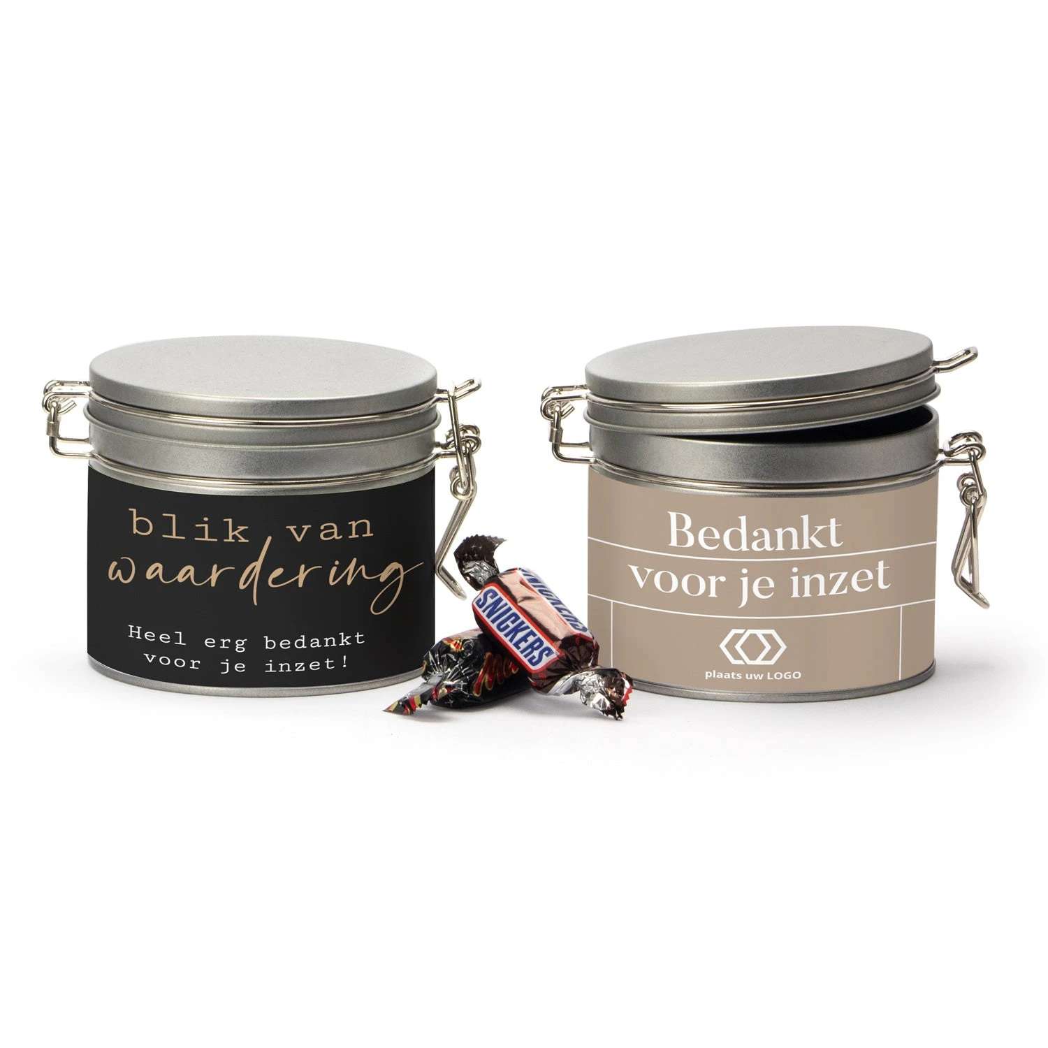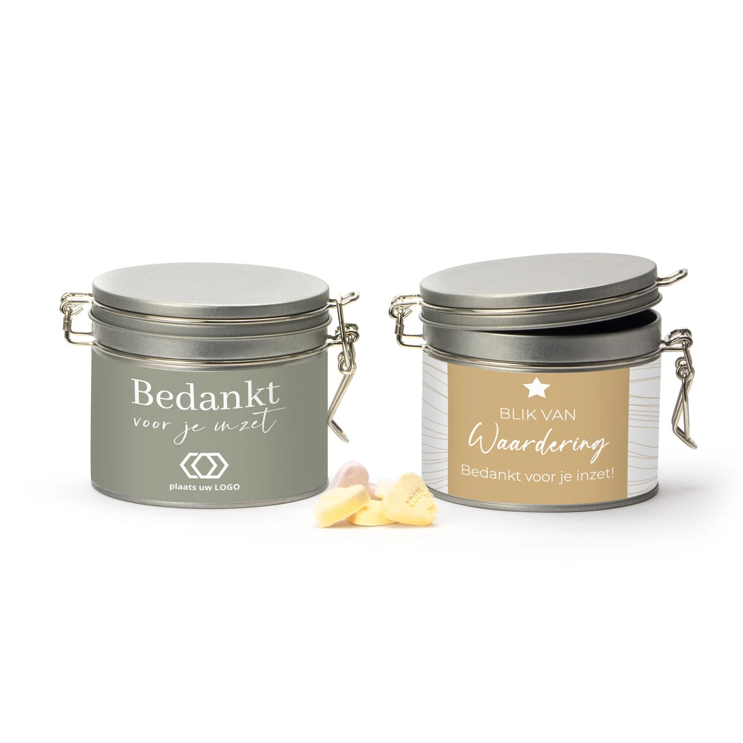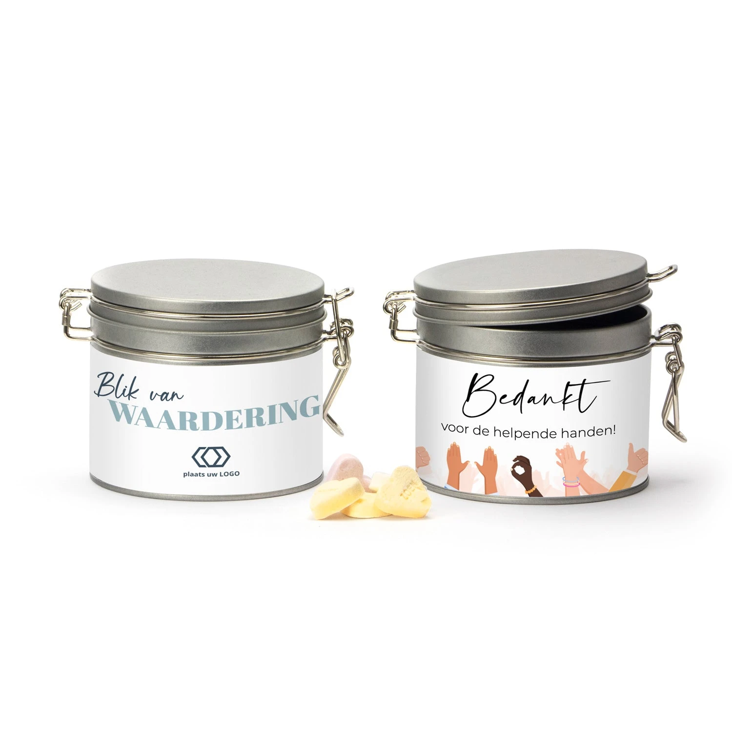 Fraai beugelblik voorzien van een eigen wikkel en afgevuld met een snoepsoort naar keuze. Dit snoepblik met beugelsluiting kun je helemaal personaliseren met een eigen ontwerp. Silver finish afwerking en een luchtdichte sluiting.