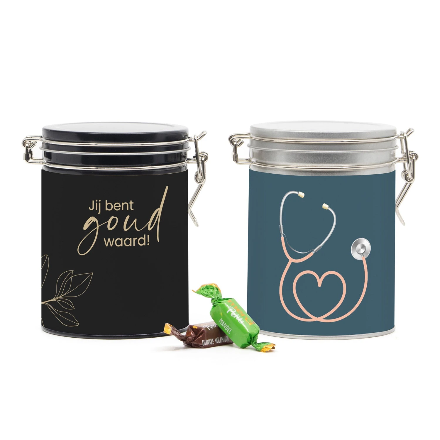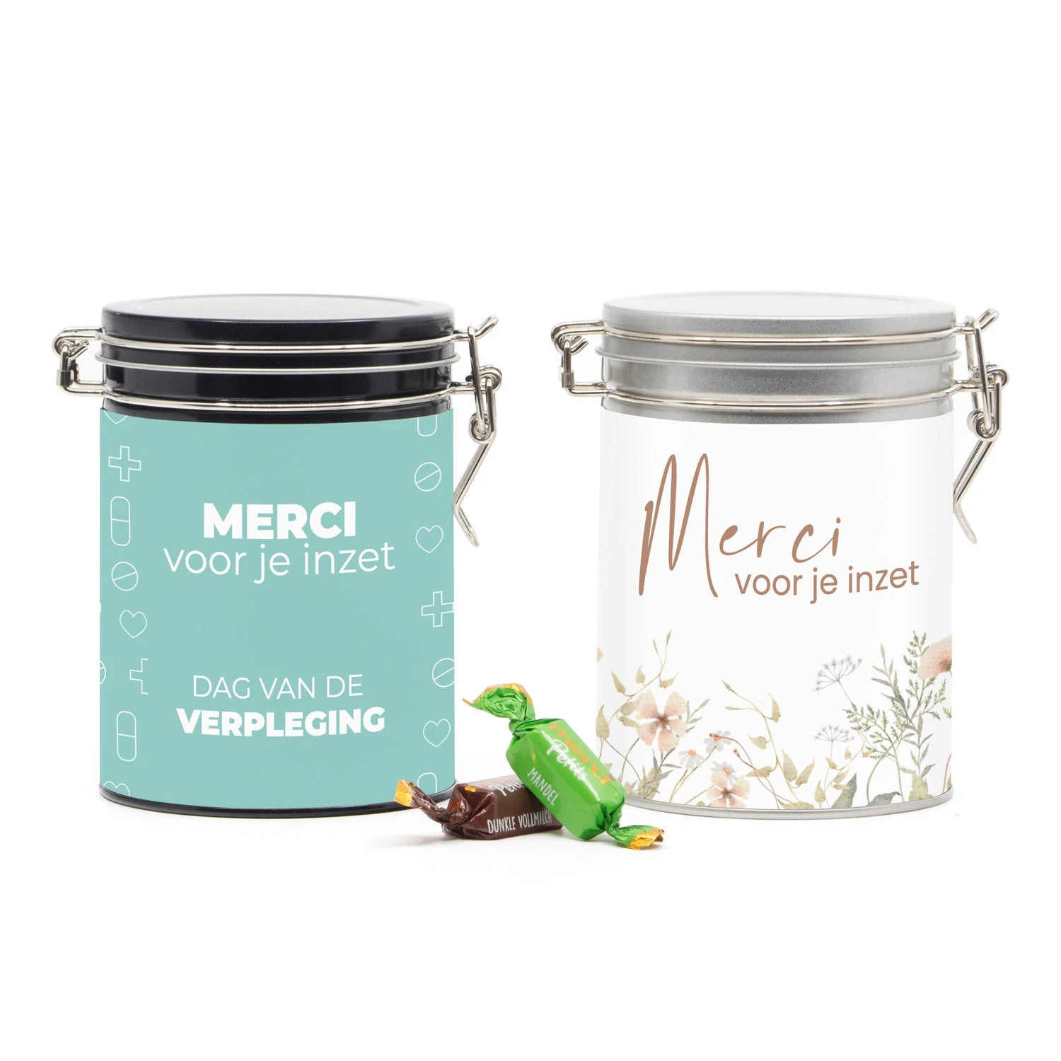 Merci voor je inzet. Een mooi snoepblik met beugelsluiting, voorzien van een eigen wikkel en afgevuld met een zak Merci petits chocolaatjes. Een blik die je helemaal kunt personaliseren met een eigen ontwerp. Silver finish afwerking en luchtdichte sluiting door middel van een beugel.