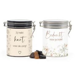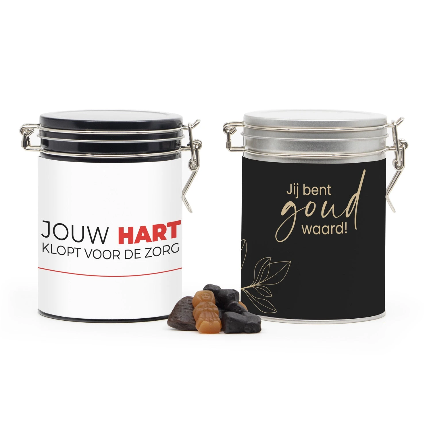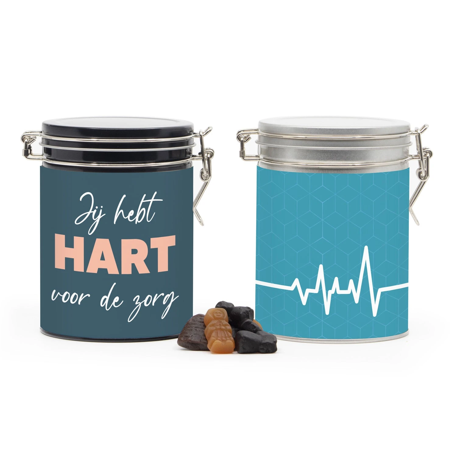 Fraai snoepblik met beugelsluiting, voorzien van een eigen wikkel en afgevuld met een snoepsoort naar keuze. Een blik van waardering voor de verplegers die je helemaal kunt personaliseren met een eigen ontwerp. Silver finish afwerking en luchtdichte sluiting door middel van een beugel.