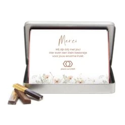 Let op: de kaart wordt onder de plastic wikkel geschoven die al om de Merci doos heen zit