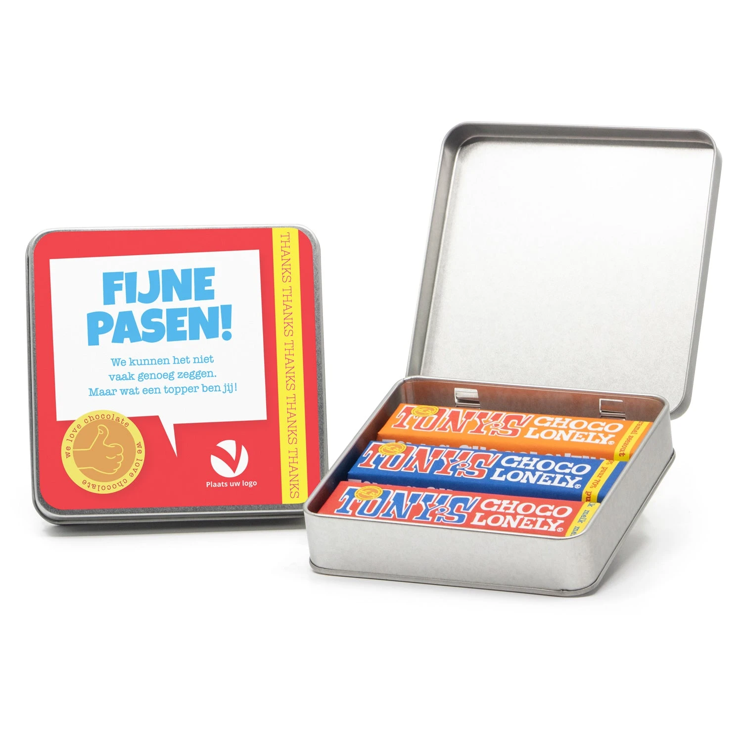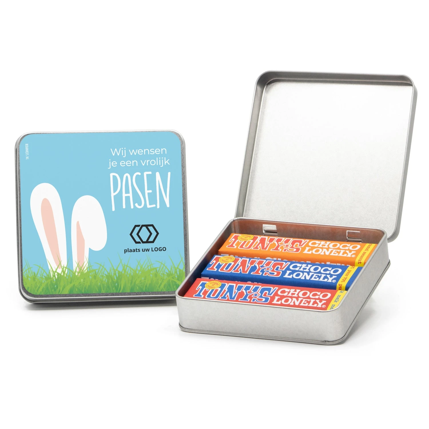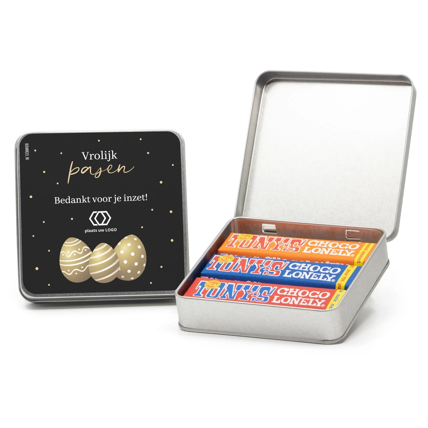 Een vierkant blik met drie verschillende Tony’s Chocolonely repen van 50 gram, inclusief een persoonlijke boodschap op het deksel. Op het etiket kan een persoonlijke paasboodschap worden geplaatst. Wil je naast het persoonlijke etiket op het deksel nog een extra kaart met eigen tekst in het blik? Klik hier voor een 10x10cm kaart die we kunnen bijsluiten