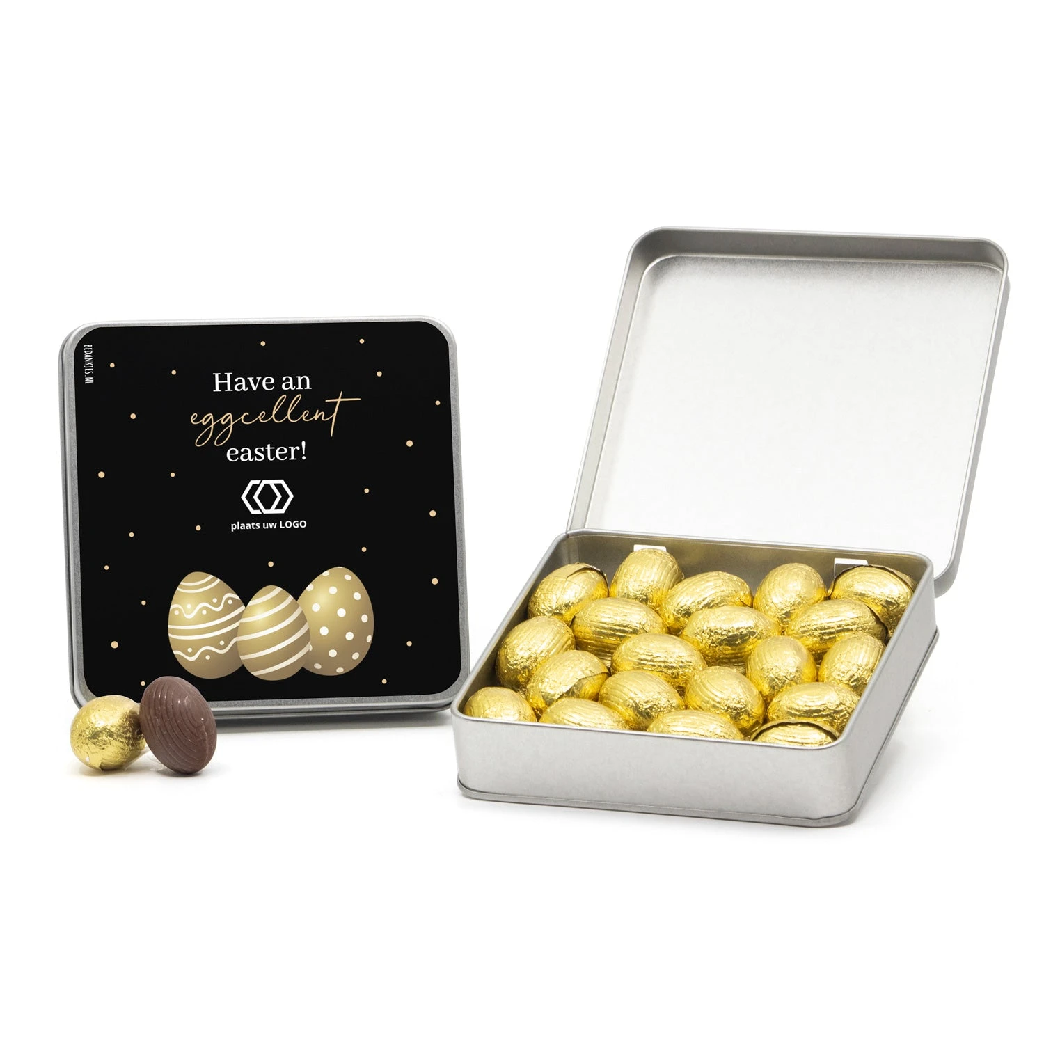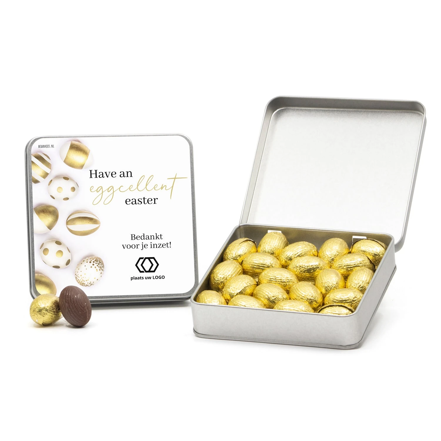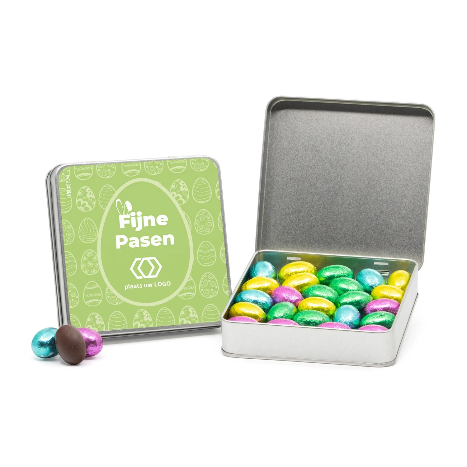 Vierkant blik met 185 gram melkchocolade paaseitjes, inclusief een persoonlijke boodschap op het deksel. Op het etiket kan een persoonlijke tekst en/of je logo worden geplaatst, dit kun je doen in onze ontwerptool.