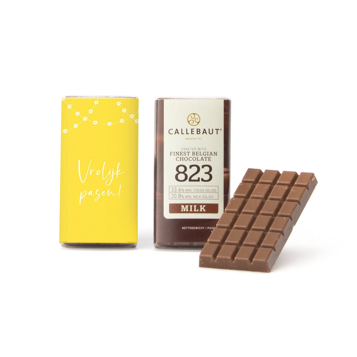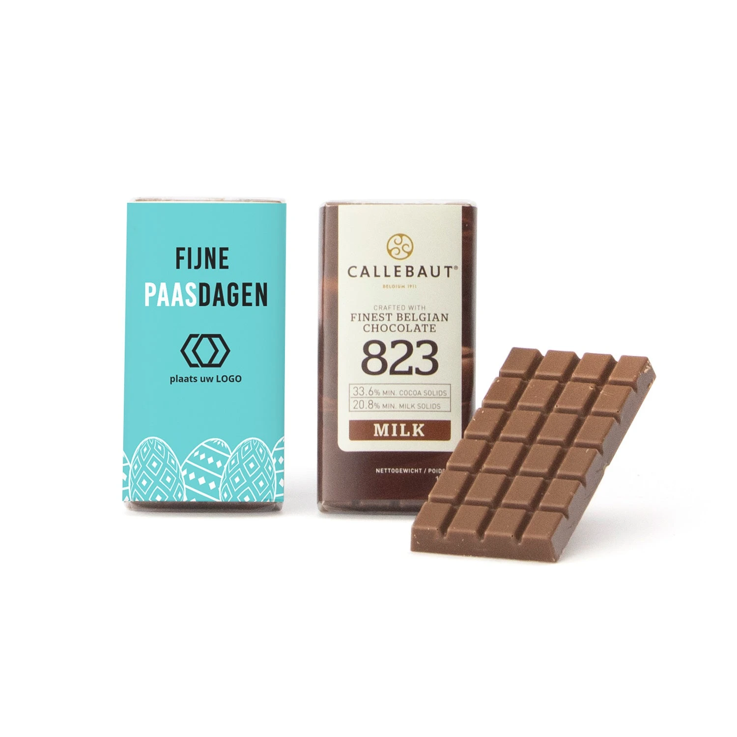 Weer eens wat anders dan paaseitjes… Een persoonlijk mini chocoladereepje (3,5 x 6,5cm) om uit te delen aan klanten met pasen. Deze callebaut chocolaatjes met je eigen foto en/of tekst erop zijn lekker en leuk! De chocolaatjes zijn verkrijgbaar in melkchocolade. Om deze bedankjes persoonlijk te maken, ontwerp je met onze online ontwerptool heel eenvoudig een eigen etiket.