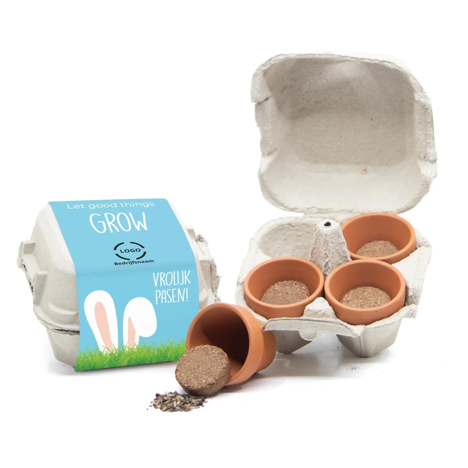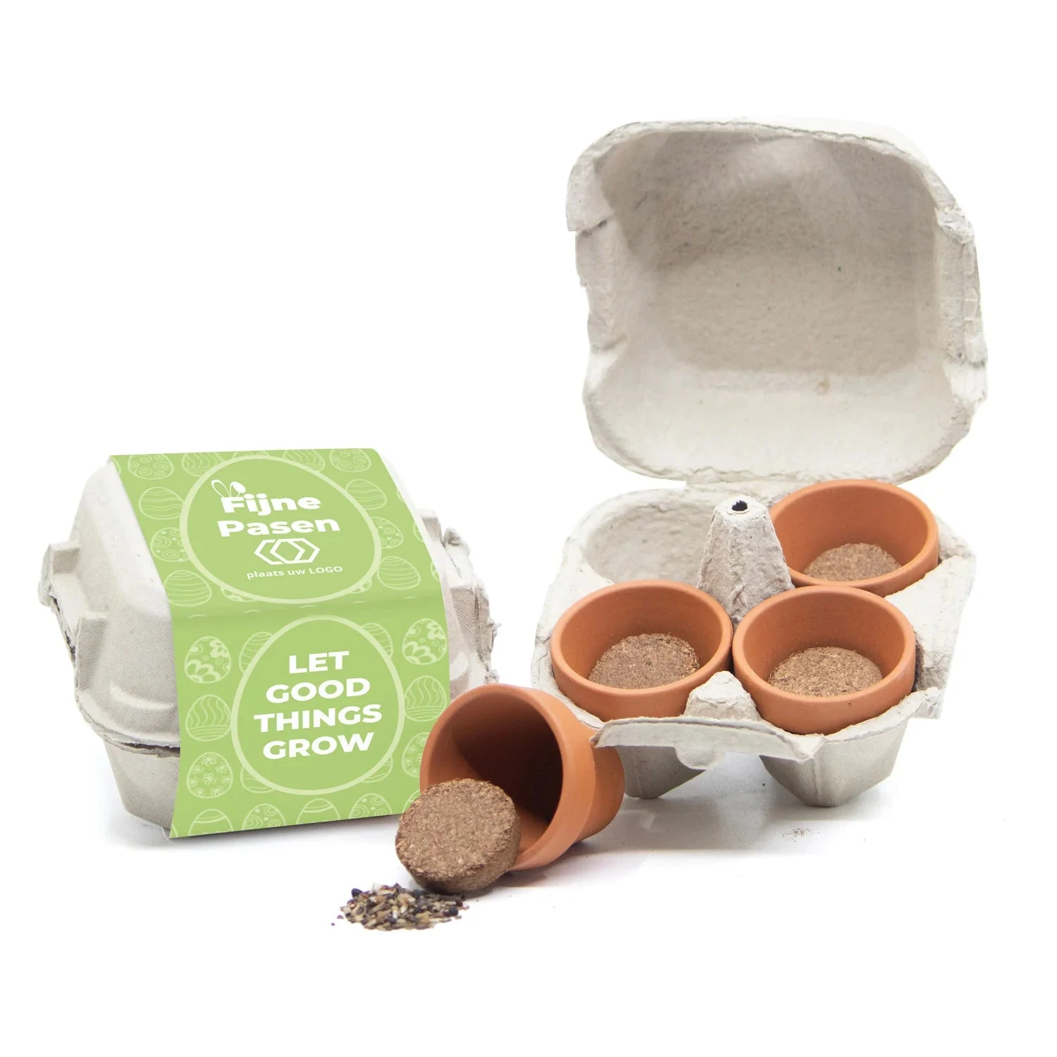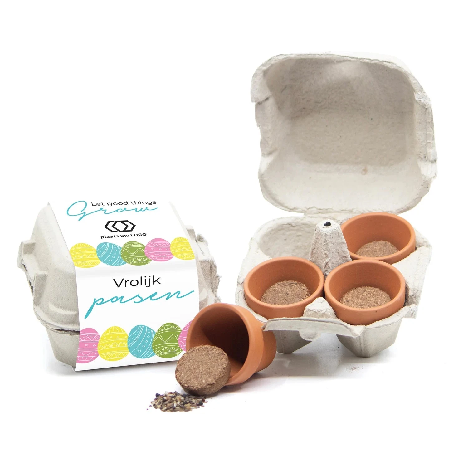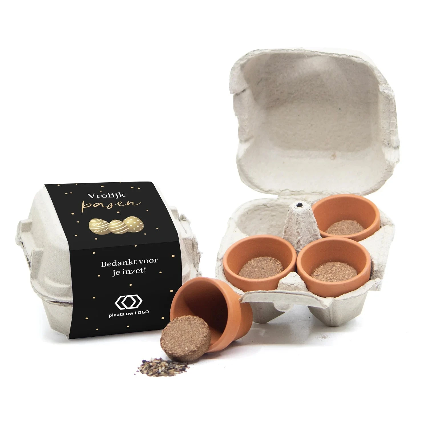 Breng je personeel alvast in de voorjaarsstemming met dit kartonnen eierdoosje gevuld met 4 terracotta bloempotjes, gemengde bloemenzaadjs en een personaliseerbare banderol. Voeg een leuke foto en/of paaswens toe en draag zo ook bij aan een betere flora.