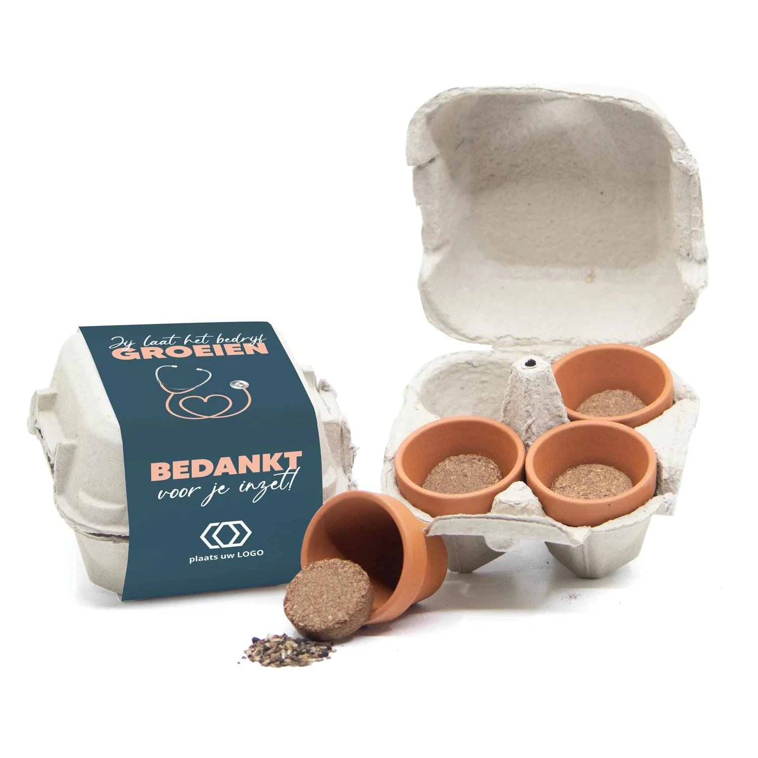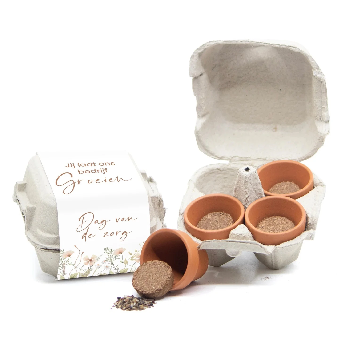 Let good things grow! Zet alle zorgmedewerkers in het zonnetje met dit kartonnen eierdoosje gevuld met 4 terracotta bloempotjes, gemengde bloemenzaadjs en een personaliseerbare banderol. Voeg een leuke foto en/of persoonlijke boodschap toe en maak van de Dag van de Verpleging een bloemrijk feestje!