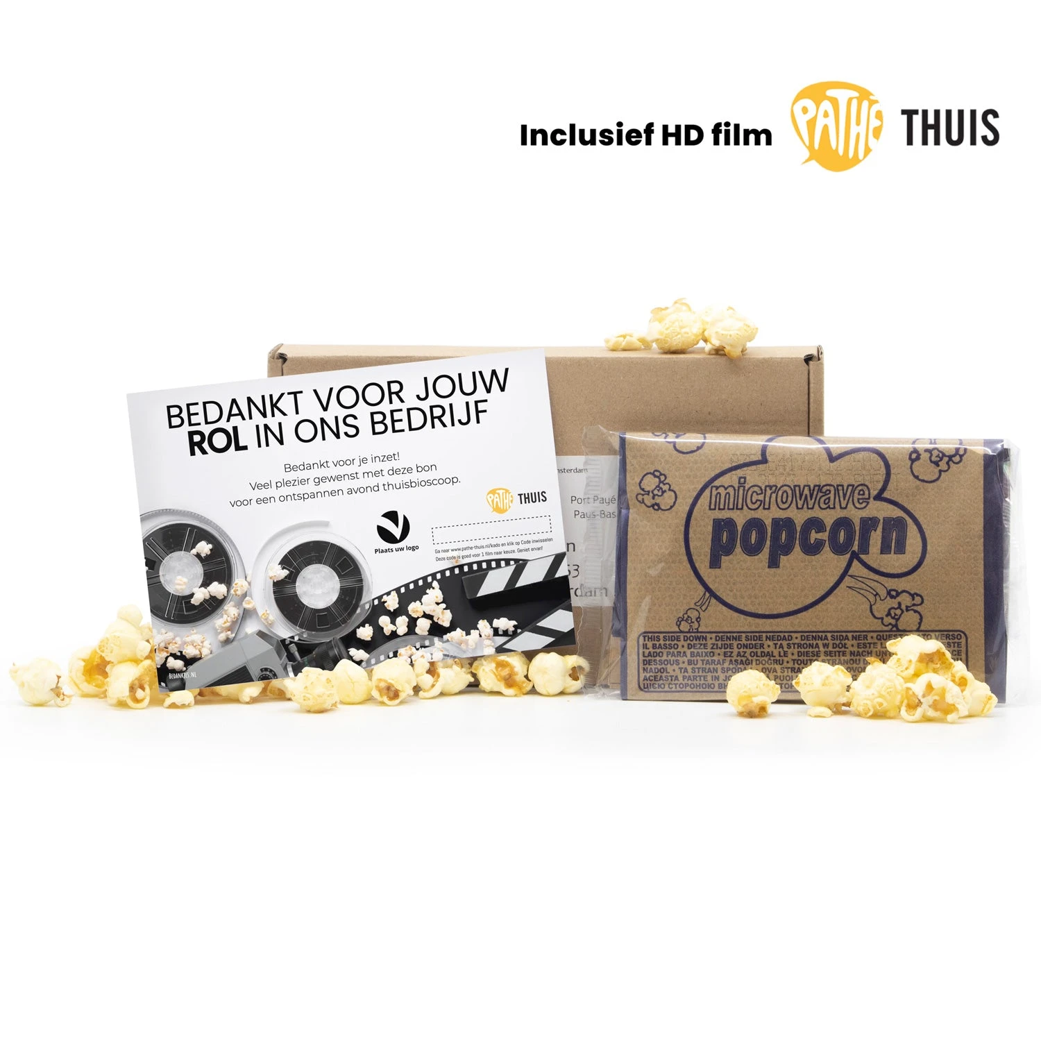 Verstuur een buspakje incl. Pathé Thuis code t.w.v.: € 5,99. Voor een heerlijk avondje thuisbioscoop. Even chillen na een hectische periode. Een pakketje met eigen kaart, een Pathé Thuis code voor het bekijken van 1 HD film (of 2) en een zakje Jimmy’s magnetron popcorn.