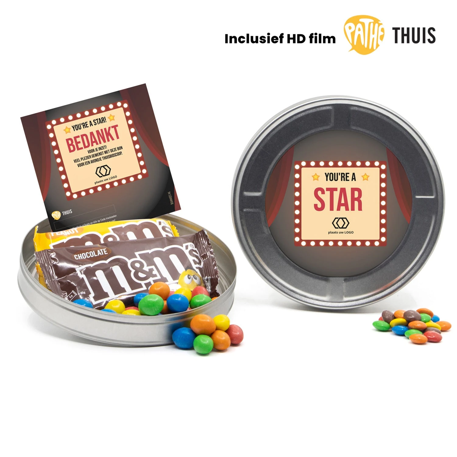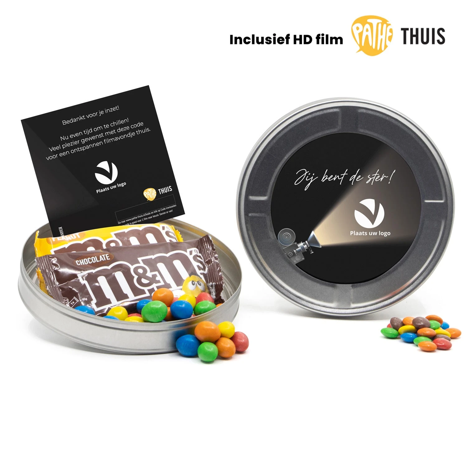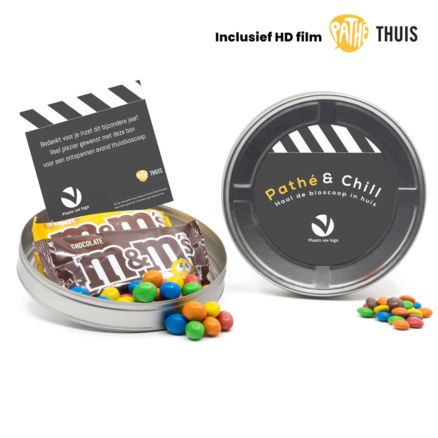 Een compleet pakketje voor een filmavondje thuis met 1 of 2 zakjes m&m’s, een persoonlijk etiket op het blik en een kaart met eigen tekst inclusief een Pathé Thuis vouchercode voor het bekijken van 1 of 2 HD films t.w.v. €5.99 per film.
