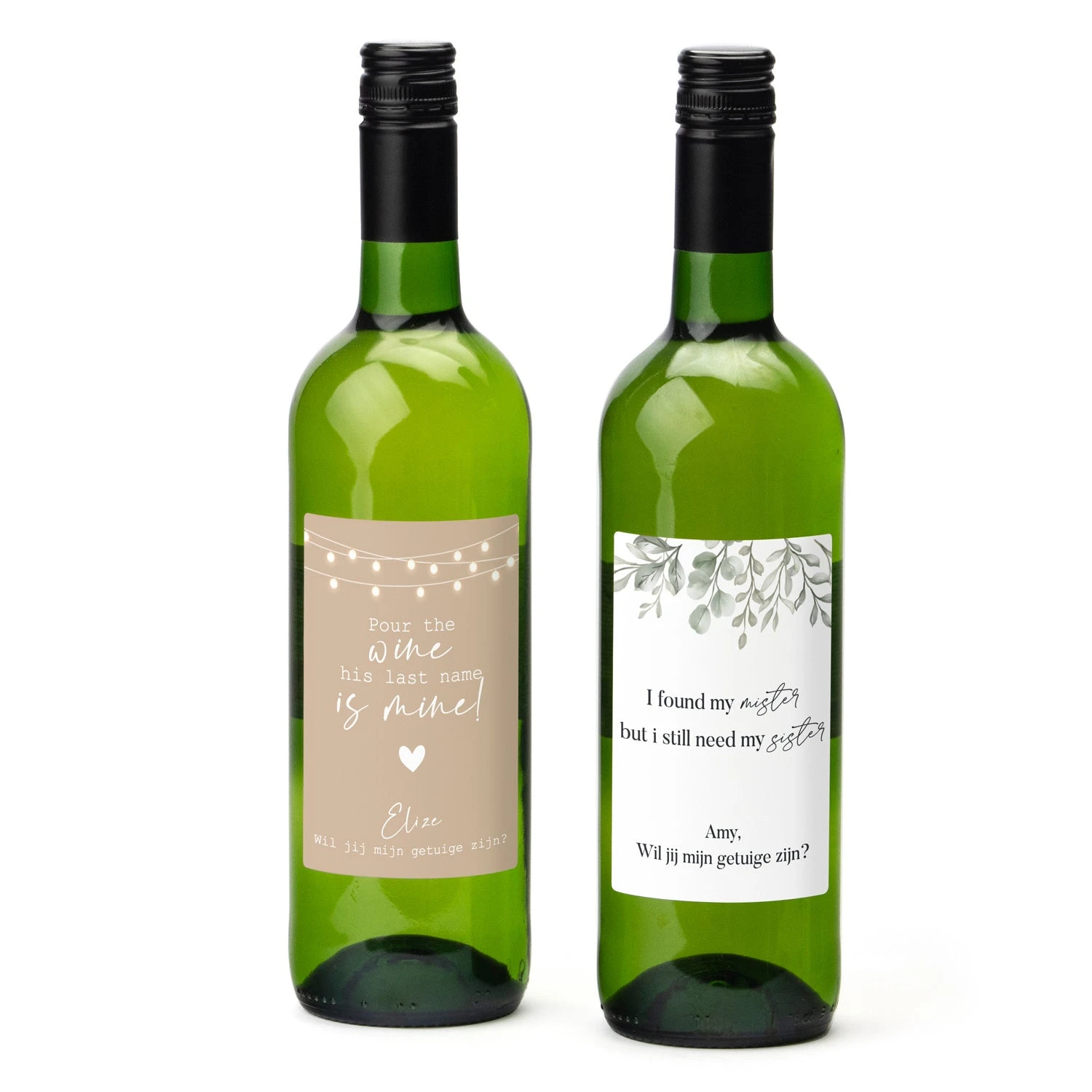 Een witte wijn met jouw eigen etiket om jouw getuige te vragen Deze fles Chardonnay is een leuk en persoonlijk bedankje voor de speciale gasten op jullie bruiloft.
