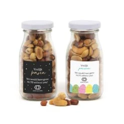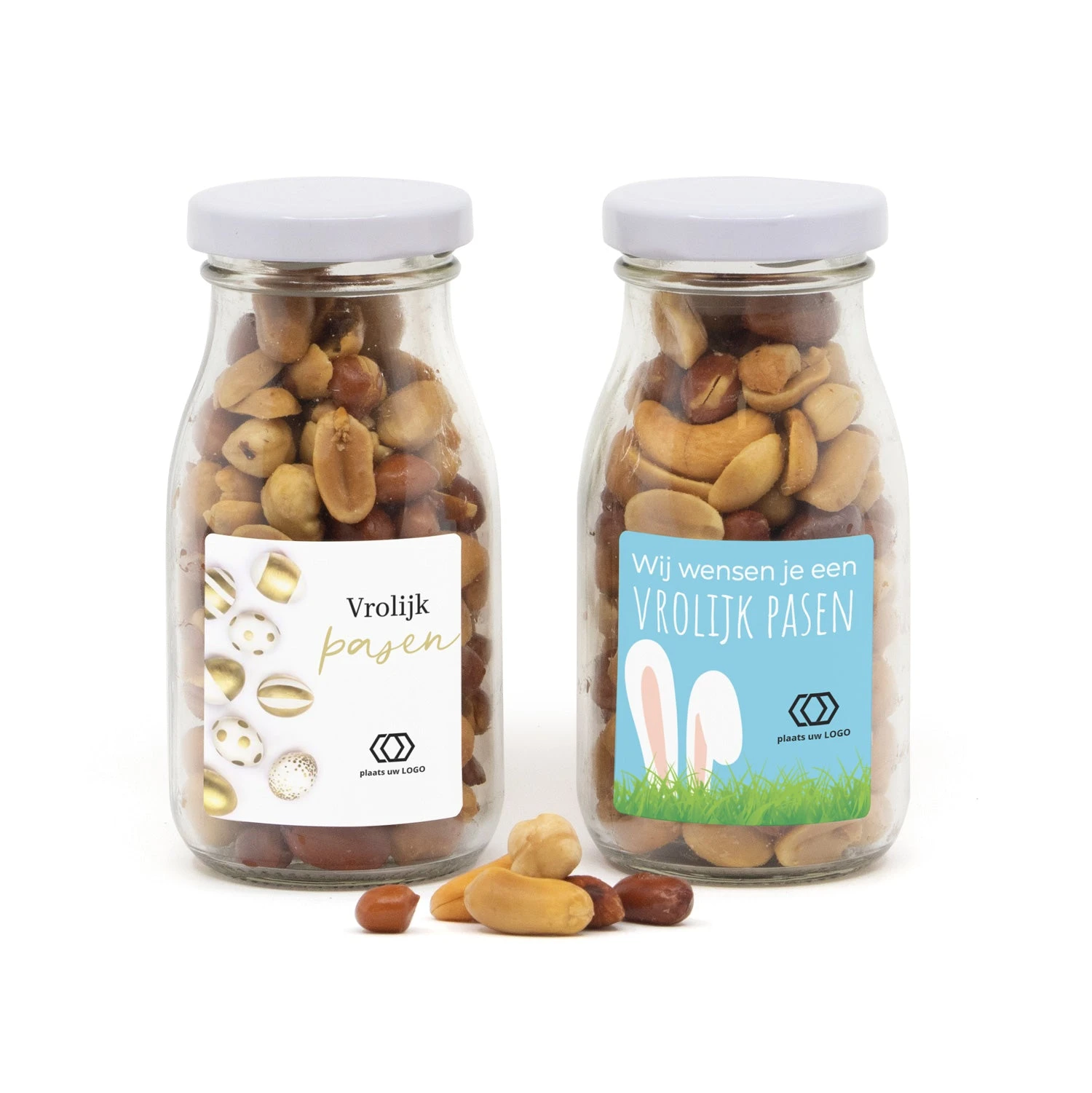 We would have gone NUTS without you! Dit glazen “melkflesje” met verse notenmix voorzien we van een eigen paasetiket. Dit etiket ontwerp je gemakkelijk via onze online ontwerptool. Zet je eigen tekst en/of logo op het etiket.