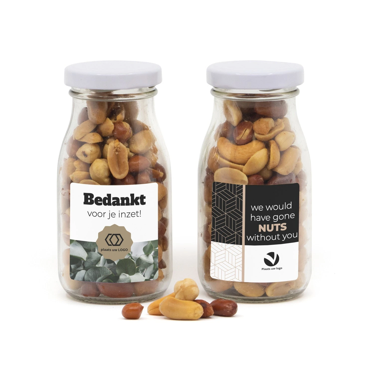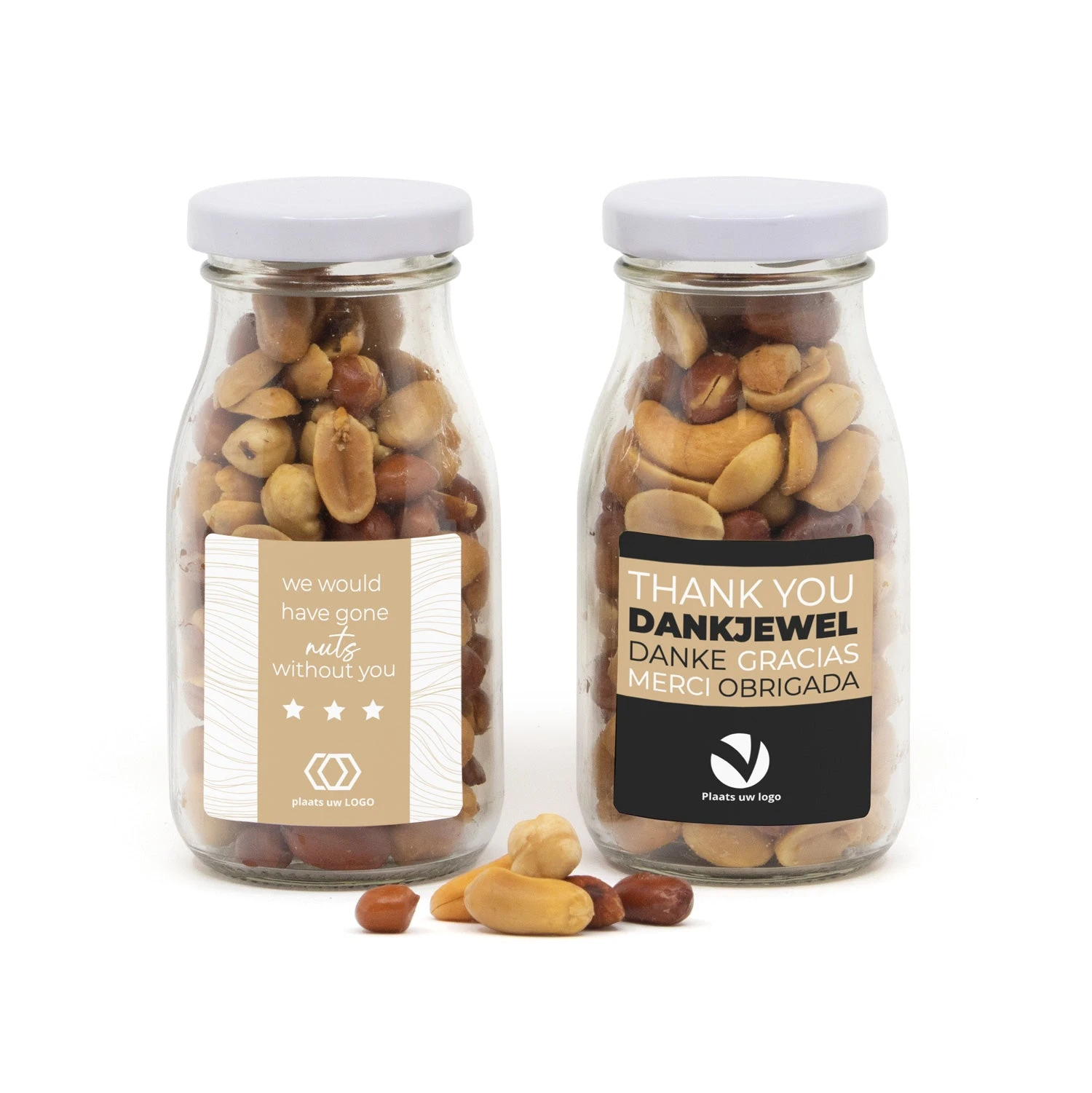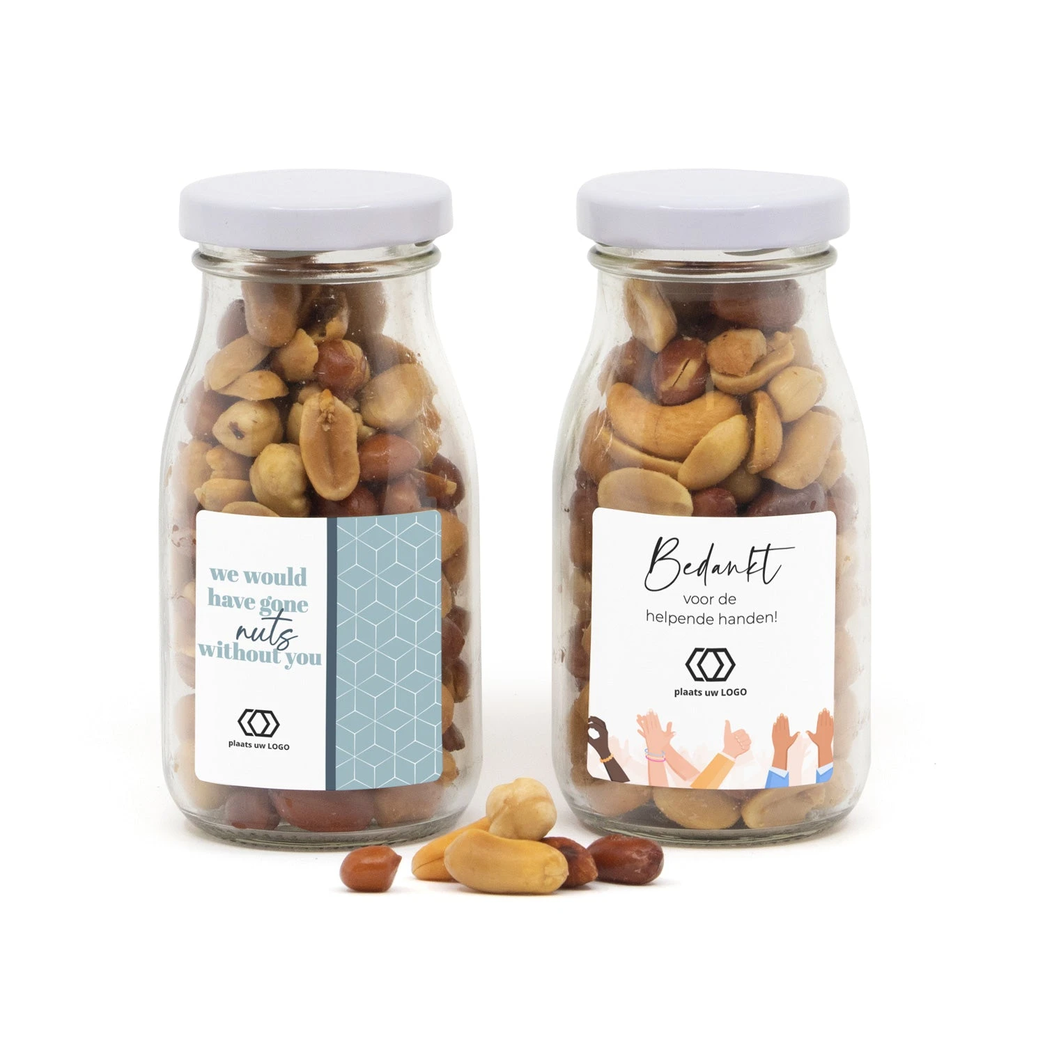 Genoten van de samenwerking?! Dit glazen “melkflesje” met verse nootjes voorzien van een eigen etiket is dan een leuk bedankje om weg te geven. Dit etiket ontwerp je gemakkelijk via onze online ontwerptool. Zet je eigen tekst en/of logo op het etiket.