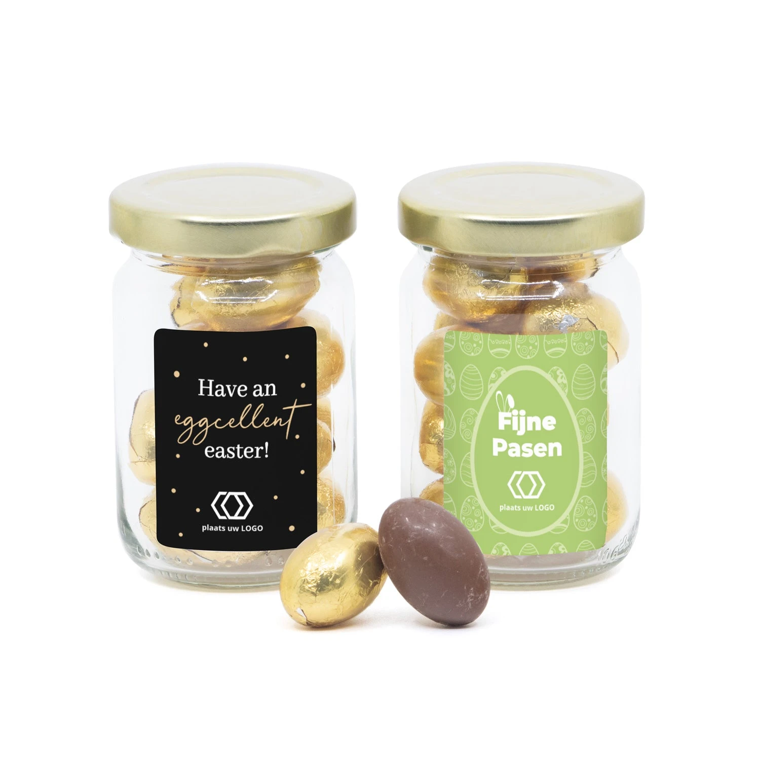 Een betaalbaar maar persoonlijk paasbedankje voor klanten of personeel. Een glazen potje met 70 gram melkchocolade paaseitjes. Wij leveren de potjes met een persoonlijk etiket die je zelf kunt opmaken in onze online ontwerptool.