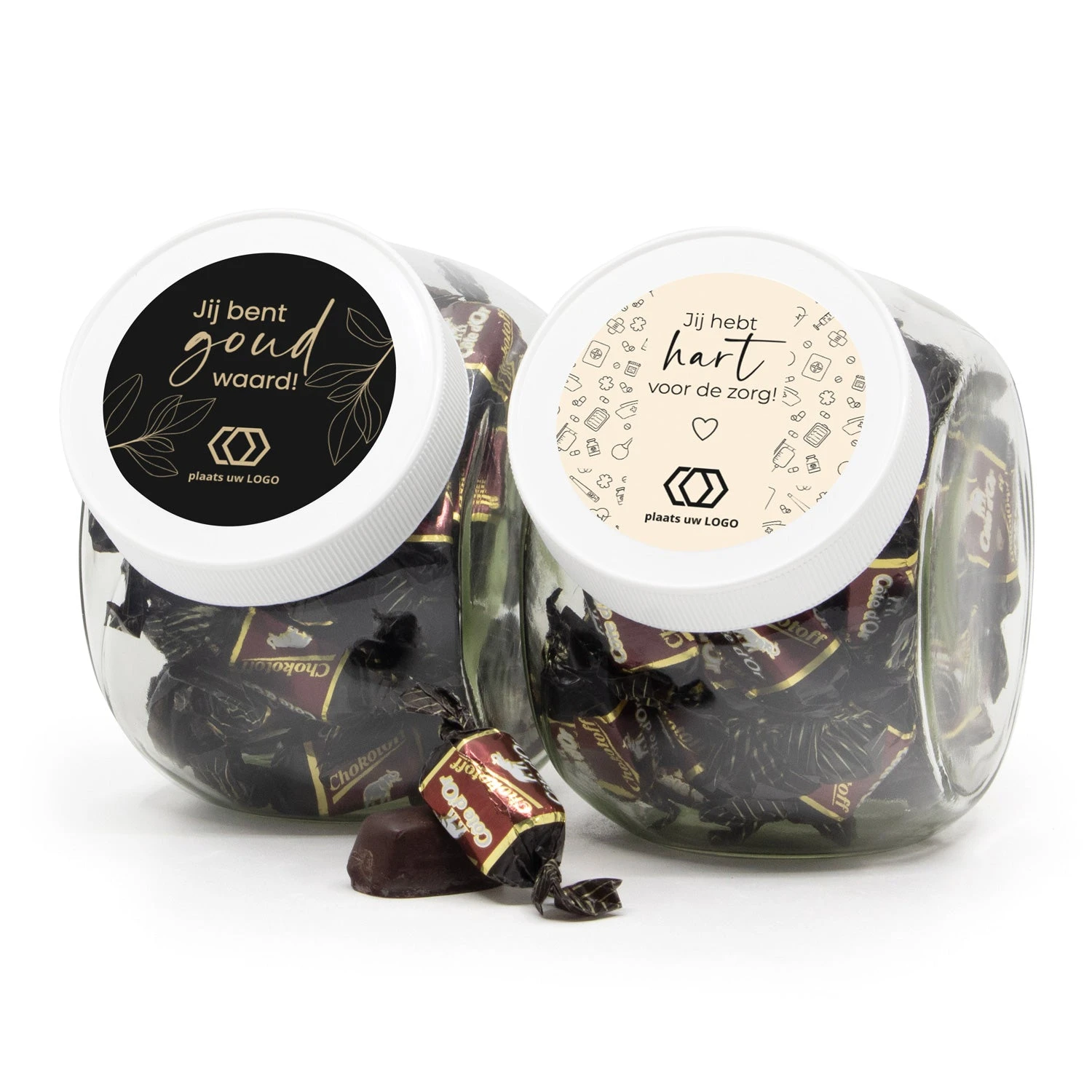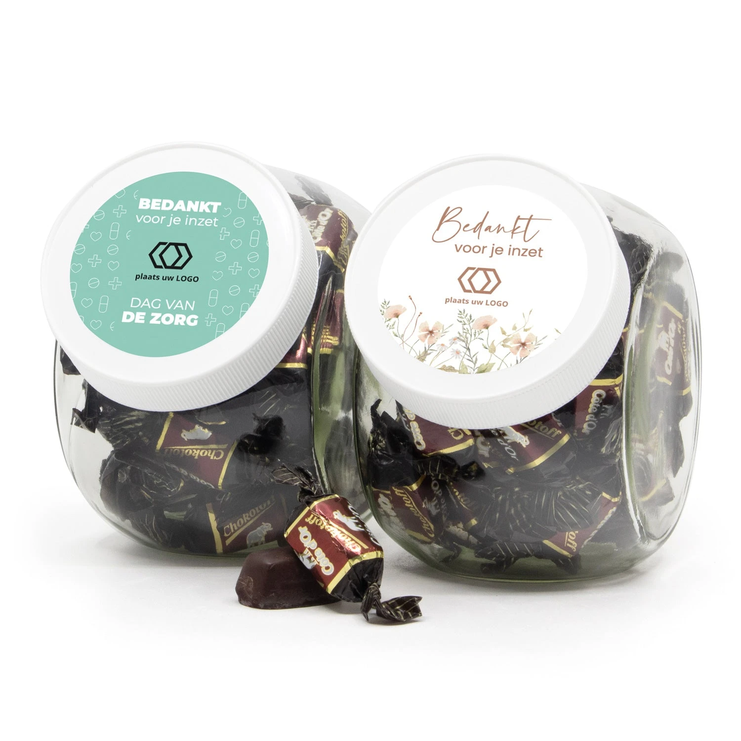 Een mooi bedankje voor de dag van de verpleging. Een glazen snoeppot met een persoonlijk etiket op het deksel en een heerlijke vulling naar keuze. Maak het ontwerp eenvoudig persoonlijk via onze online ontwerptool.