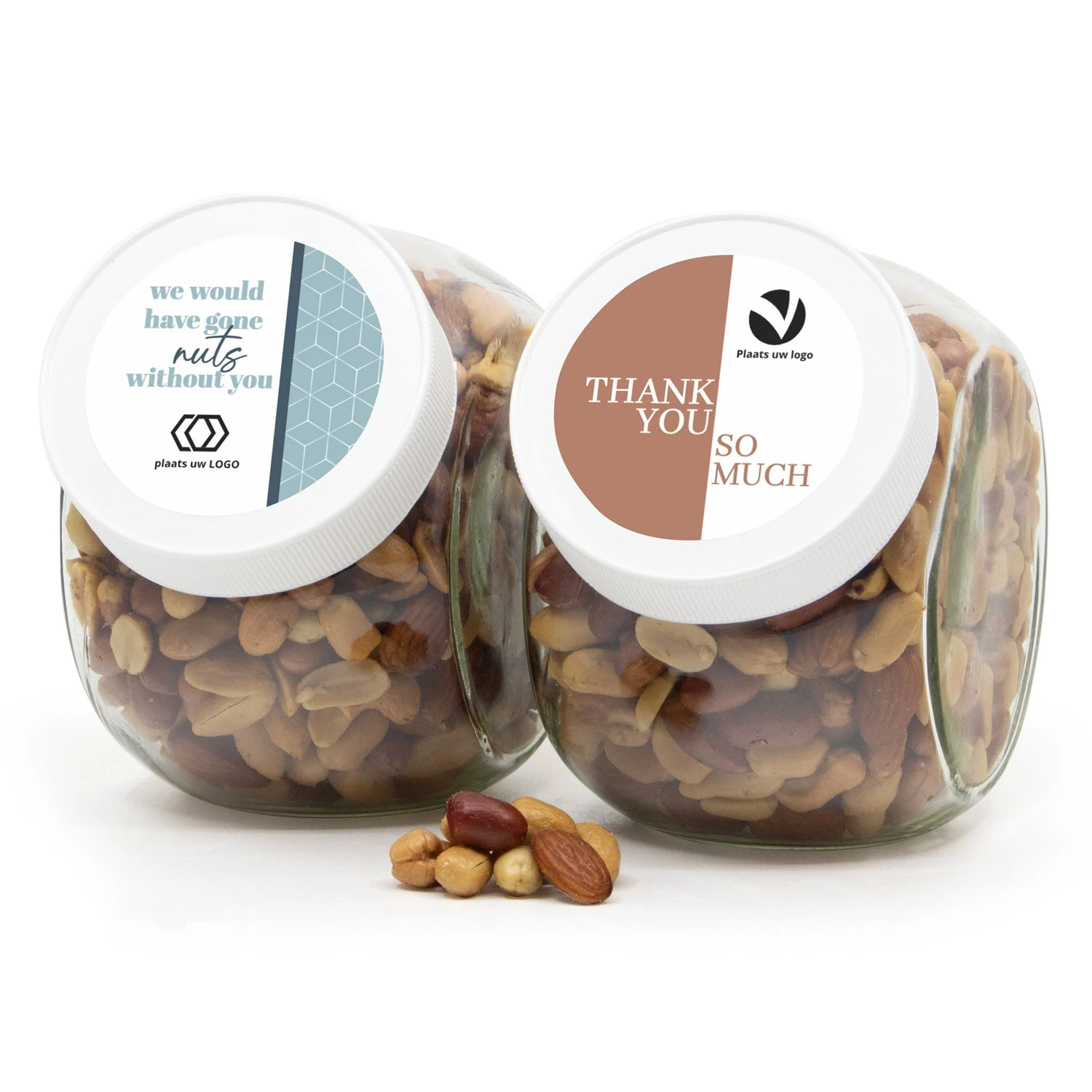 Een blijvend geschenk, deze glazen snoeppot van 0,9 liter met een persoonlijk etiket op het deksel. Deze snoeppot is gevuld met 500 gram verse(!) notenmix. Zet jouw eigen tekst en/of logo op het etiket dmv de eenvoudige online ontwerptool.