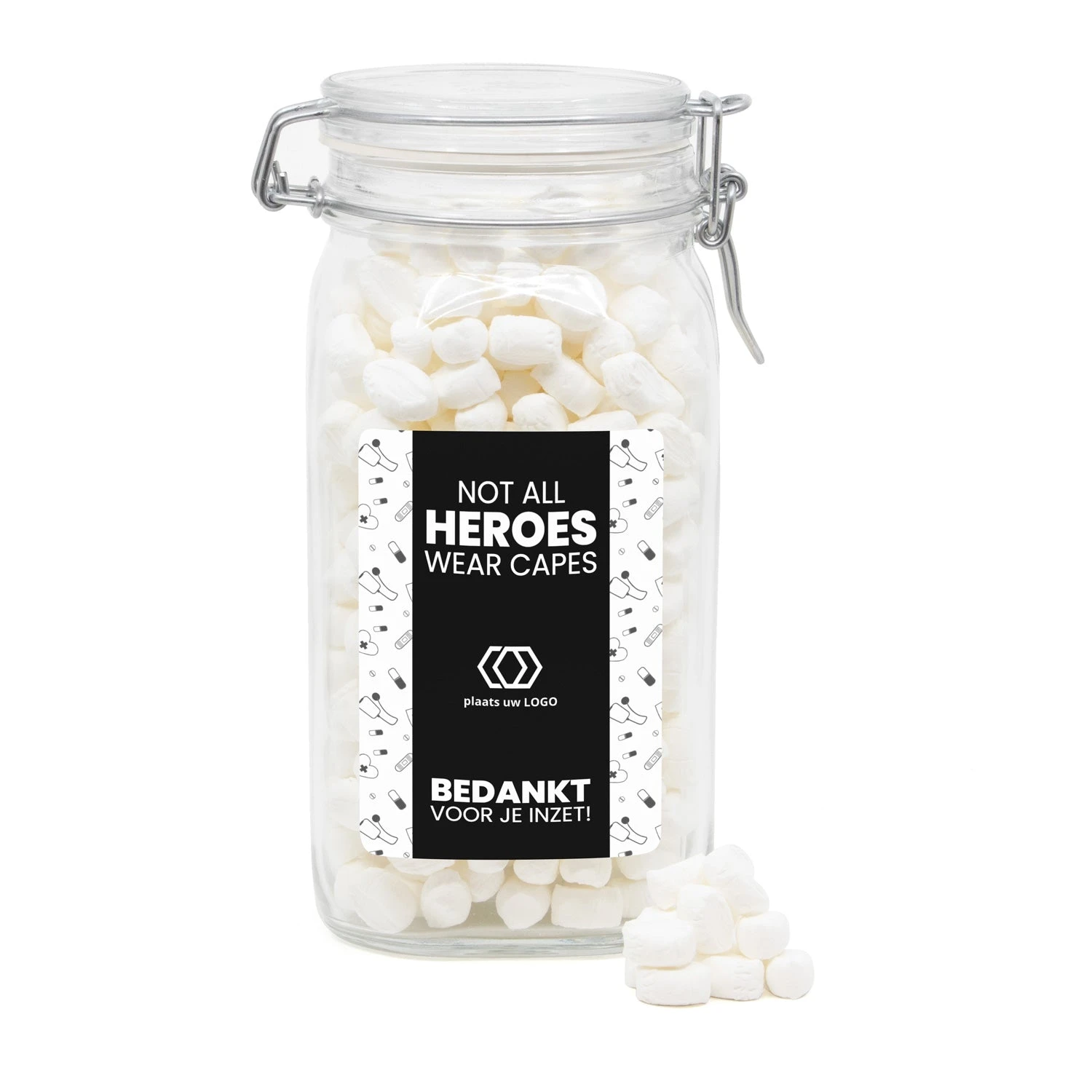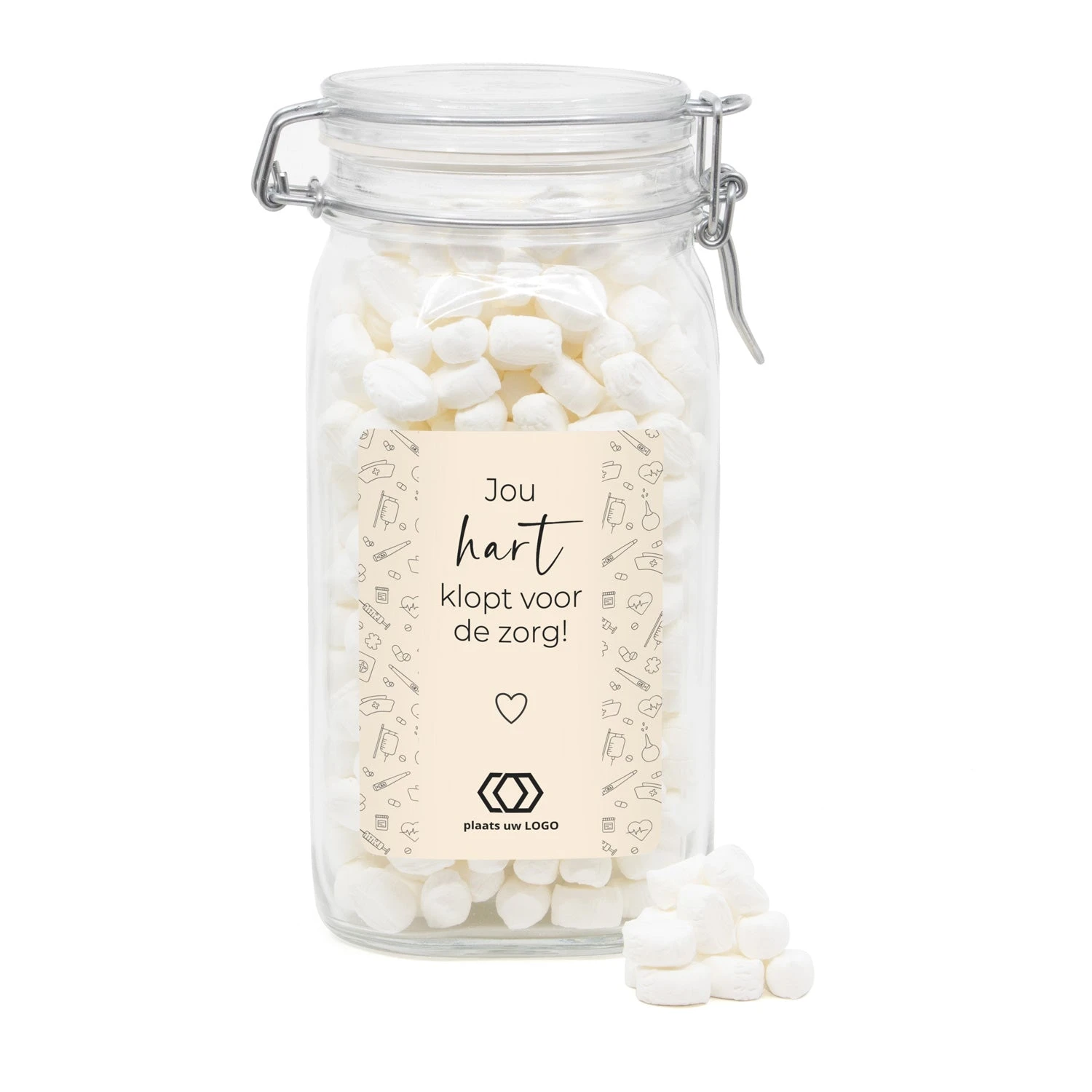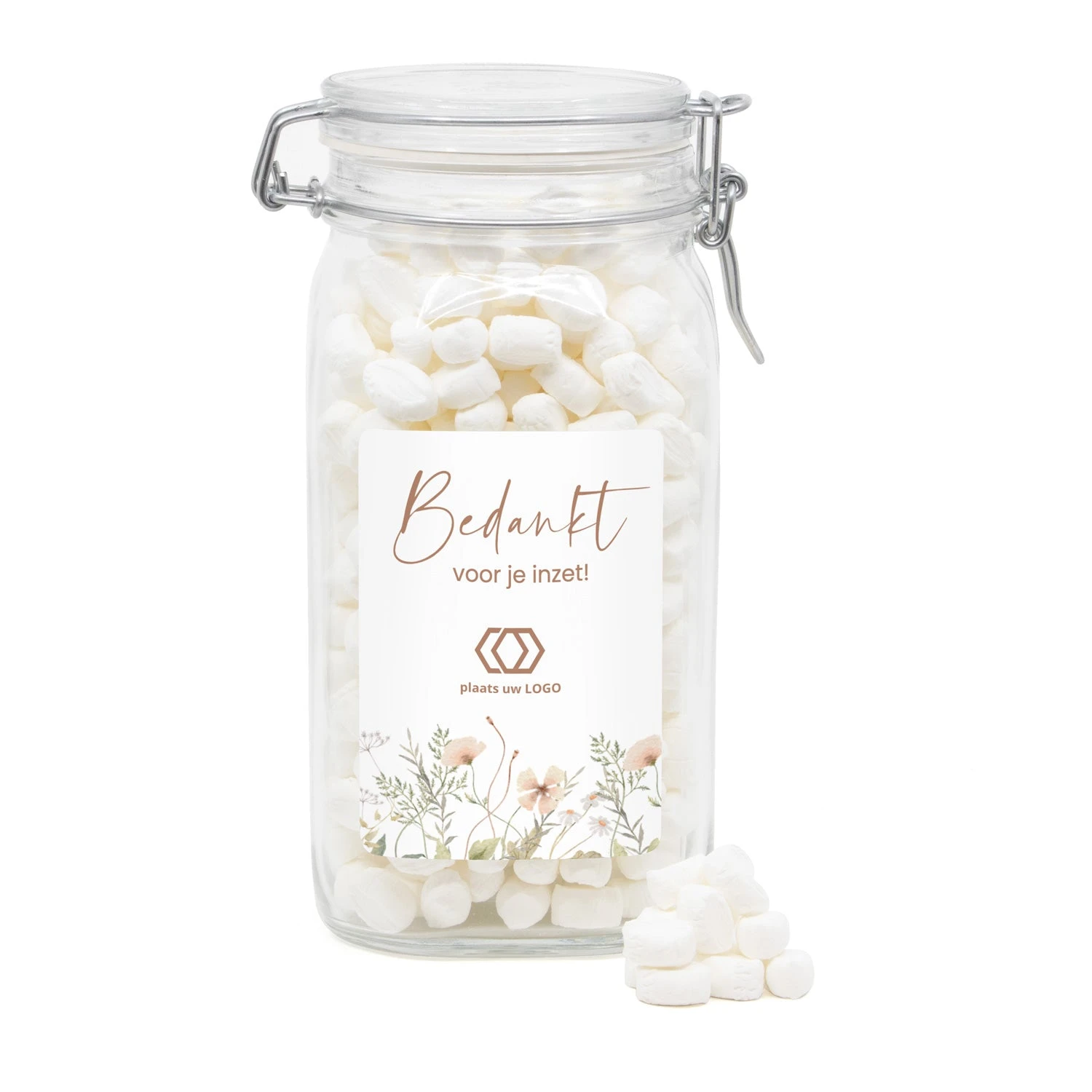 Kies voor deze mooie glazen pot met beugelsluiting en vulling naar keuze. Voeg nog een leuke tekst en/of foto toe aan het etiket en laat jouw waardering op een originele en persoonlijke manier blijken.Â