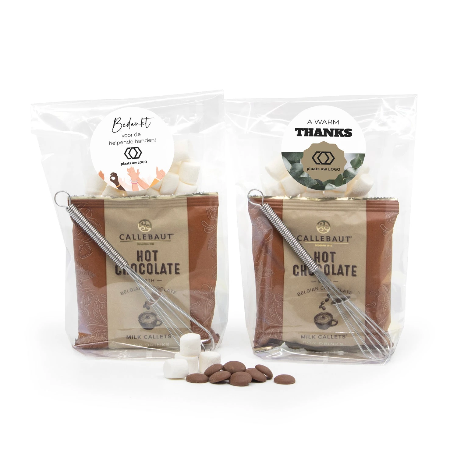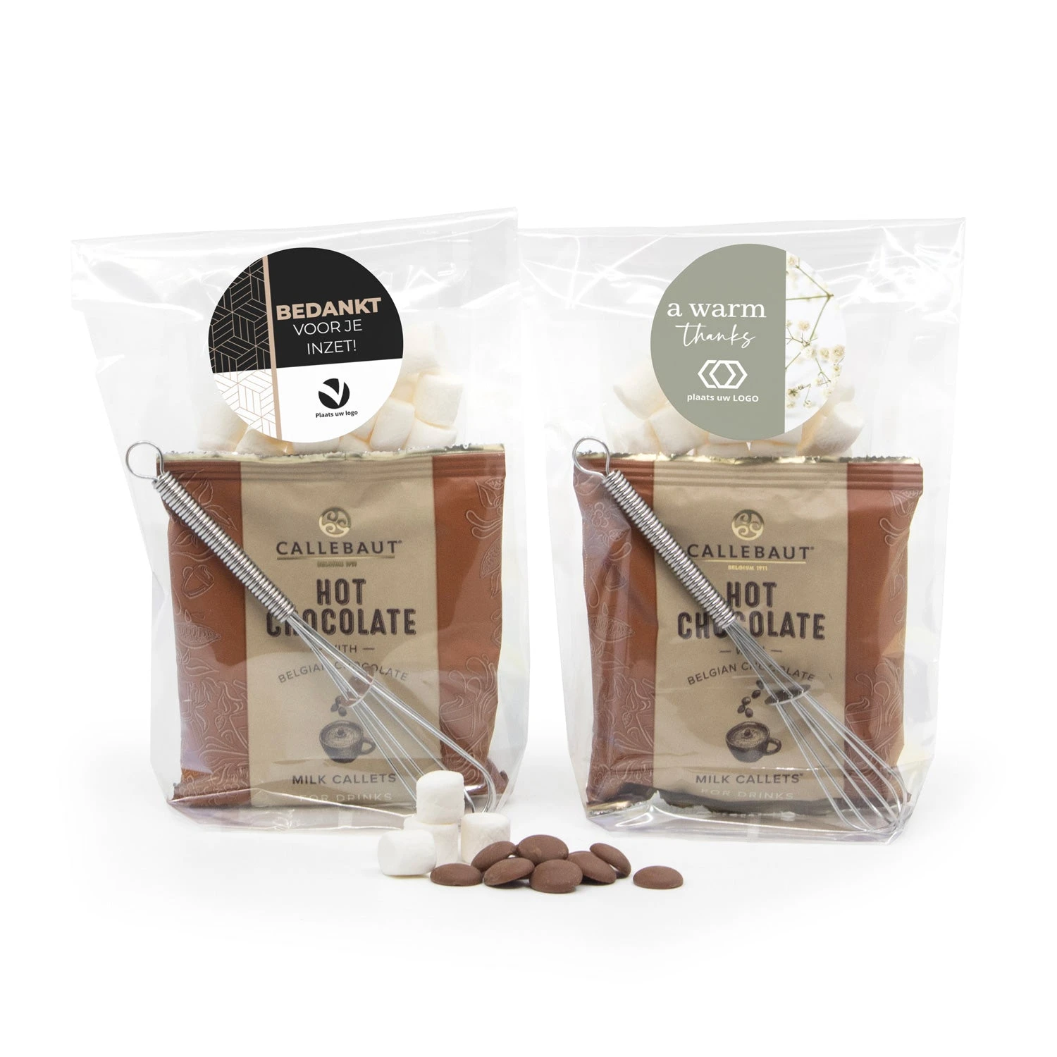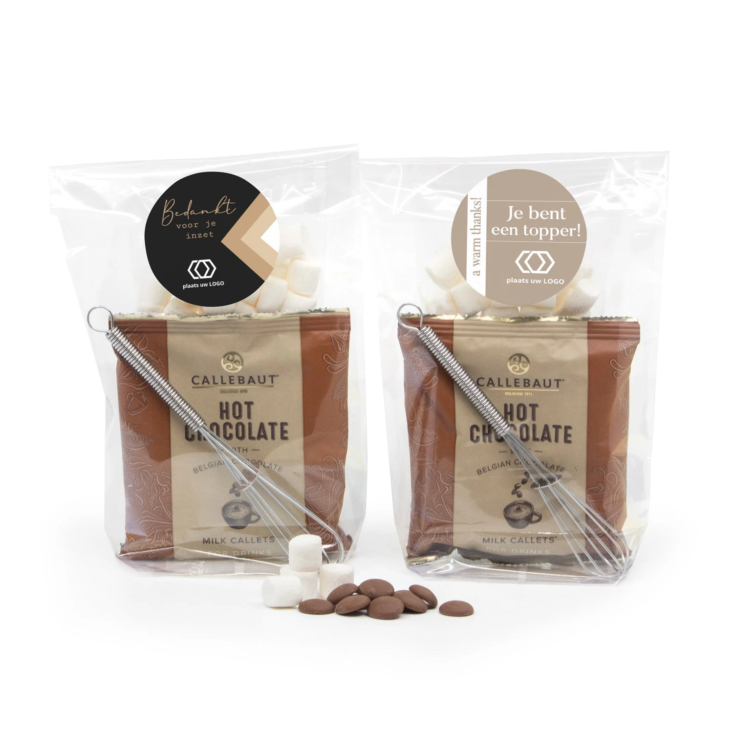 Dit leuke verwenpakketje is voor een heerlijk warm genietmoment voor je collega’s of relaties. Het zakje is gevuld met 1 zakje Callebaut chocoladedruppels die je door de warme melk kunt roeren voor een heerlijke kop verse chocolademelk. Samen met een zakje witte mini marshmallows en een kleine garde om het helemaal compleet te maken. Inclusief een persoonlijke etiket die je zelf kunt opmaken.