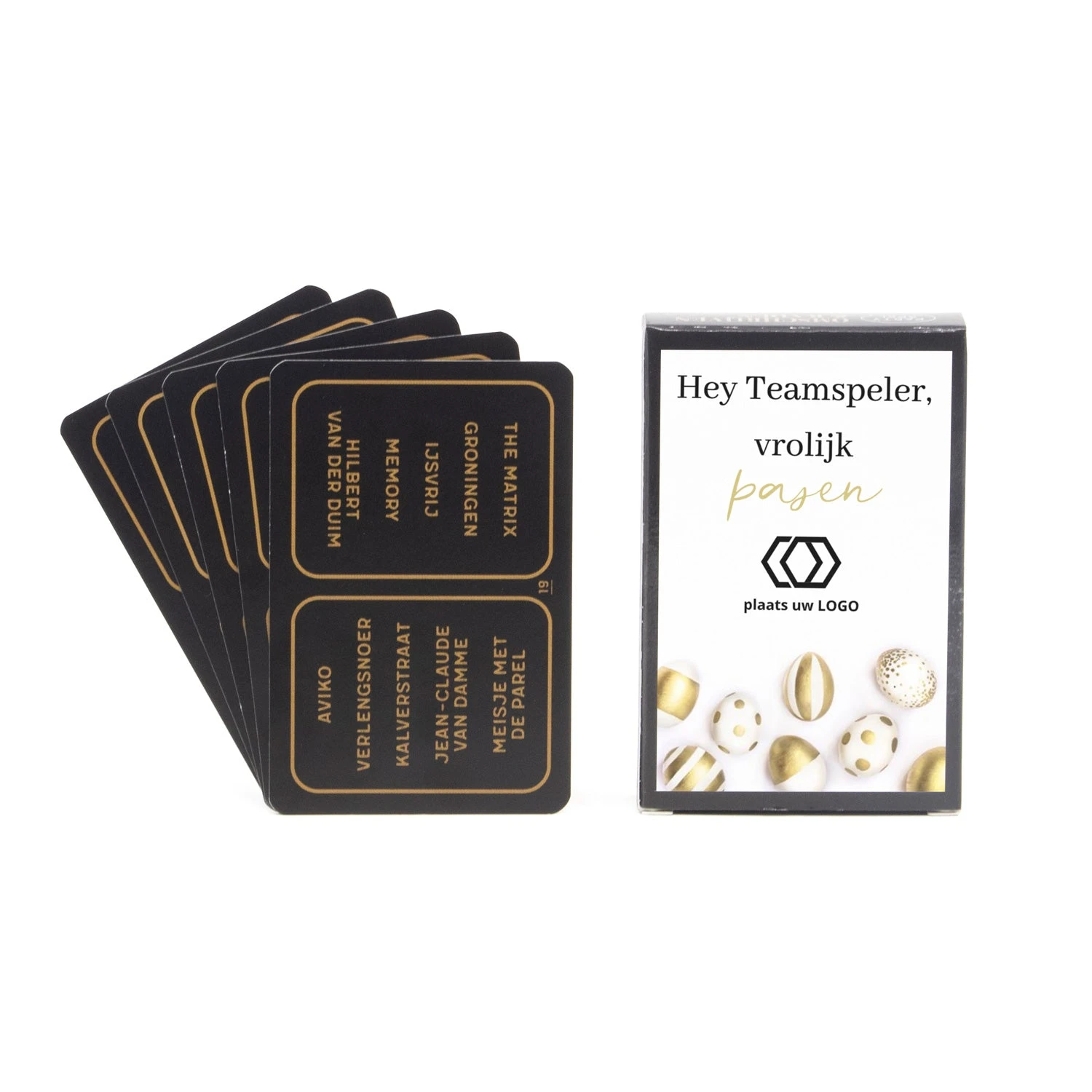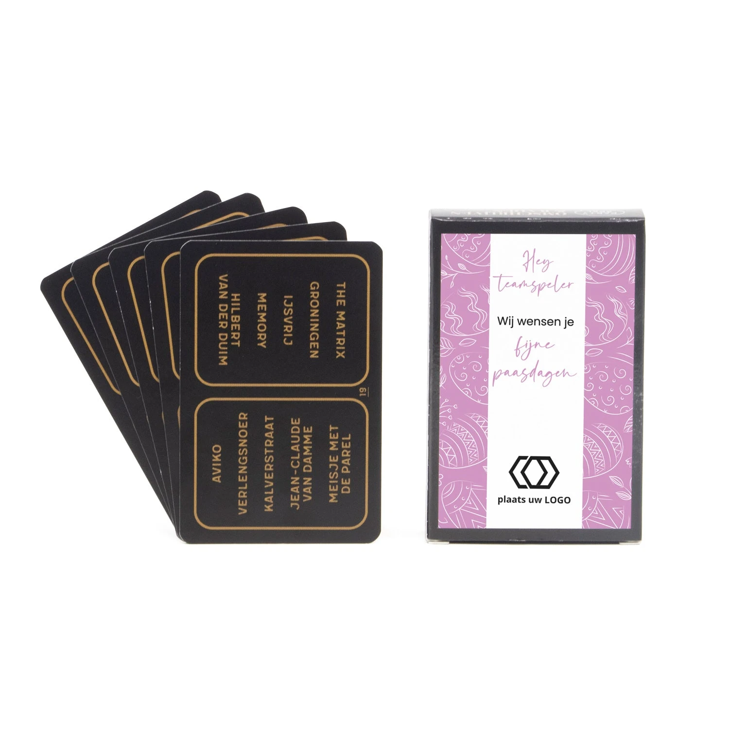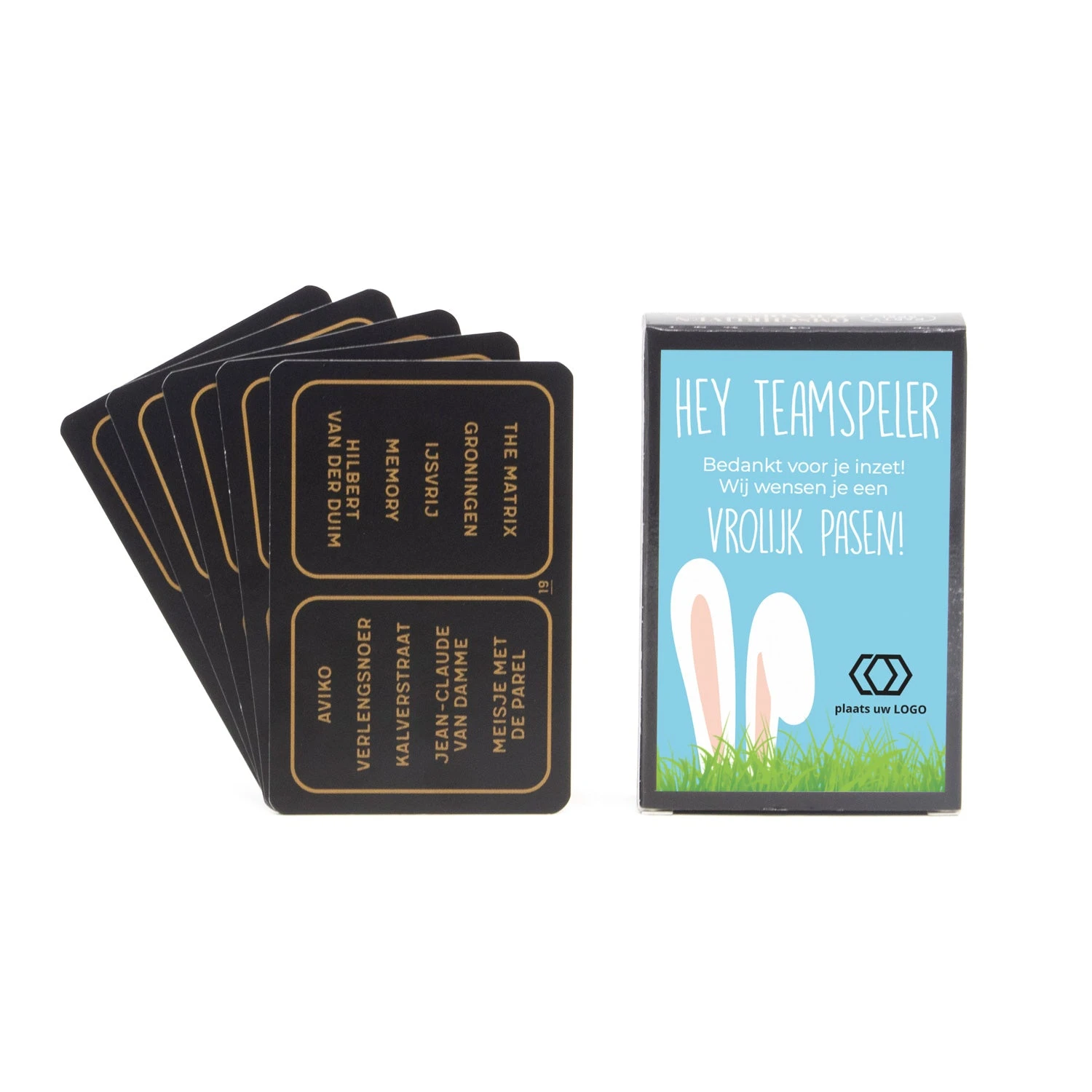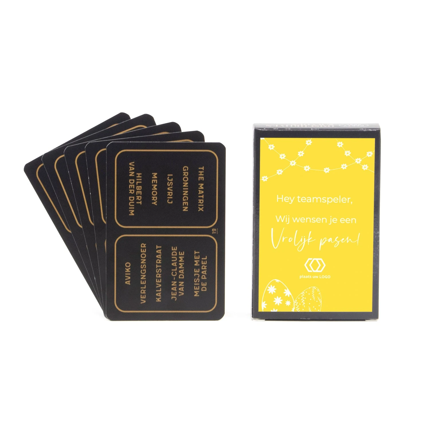 Voor de teamplayers! Een compleet kaartspel met meer dan 1000 begrippen. Laat jouw teamleden zoveel mogelijk woorden raden in 30 seconden! Wij leveren het kaartspel met een eigen etiket die je kunt ontwerpen via onze online ontwerptool. Maak je eigen ontwerp of kies één van onze paas ontwerpen en voeg hier je eigen tekst en/of logo toe. Dat worden gezellige paasdagen!