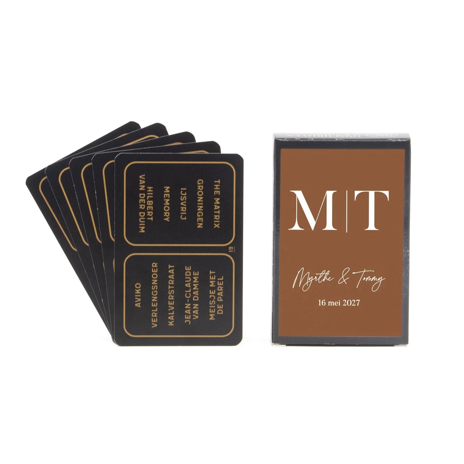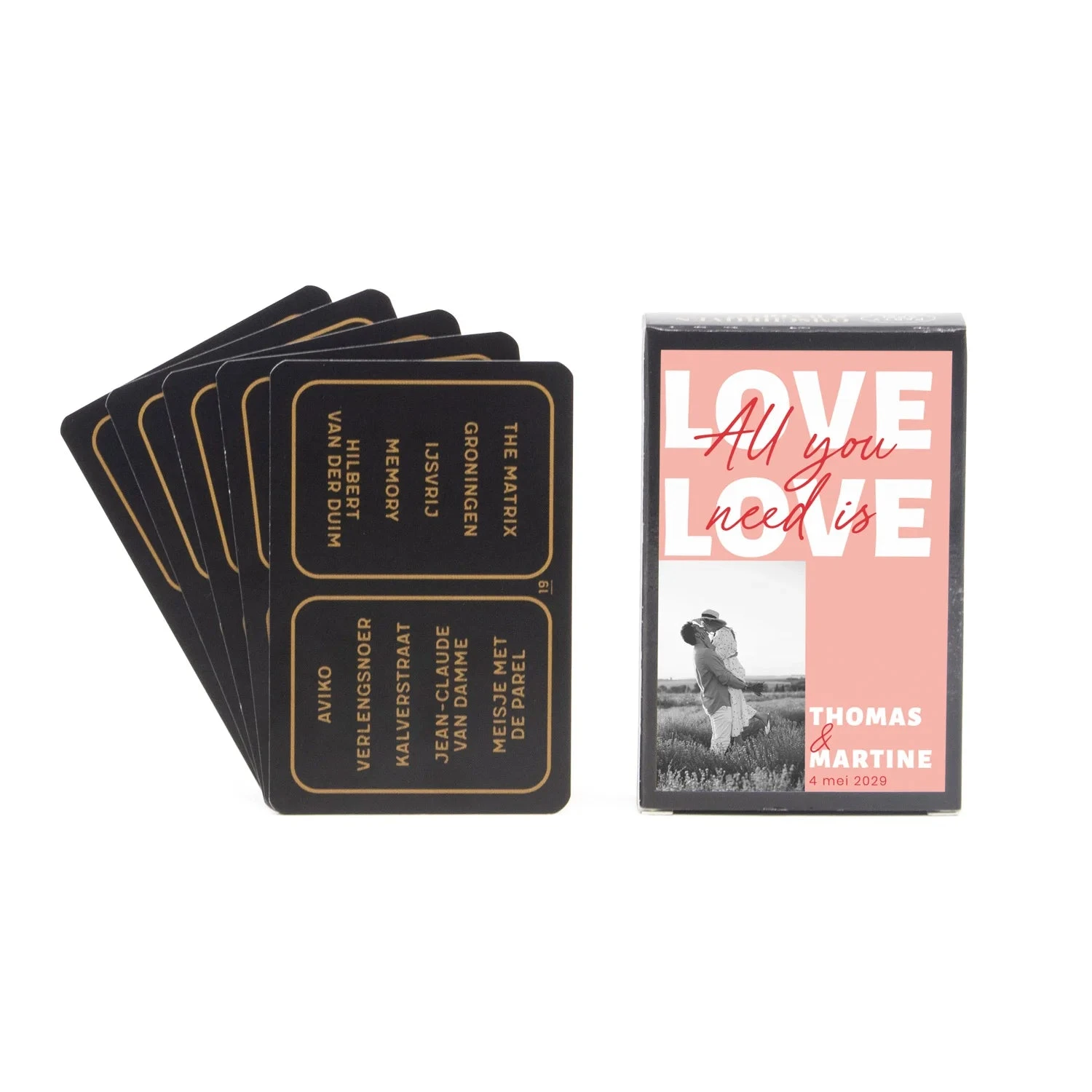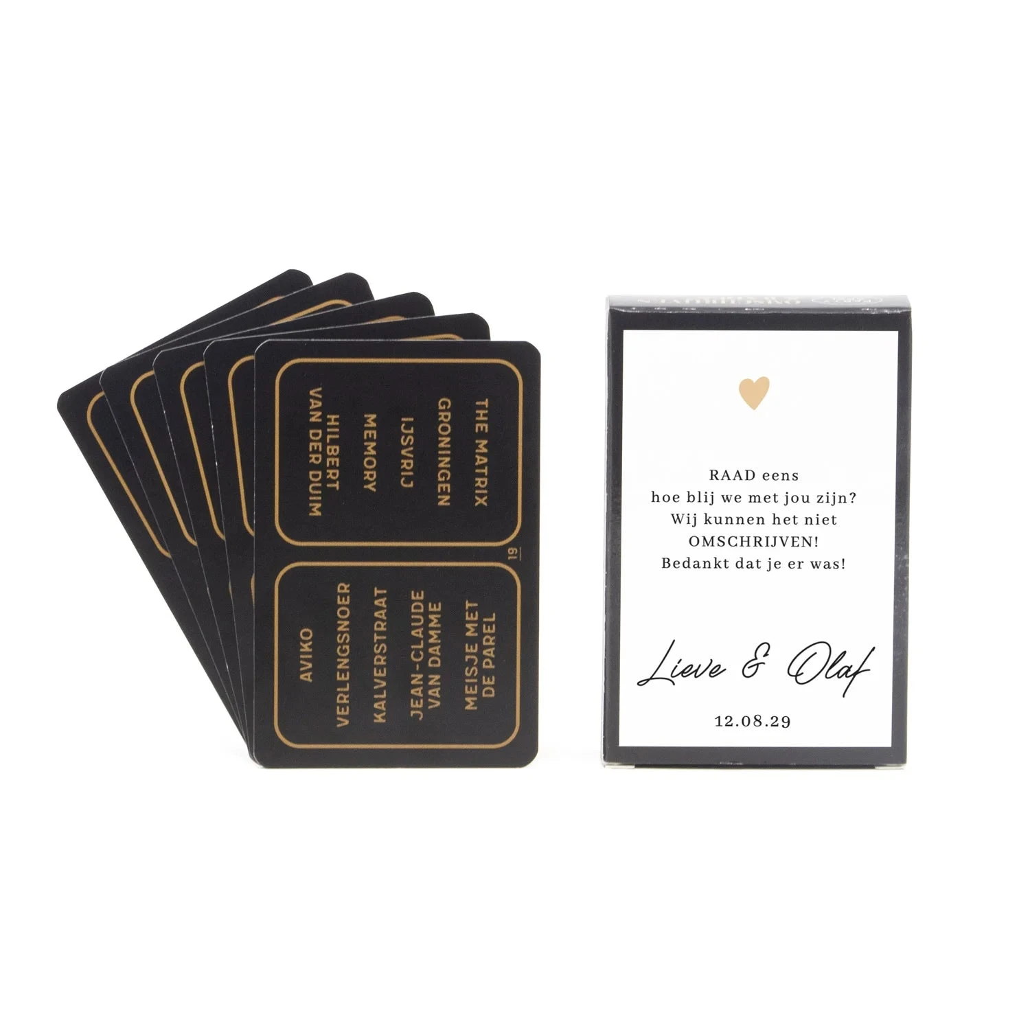 Game of love! Een compleet kaartspel met meer dan 1000 begrippen. Laat jouw gasten zoveel mogelijk woorden raden in 30 seconden! Wij leveren het kaartspel met een eigen etiket die je kunt ontwerpen via onze online ontwerptool. Maak je eigen ontwerp of kies één van onze basisontwerpen en voeg hier je eigen tekst en/of foto toe.Â