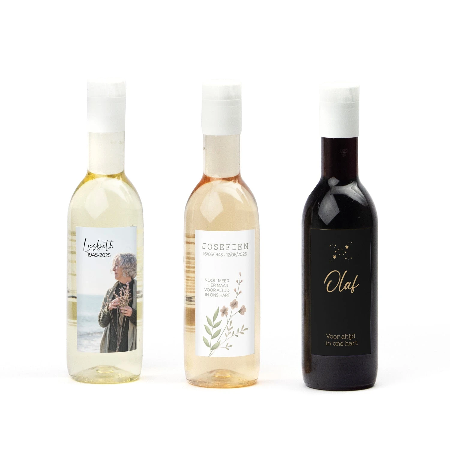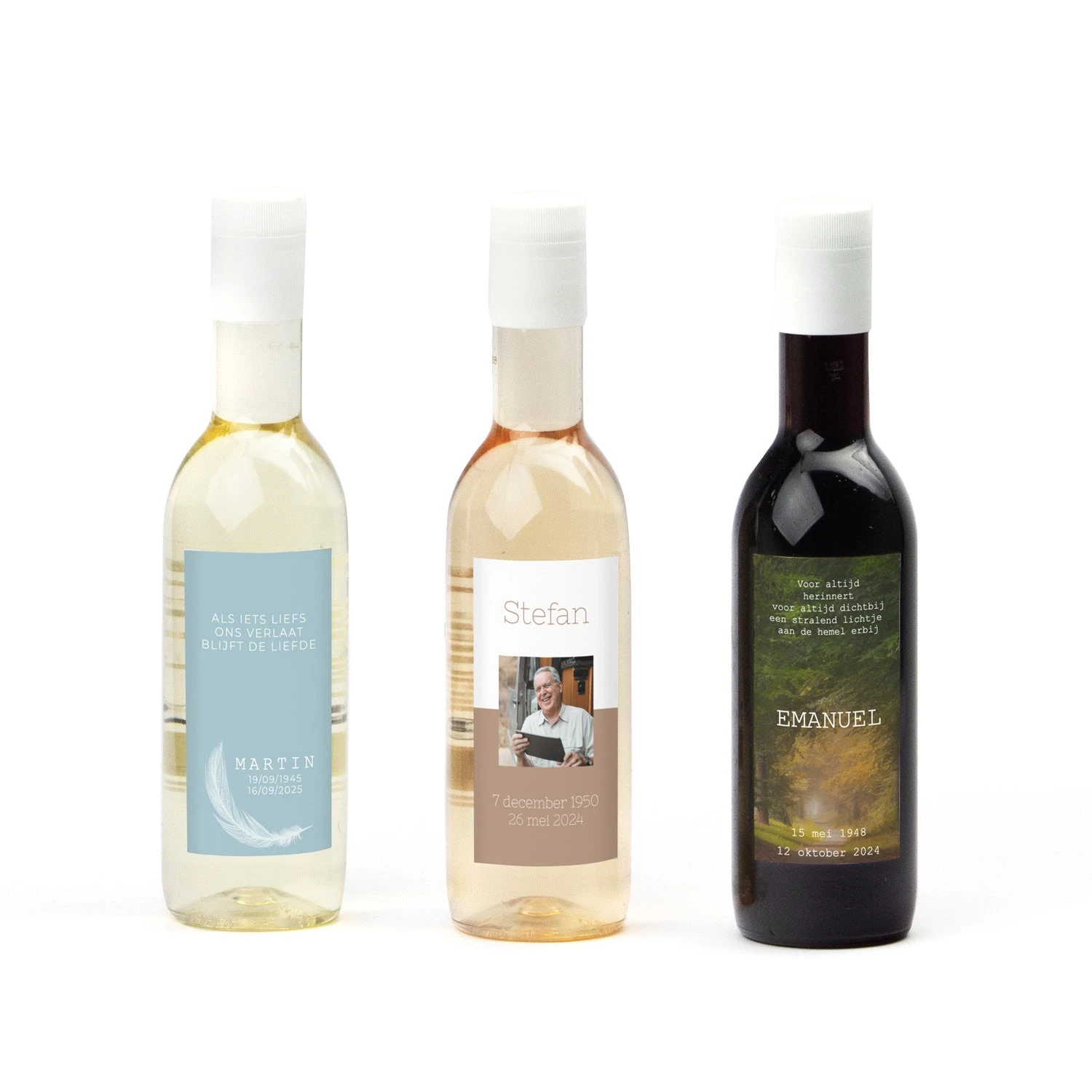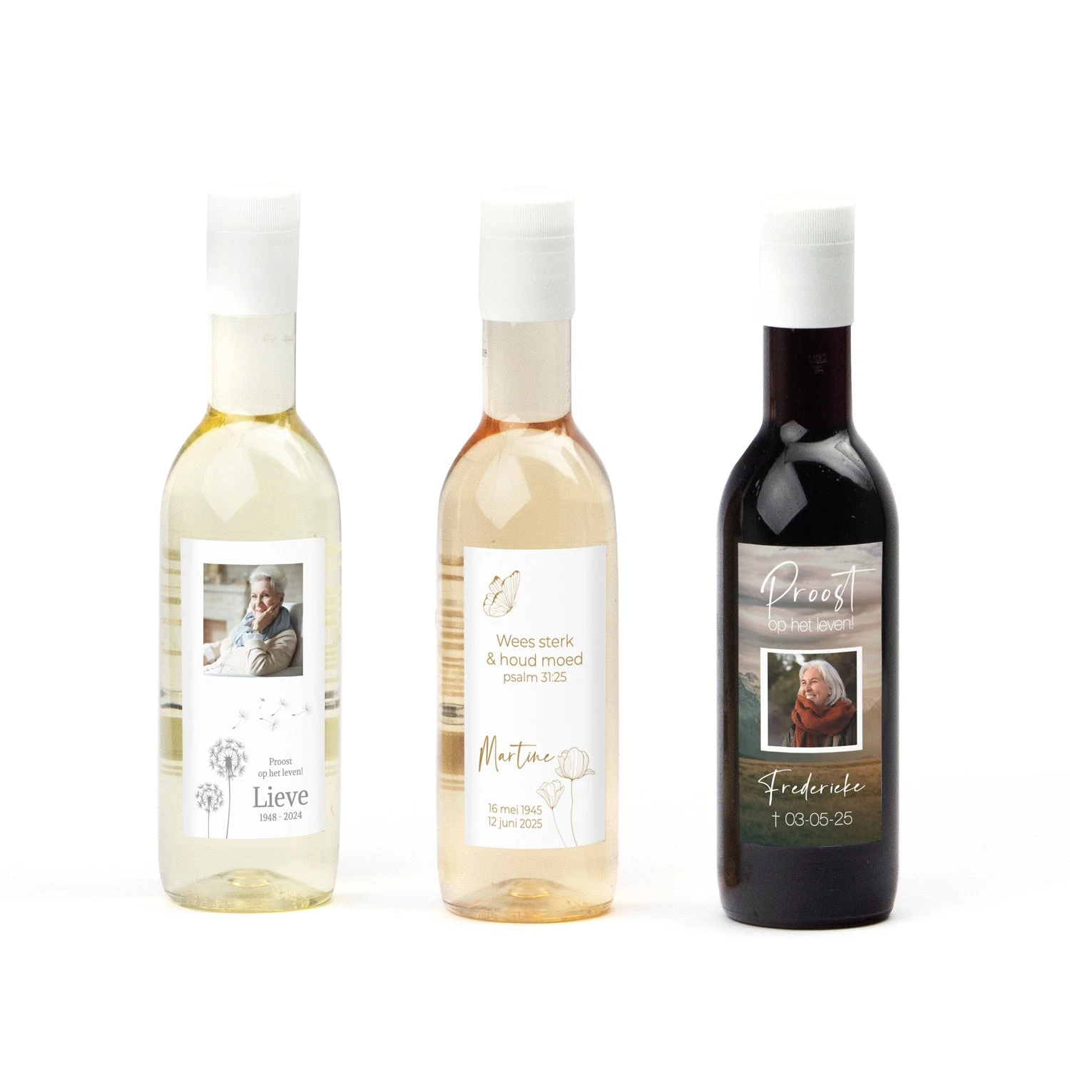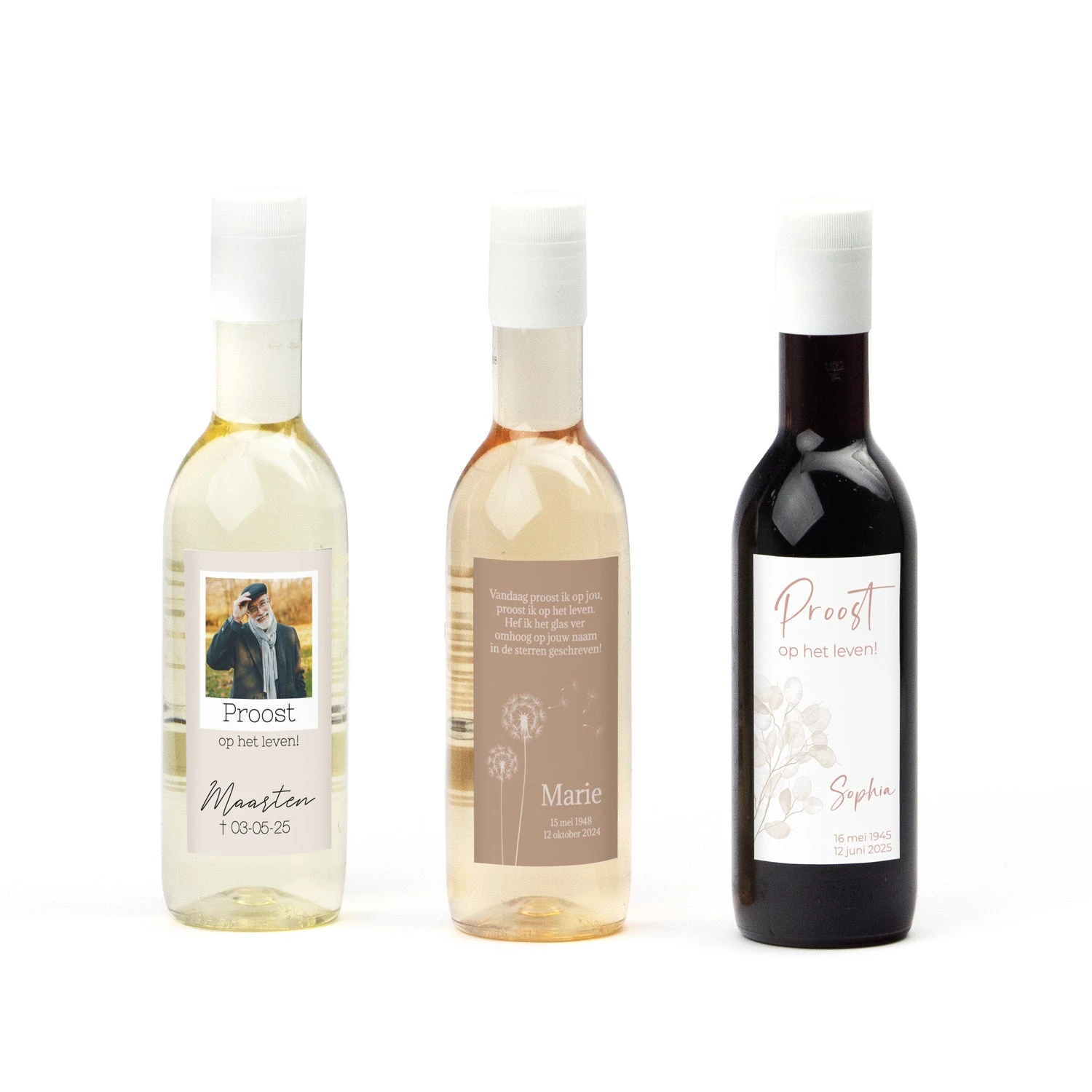 Proost op het leven! een klein kunststof flesje wijn of rosé met een eigen foto en/of tekst op het etiket. Je kunt kiezen uit witte wijn (Sauvignon Blanc), rode wijn (merlot) of Rosé.