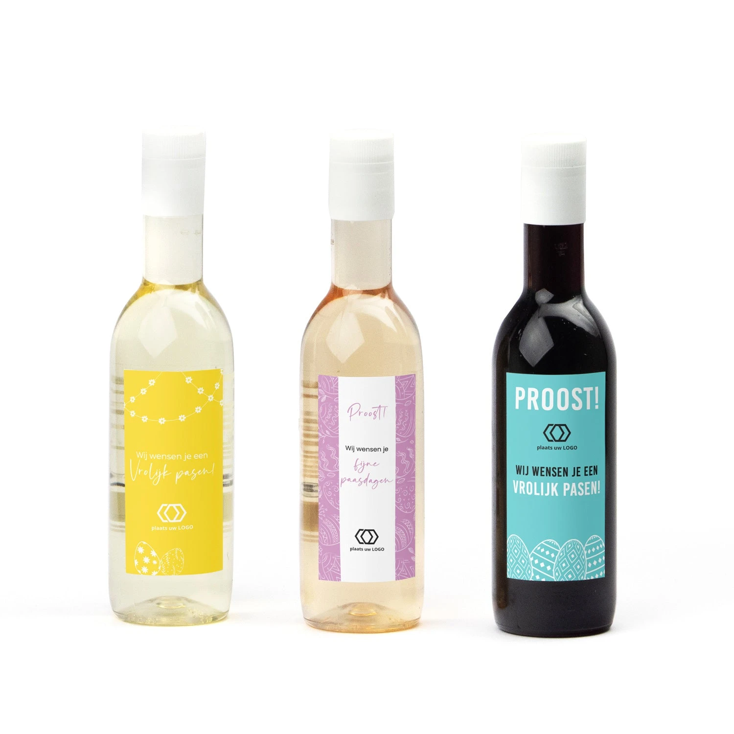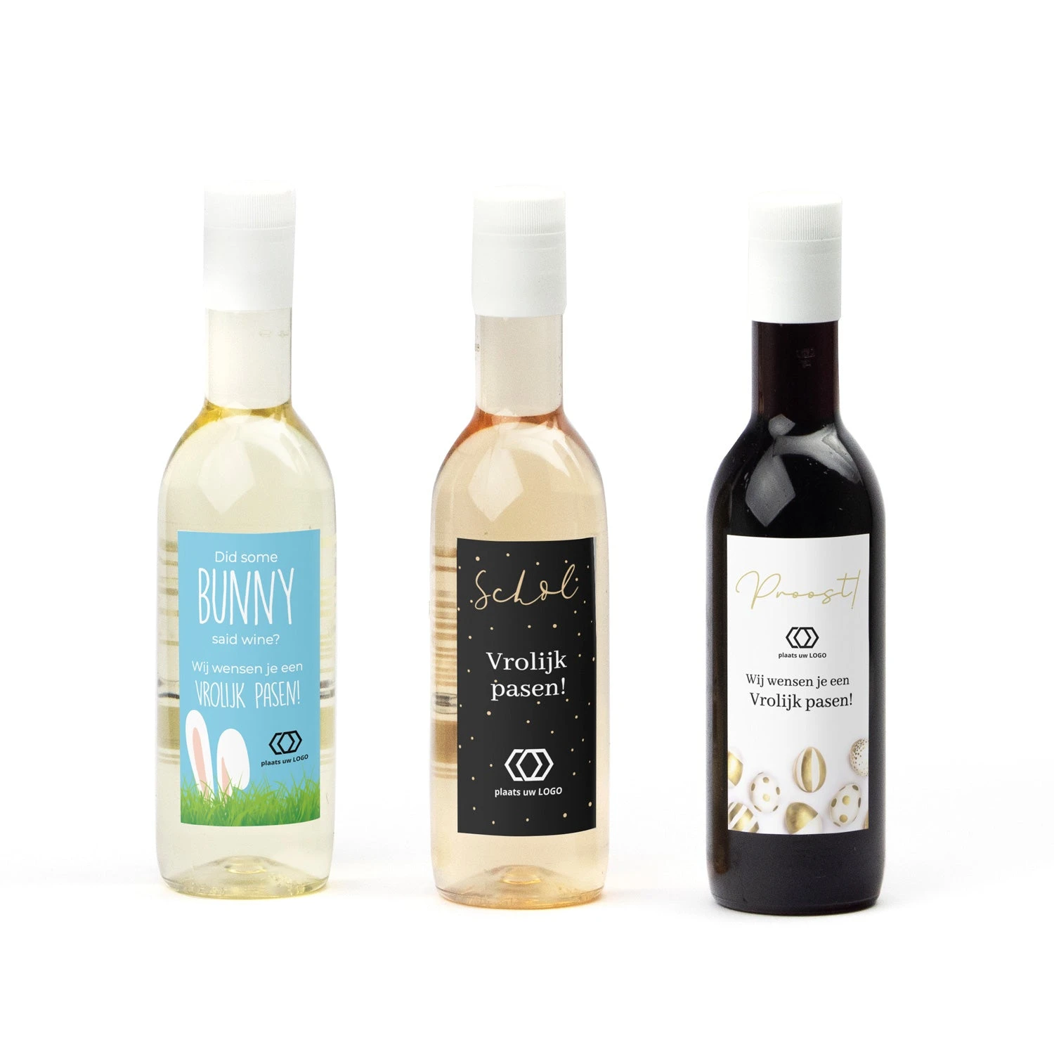 Leuk als uitnodiging voor de paasborrel; een klein flesje wijn of rosé met een eigen logo en/of boodschap op het etiket. Je kunt kiezen uit witte wijn (Sauvignon Blanc), rode wijn (merlot) of Rosé.