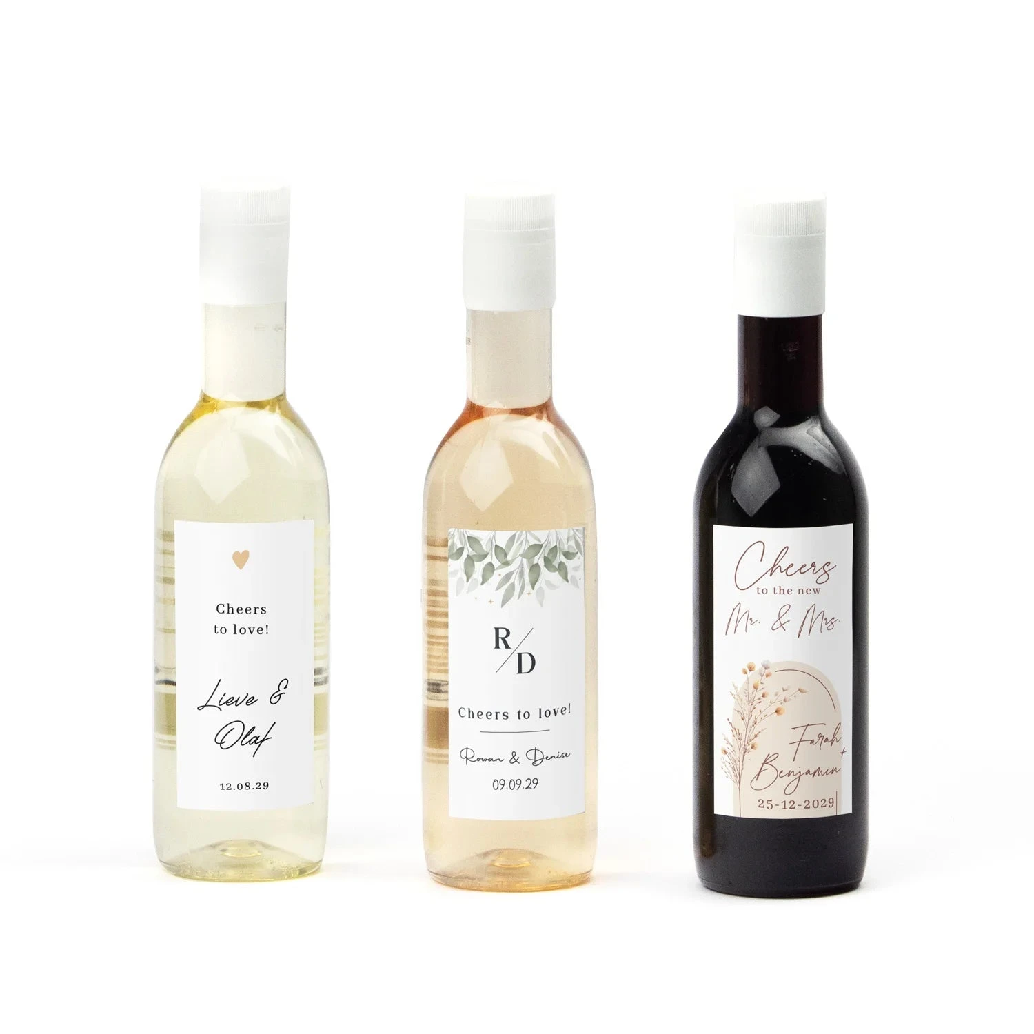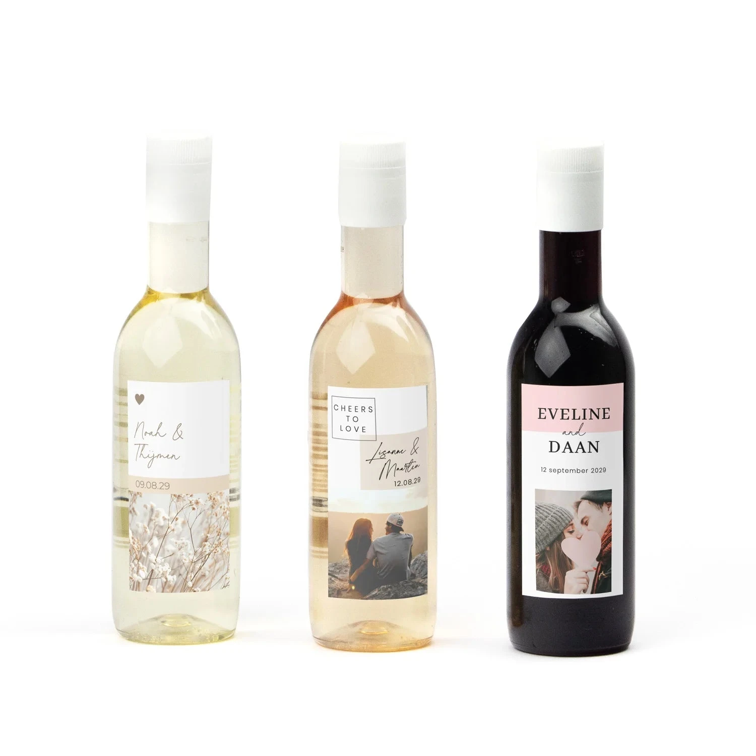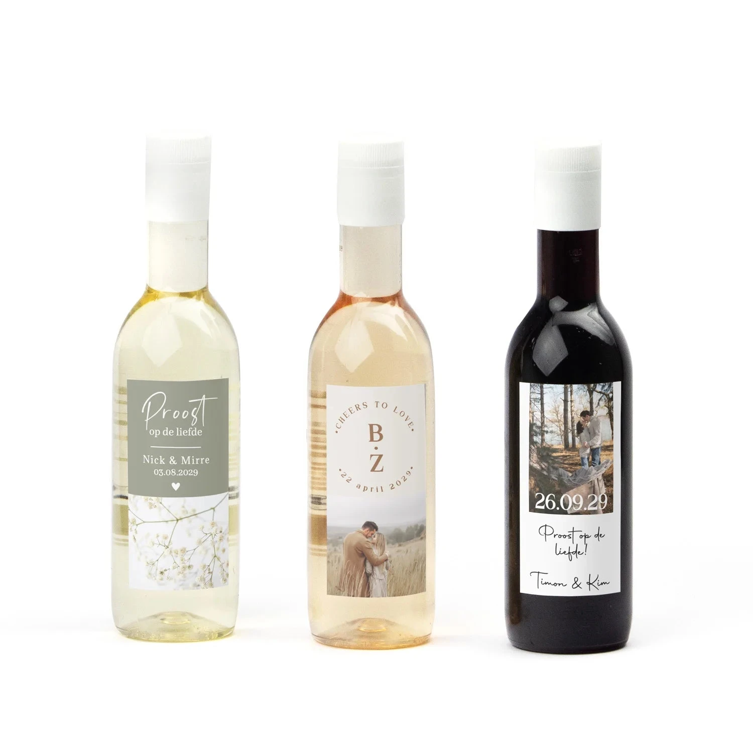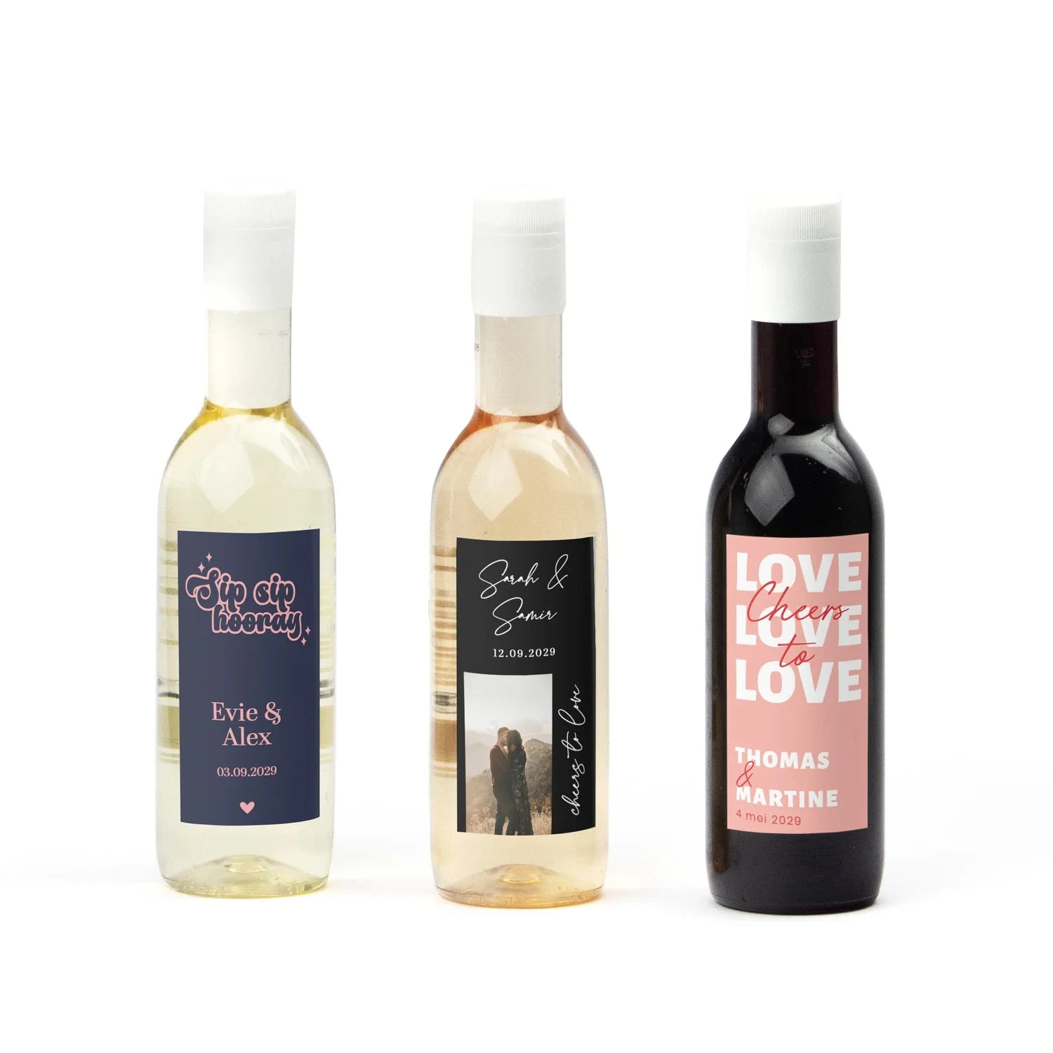 Leuk als bedankje, een klein flesje wijn of rosé met een eigen etiket. Je kunt kiezen uit witte wijn (Sauvignon Blanc), rode wijn (merlot) of Rosé.