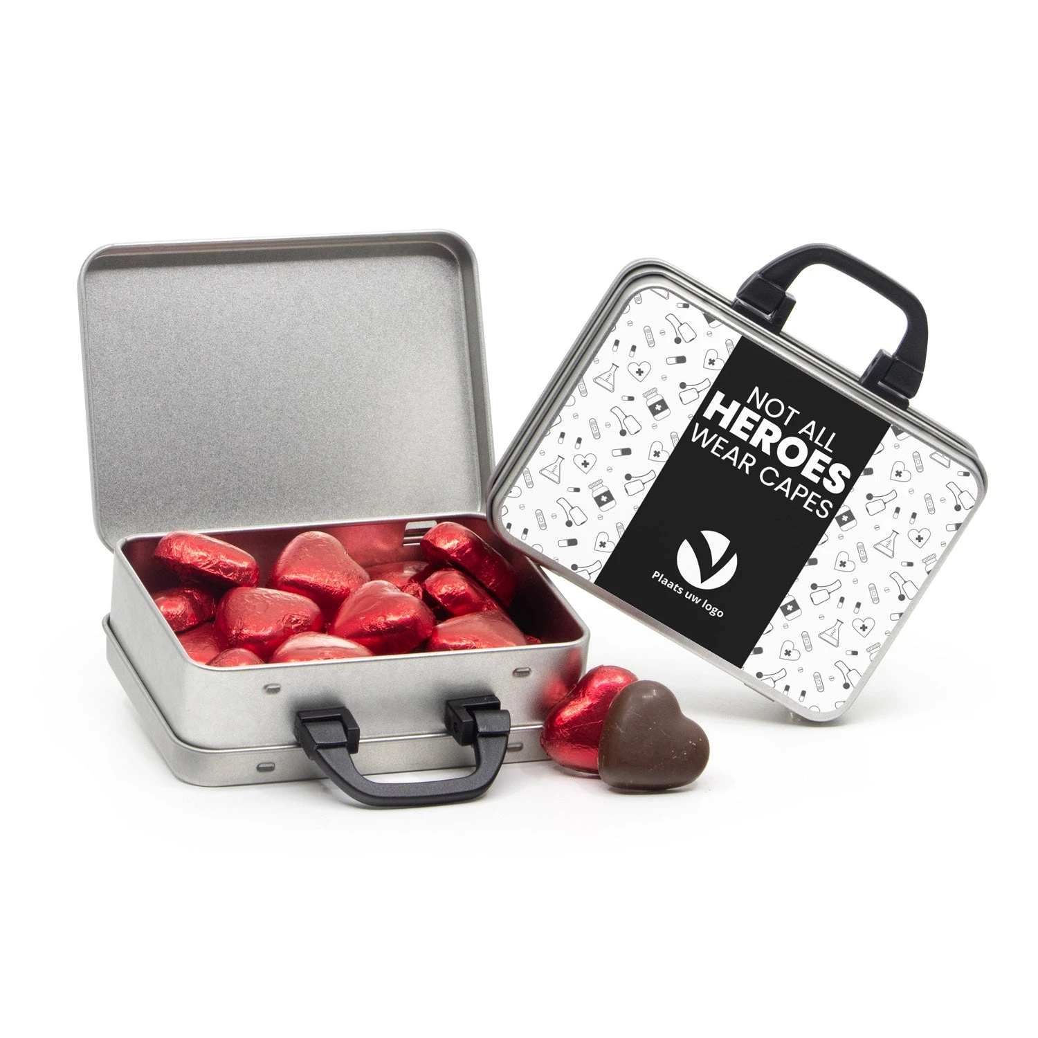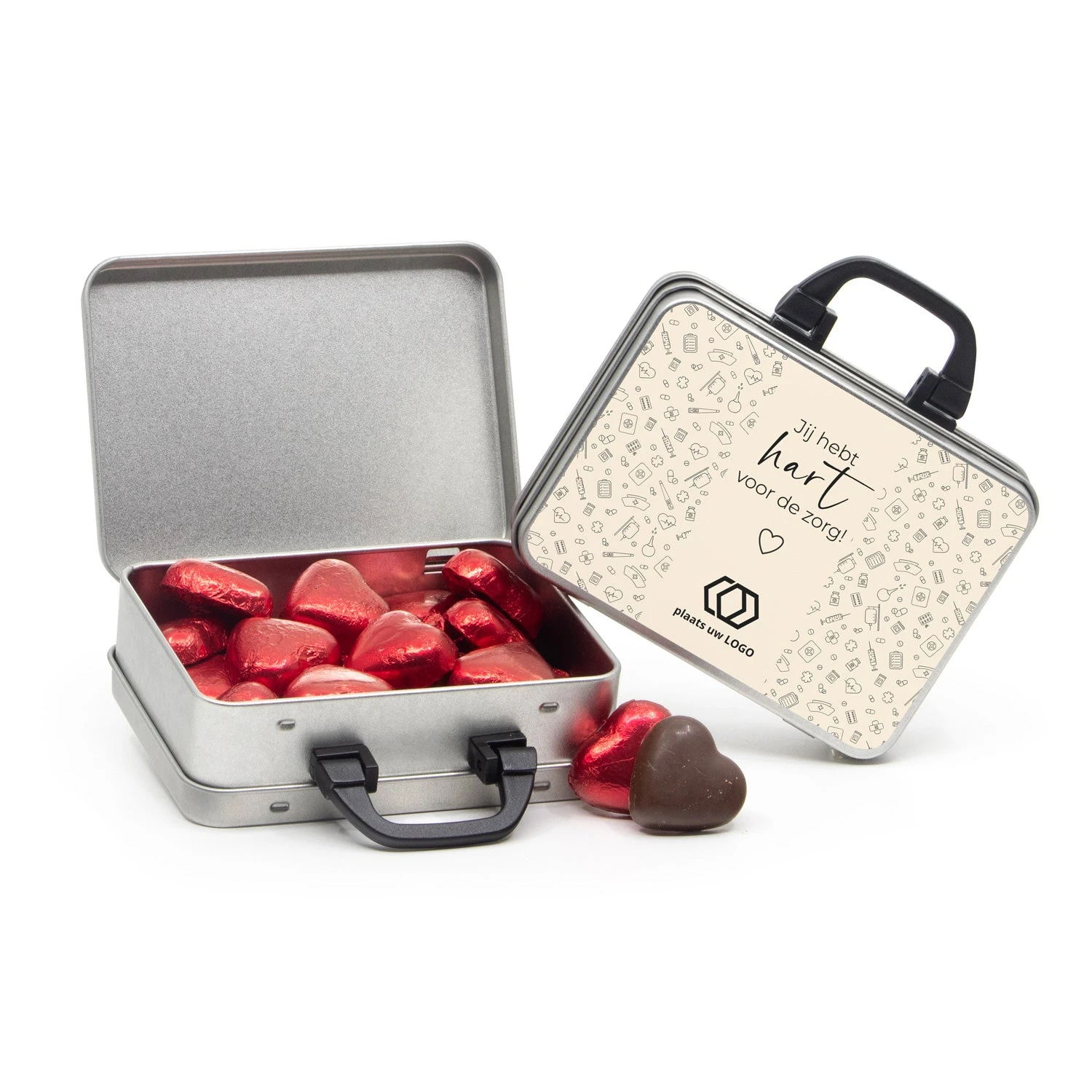 Een blikken koffertje vol lekkers naar keuze om alle zorgwerkers in het zonnetje te zetten tijdens de Dag van de Verpleging! Personaliseer het etiket met een eigen tekst en/of foto om het bedankje nog persoonlijker te maken. Het koffertje kan ook zonder vulling besteld worden om er zelf iets leuks in te doen. Een originele en lekkere manier om jouw waardering te laten blijken!