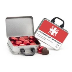 Een blikken koffertje met zwart hengsel en scharnierdeksel en een persoonlijk etiket. Leeg of gevuld met een vulling naar keuze. Je kunt het koffertje persoonlijk maken met een eigen tekst en/of logo. Dit etiket kun je eenvoudig ontwerpen via onze online ontwerptool. Een leuk bedankje voor bijvoorbeeld de Dag van de BHV-er.