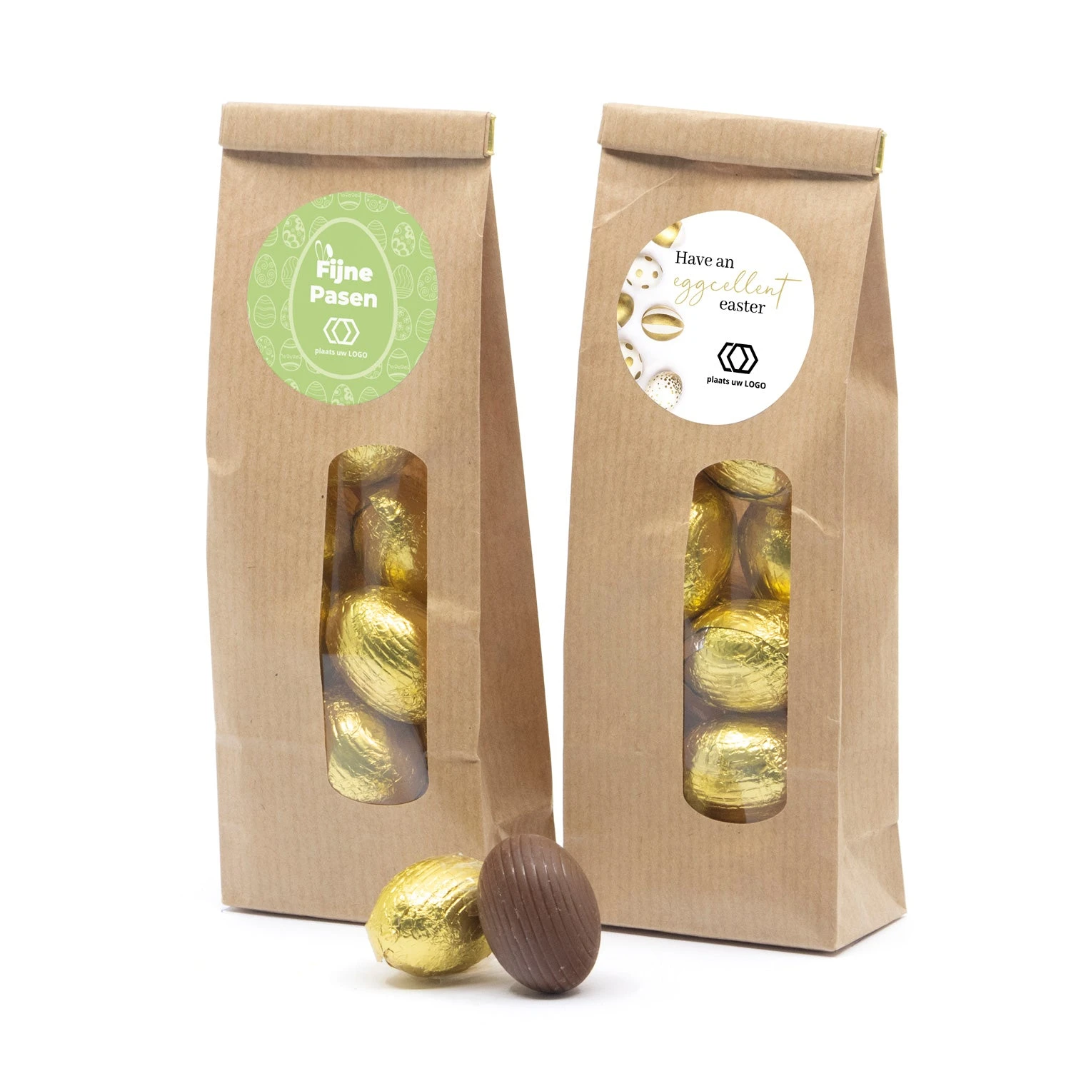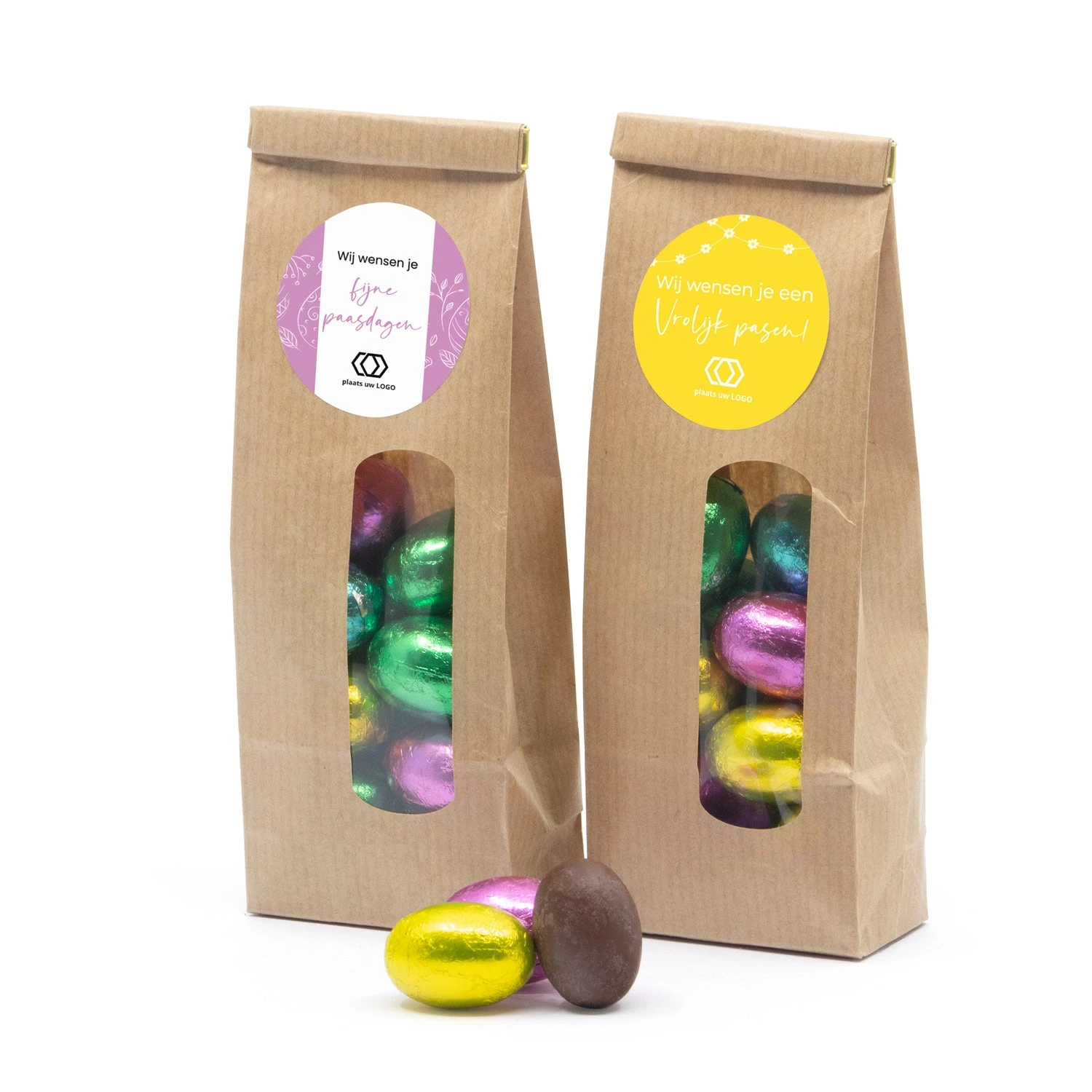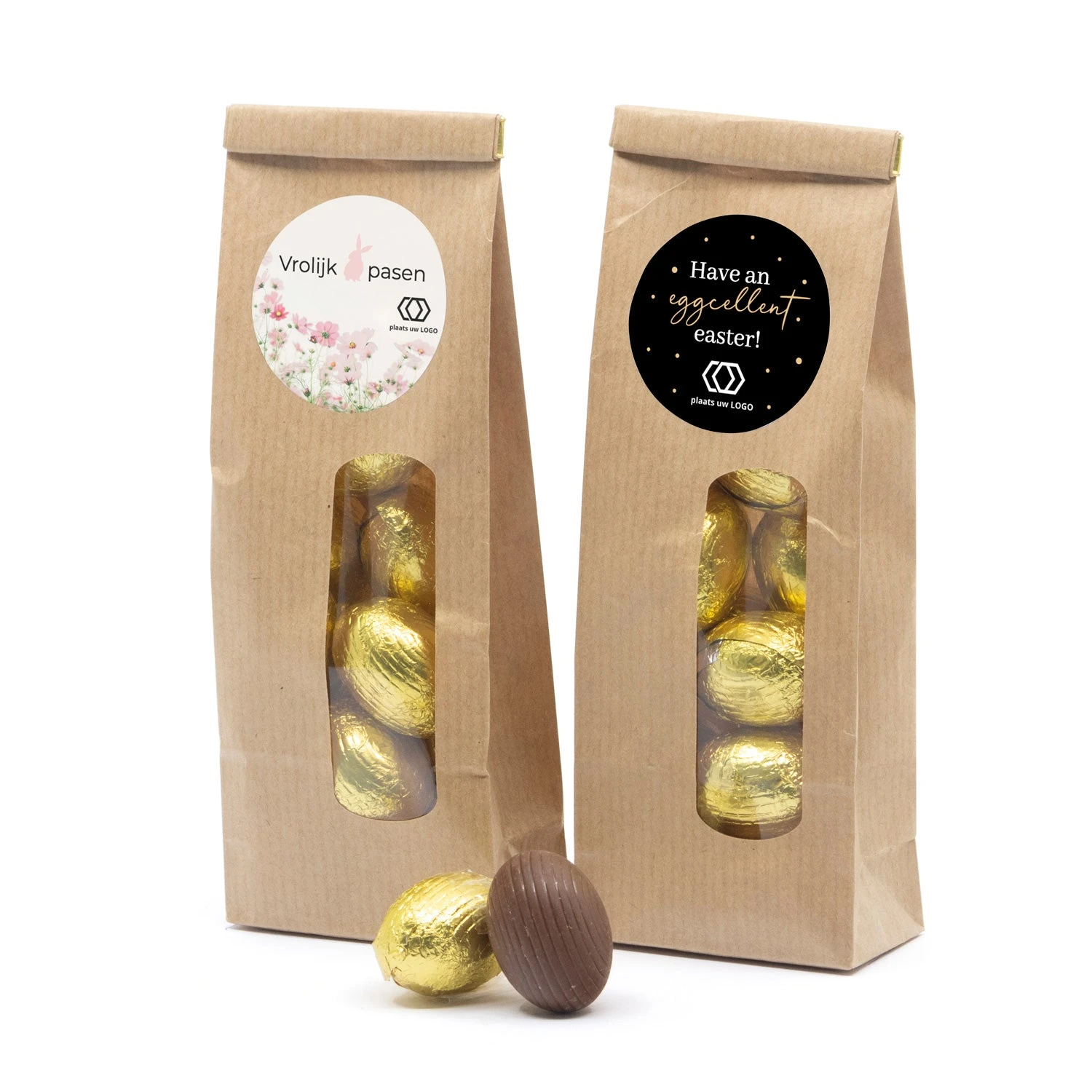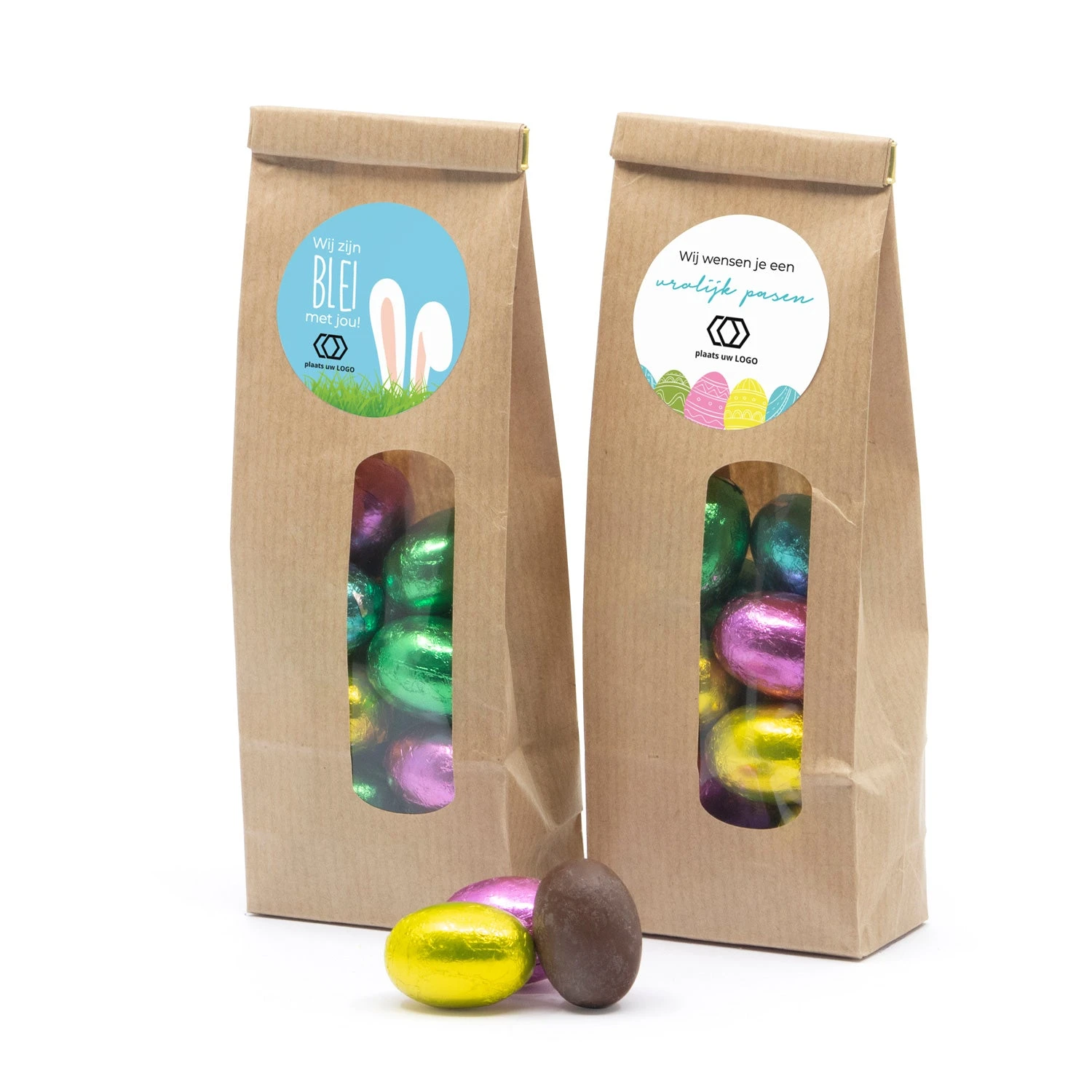 Hippe kraftzakjes als bedankje, gevuld met 100 gram melkchocolade paaseitjes. De stickers kun je zelf personaliseren met jouw tekst en/of logo.Â