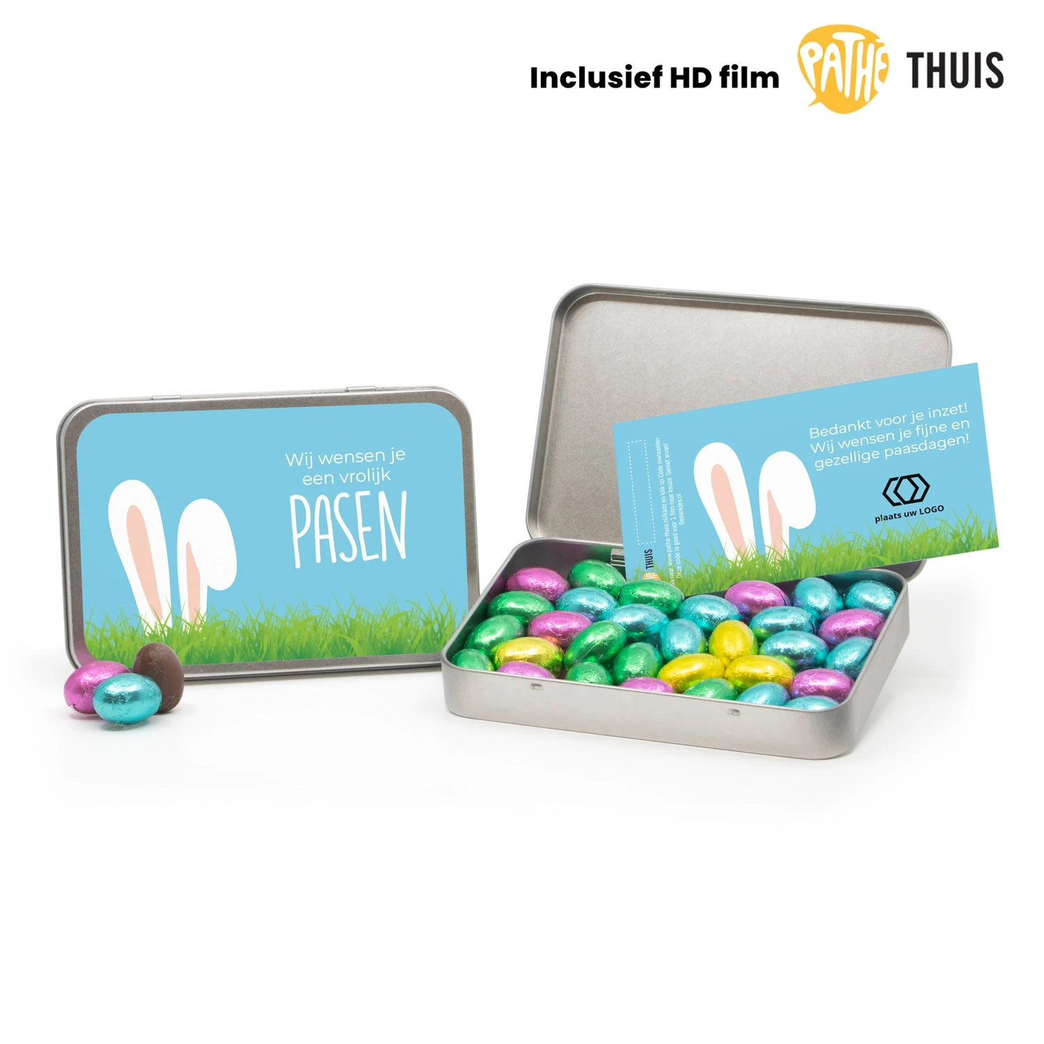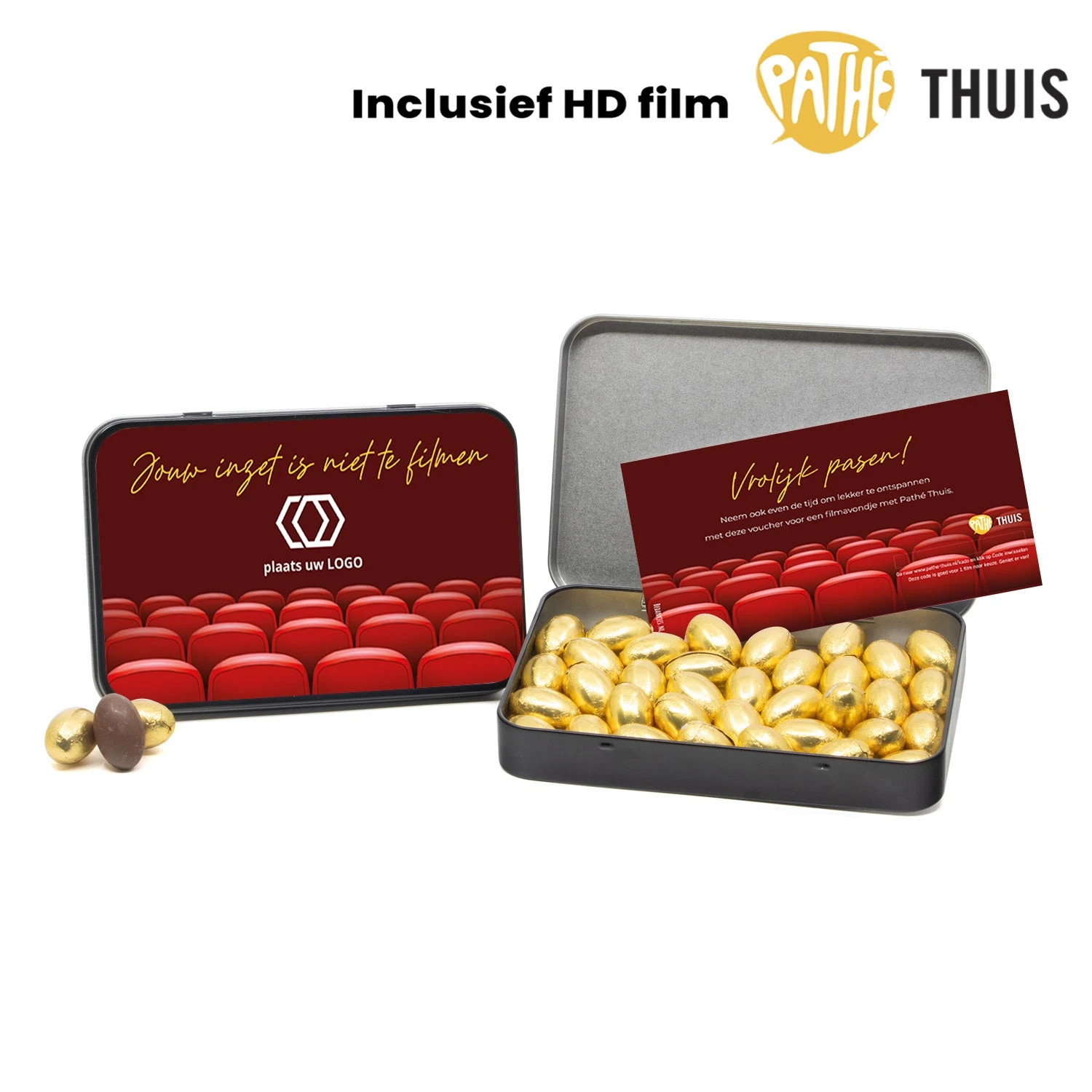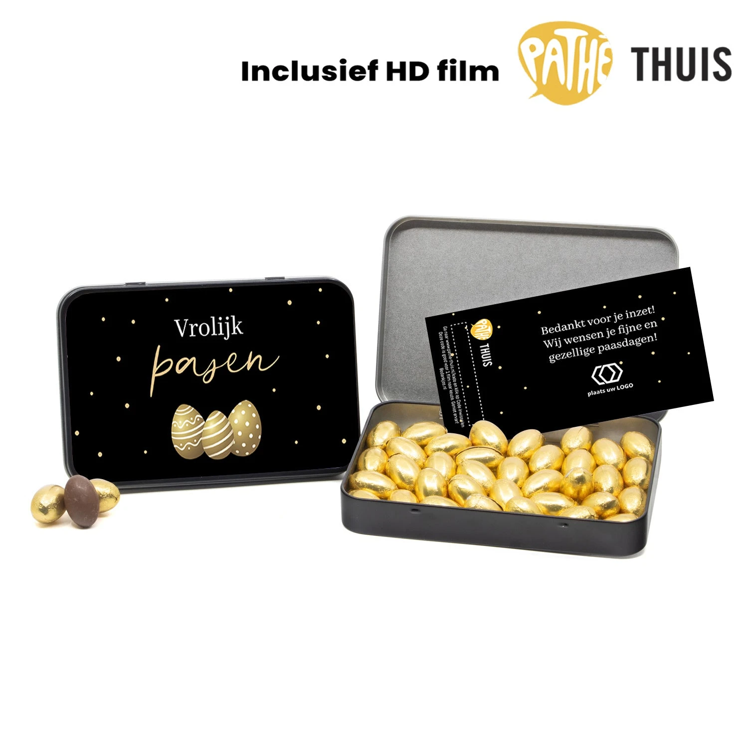 Een A6 blik gevuld met chocolade paaseitjes met gouden folie. In het blik gaat 230 gram melkchocolade paaseitjes en een persoonlijke kaart die je zelf kan ontwerpen in onze ontwerptool. Je kunt kiezen uit 1 of 2 HD-films t.w.v max € 5,99 per film.