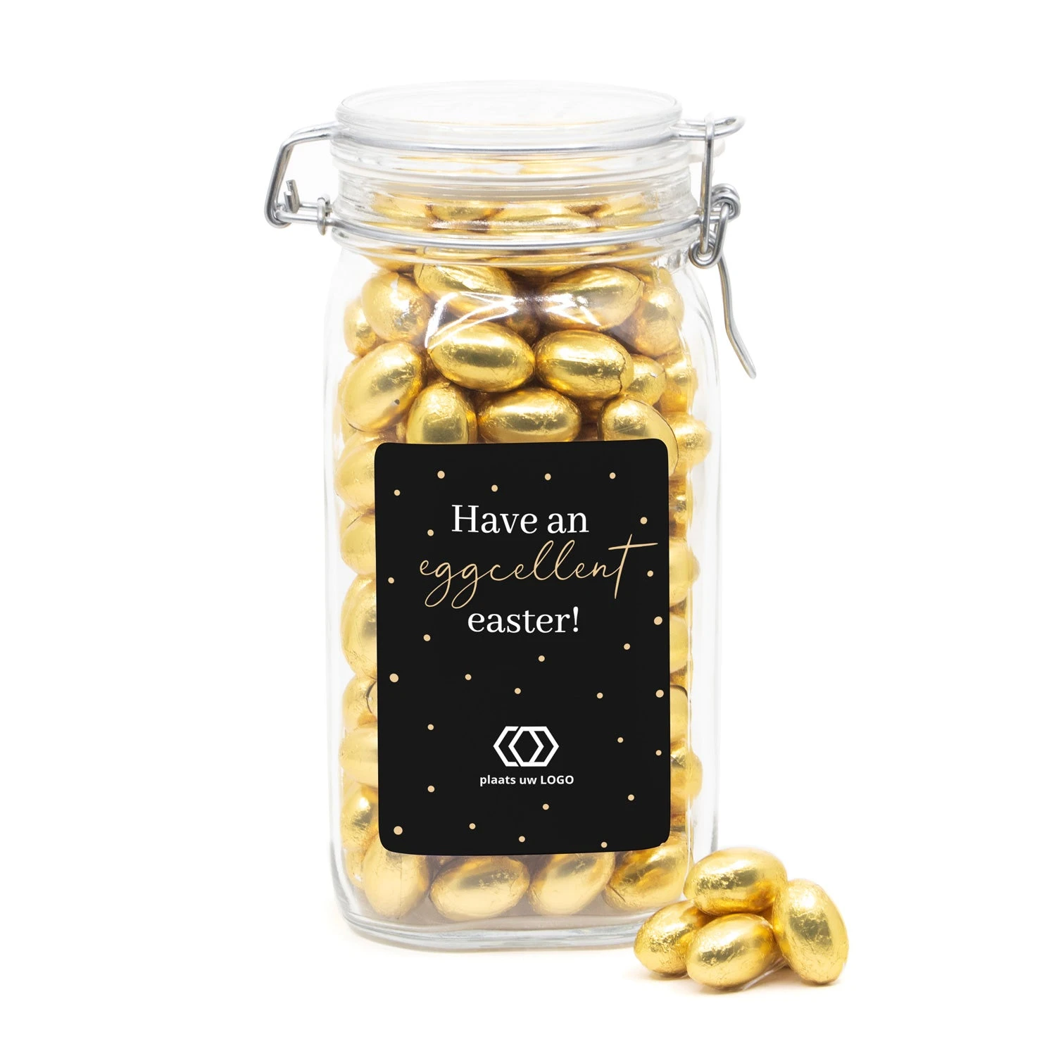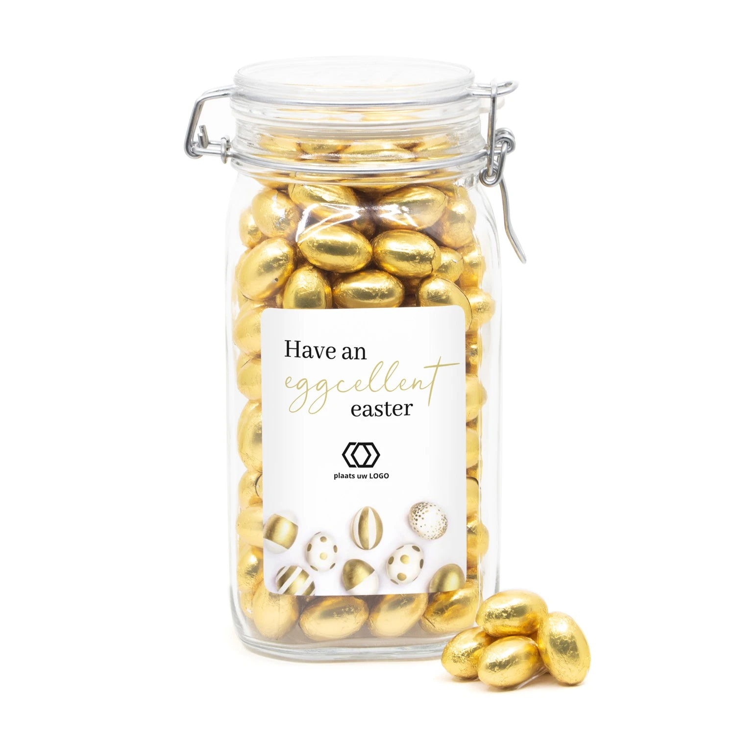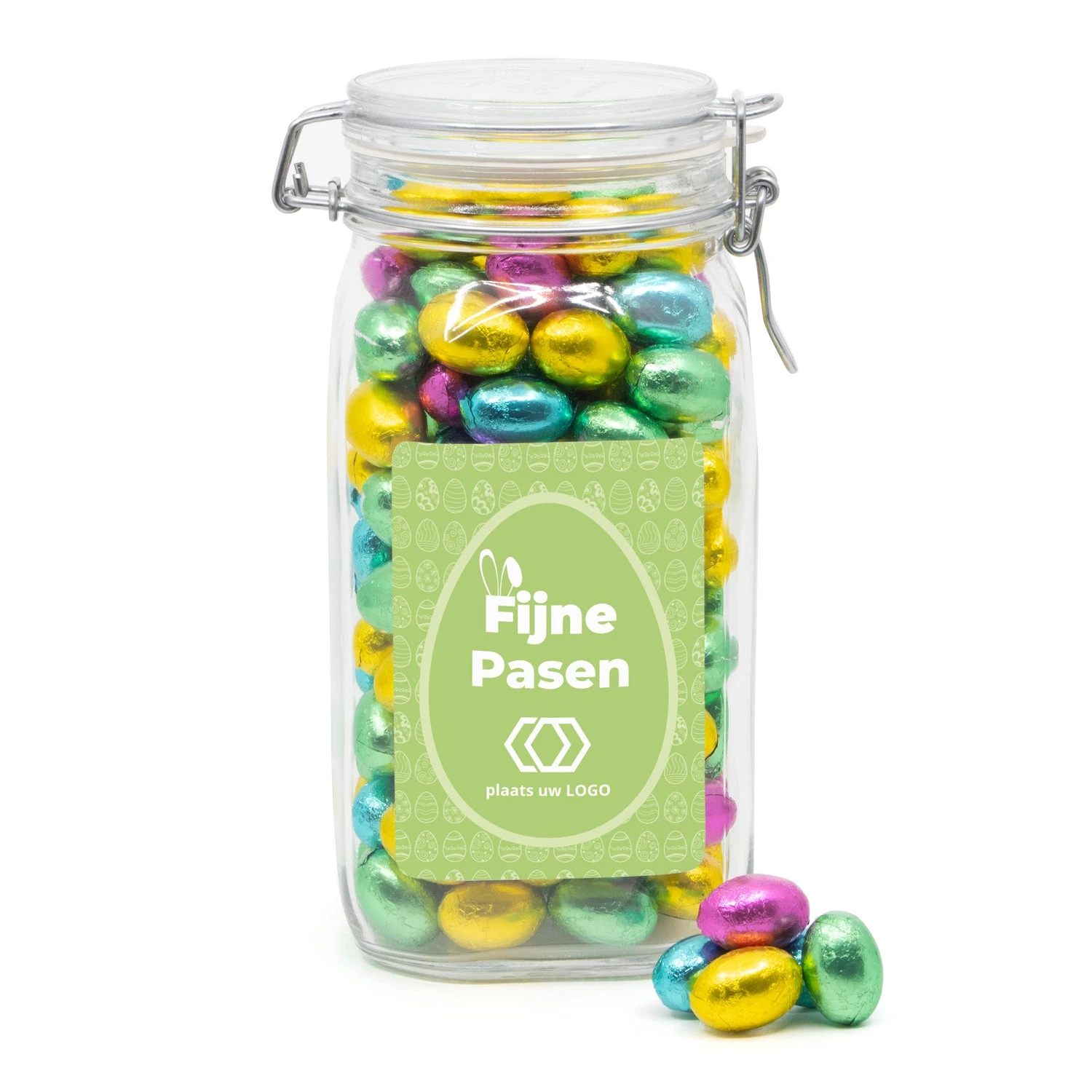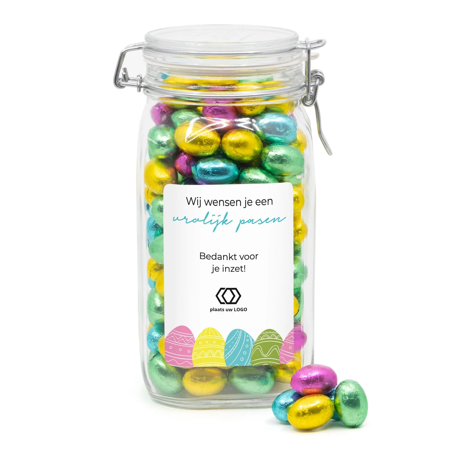 Een hele mooie glazen weckpot van 1,5 liter met beugelsluiting, afgevuld met 1150 gram melkchocolade paaseitjes. Deze weckpot word voorzien van een persoonlijk etiket. Dit etiket maak je gemakkelijk via onze online ontwerptool. Â Deze pot staat heel erg gaaf in een ontvangstruimte of op de balie en zal zeker nog lang gebruikt gaan worden.