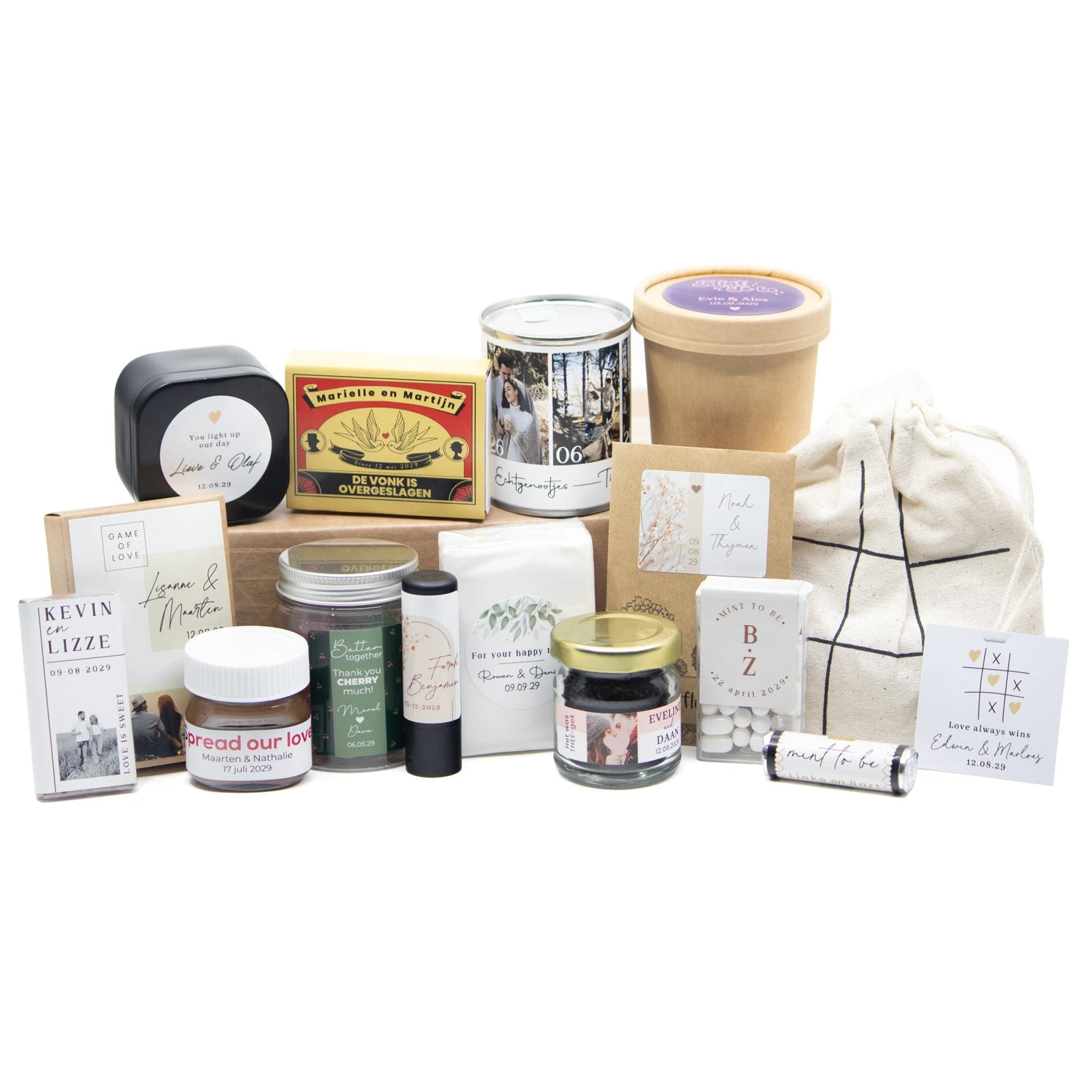 We snappen dat je soms even wilt zien en voelen hoe het product eruit ziet voordat je het gaat bestellen. Dat kan met ons proefpakket. In dit pakket hebben wij voorbeelden gedaan van onze meest populaire bedankjes. Ze zijn voorzien van etiketten/stickers/labels met voorbeelden van klanten. Het is niet mogelijk om hier een eigen personalisatie op te krijgen.