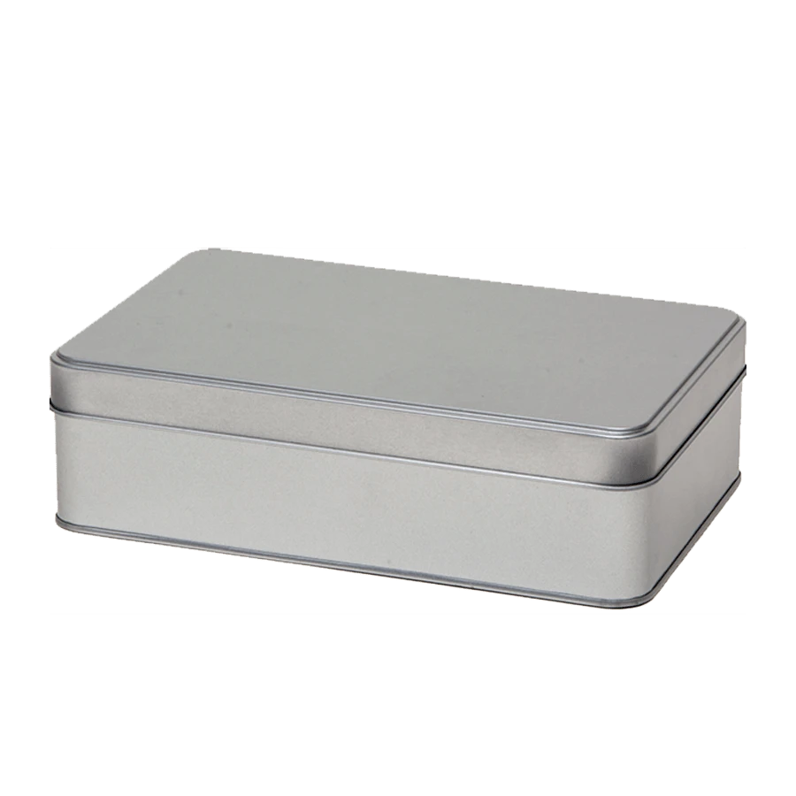 Rechthoekig opbergblik met de afmetingen 217 x 137 x 62 mm. Het blik bevat een los deksel.