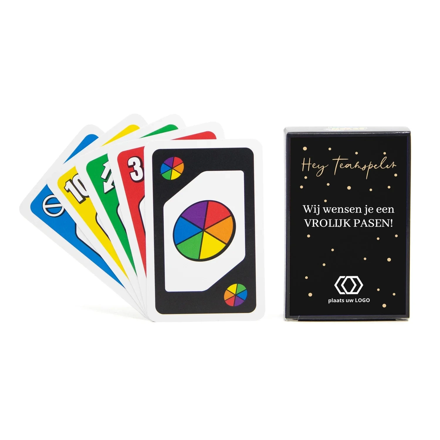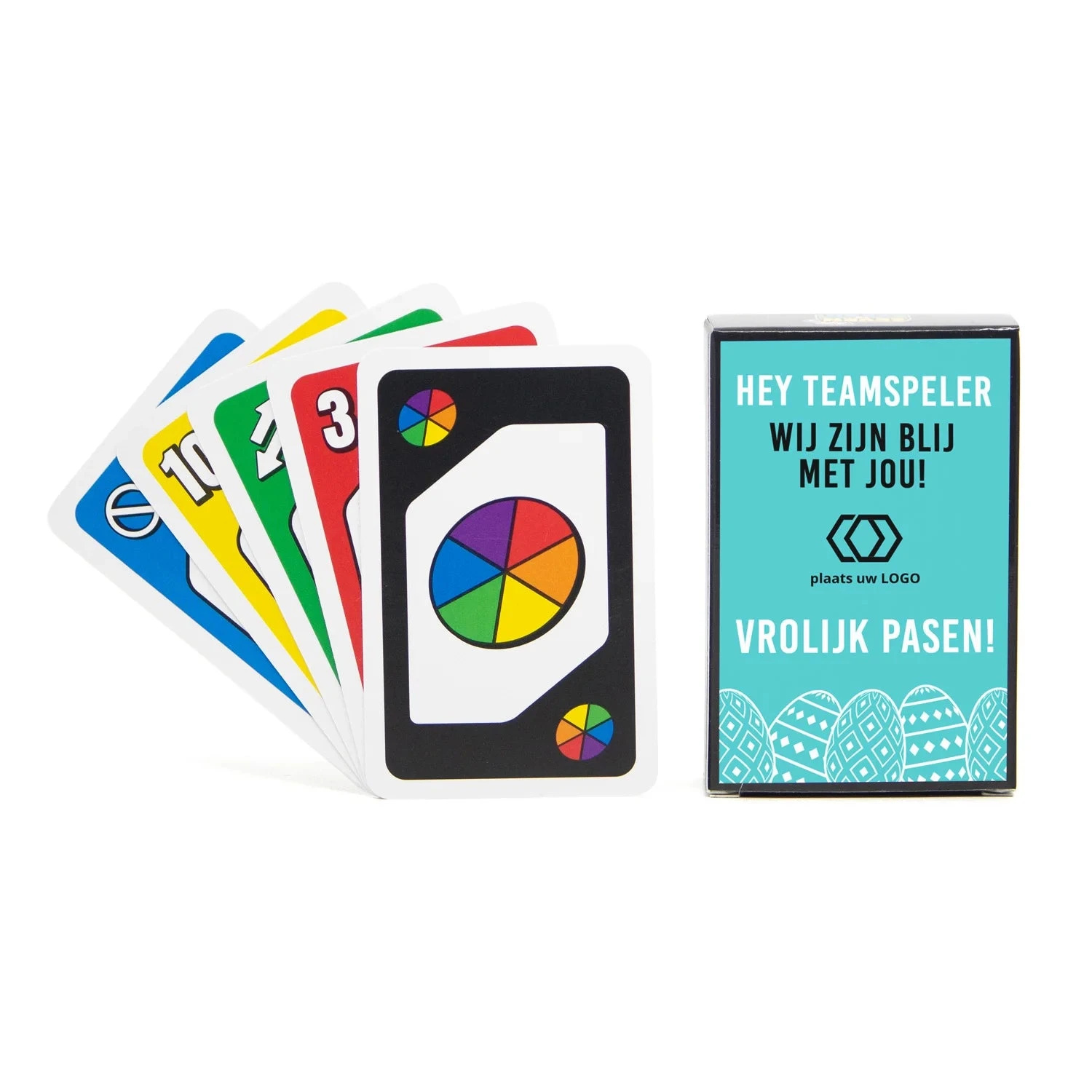 Voor de echte Teamplayers! Zorg naast het paaseieren zoeken voor een gezellig spelletje tijdens de paasdagen via dit Seven to Zero kaartspel met een personaliseerbaar etiket. Voeg een leuke paaswens en/of foto toe en daag je personeel uit voor een paasweekend vol speelplezier!