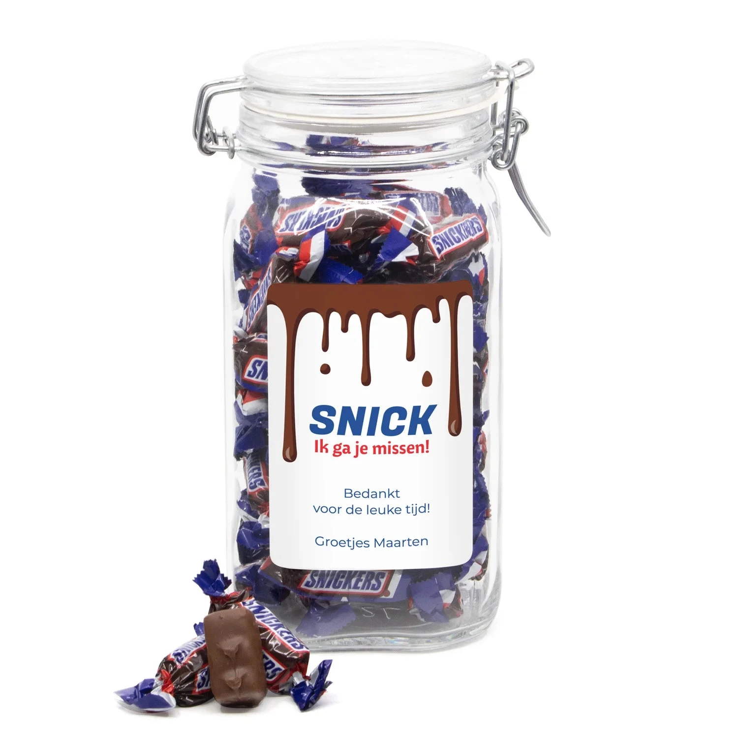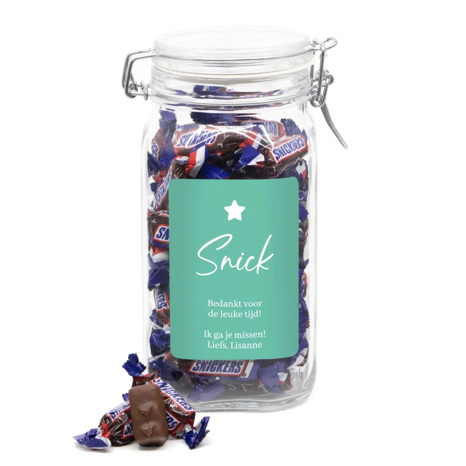 Snick! Ik ga ervandoor! Bestel een mooie glazen weckpot met beugelsluiting inclusief een persoonlijk etiket. Afgevuld met verrukkelijke kleine snickers. Het etiket maak je gemakkelijk zelf via onze online ontwerp tool. Door deze persoonlijke touch zal de pot nog lang gebruikt worden! Een origineel en blijvend bedankje voor je collega’s of leidinggevende als je afscheid neemt op je werk of stageplek.Â