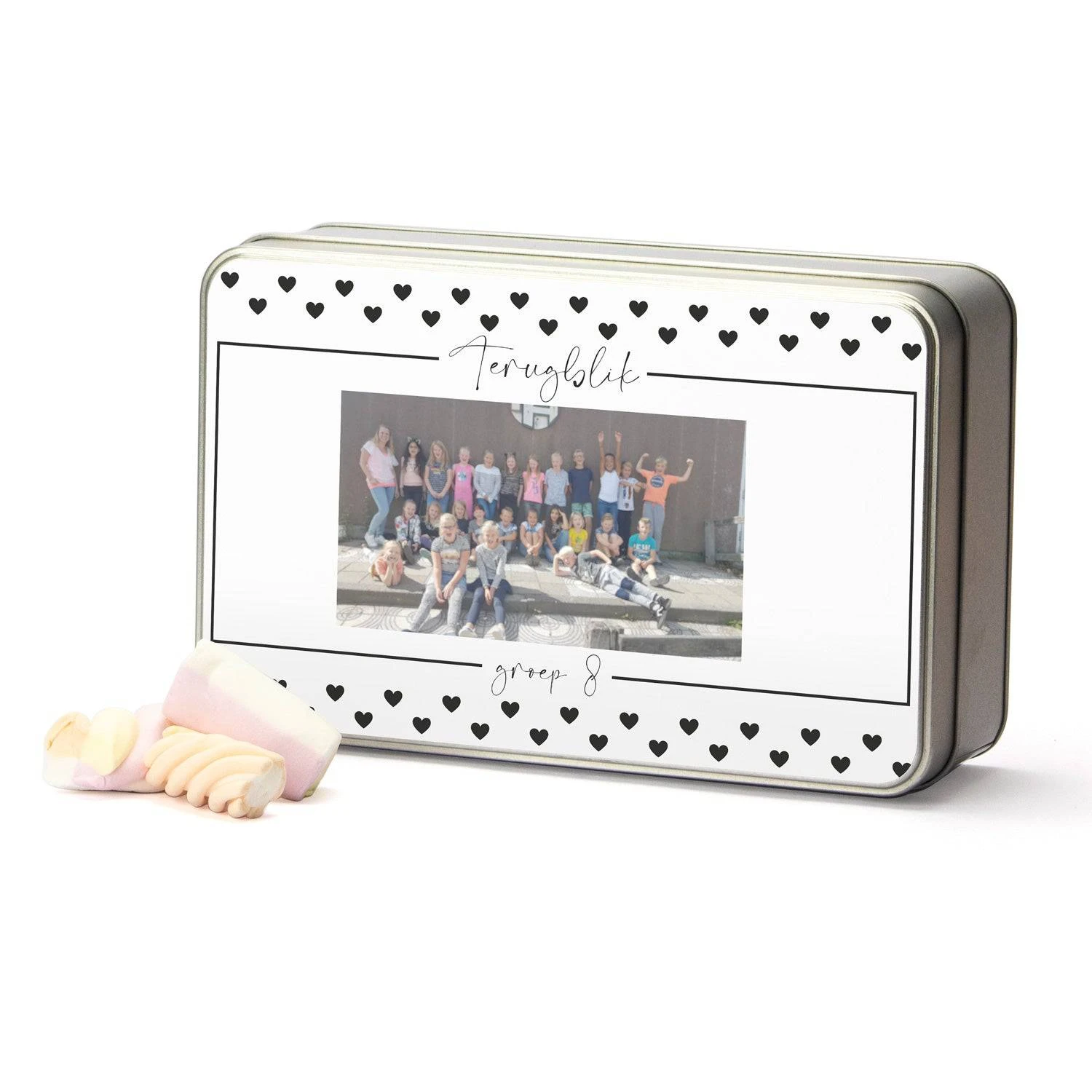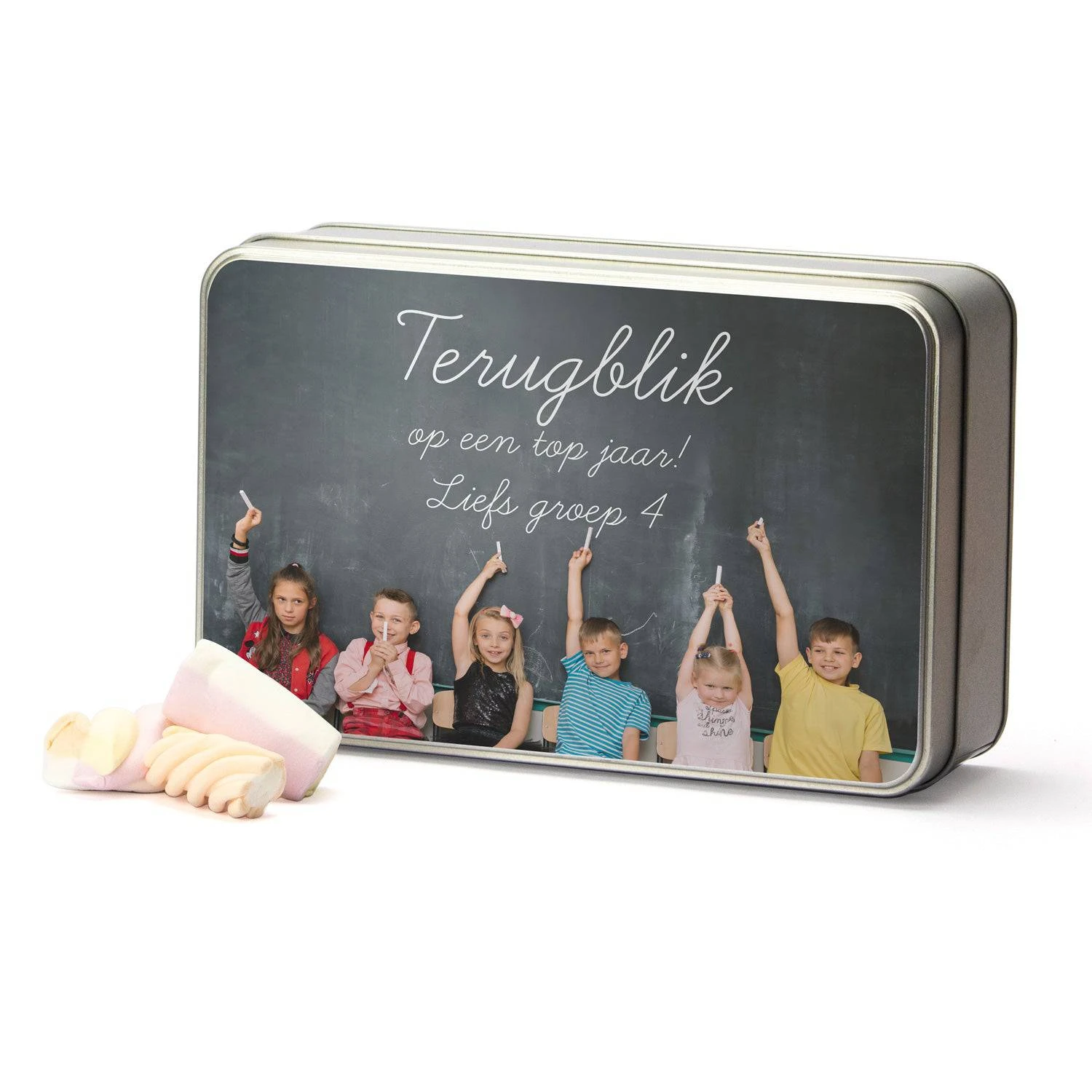 Terugblik op de basisschool of terugblikken op mooie periode? Dan is dit snoepblik of cadeaublik een leuk bedankje die we voorzien van jouw eigen foto en/of tekst.