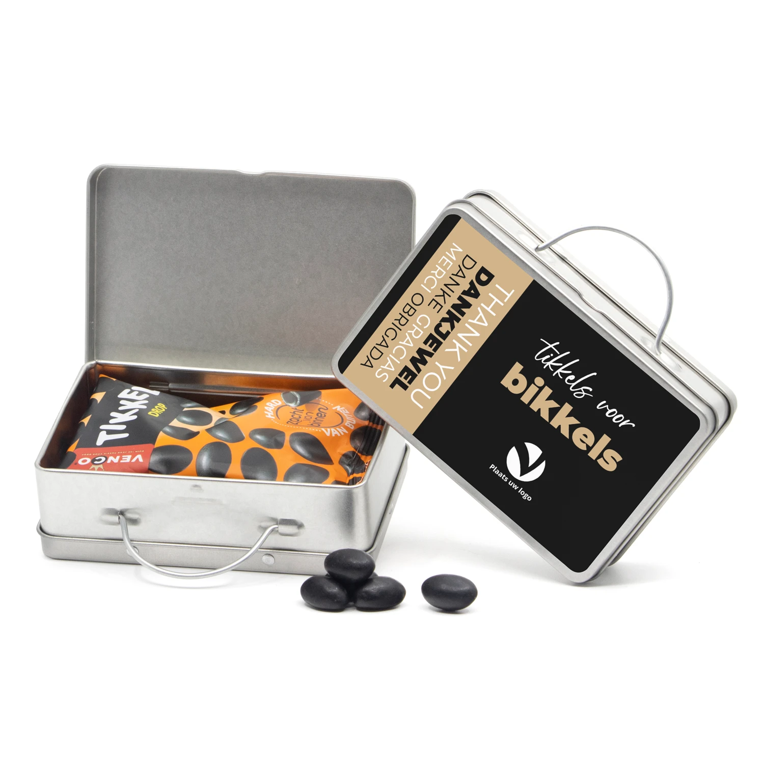 Tikkels voor echte Bikkels! Een blikken koffertje met hengsel en scharnierdeksel en een persoonlijk etiket. Gevuld met twee zakjes tikkels. Je kunt het koffertje persoonlijk maken met een eigen etiket. Dit etiket kun je ontwerpen via onze online ontwerptool. Voor alle bikkels op de zaak!