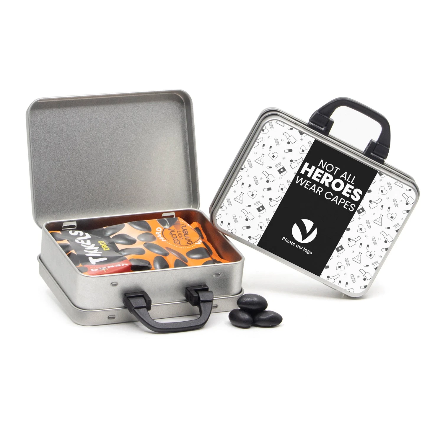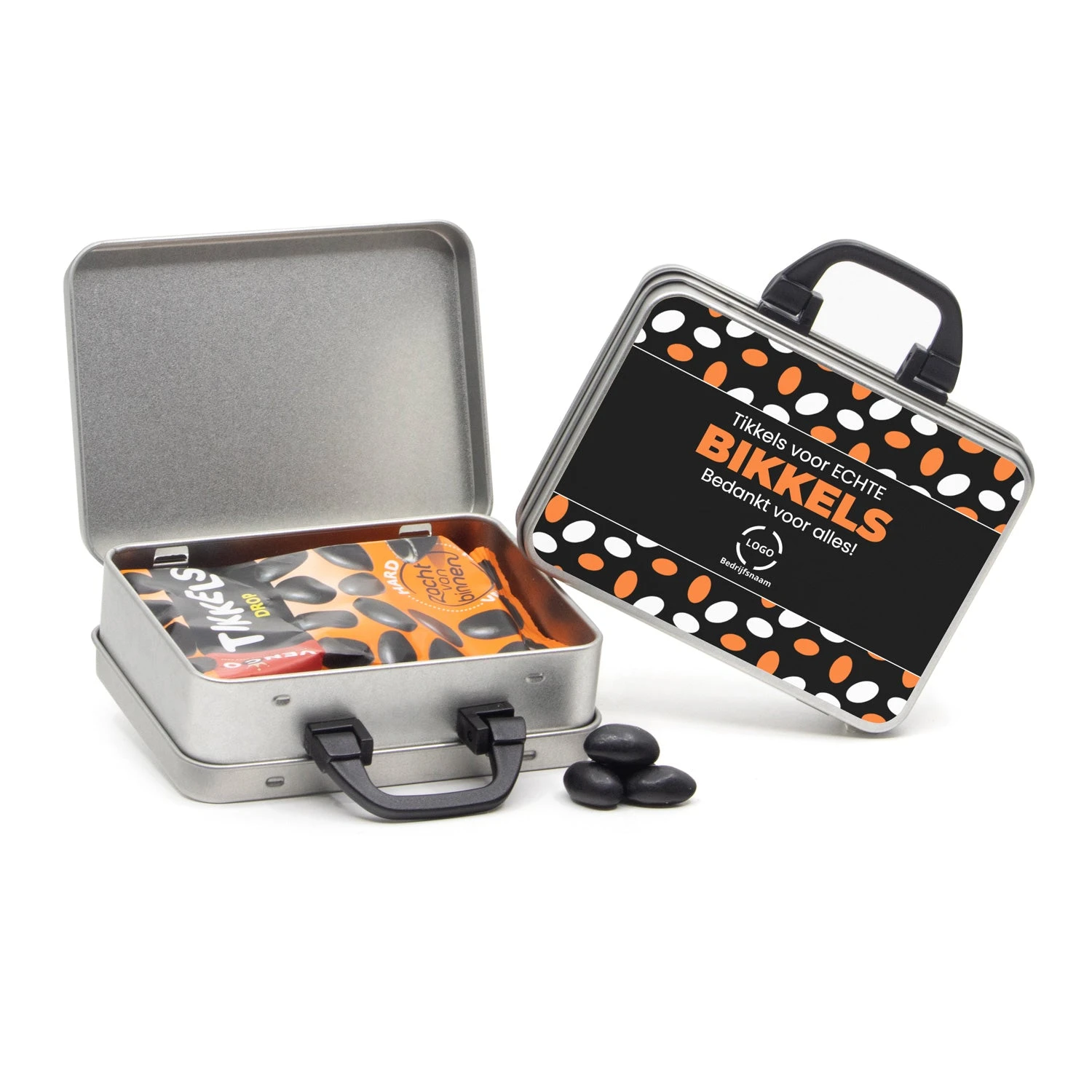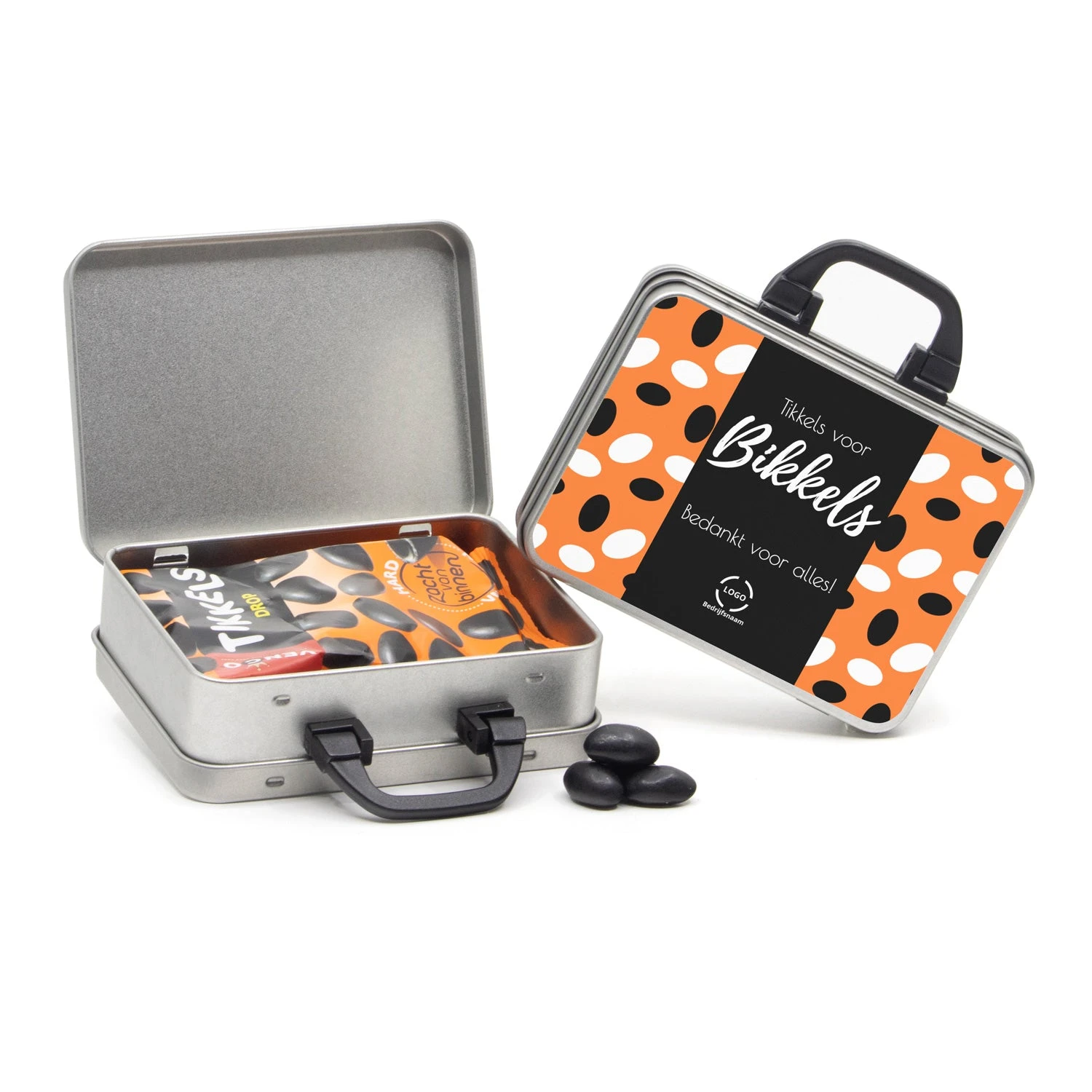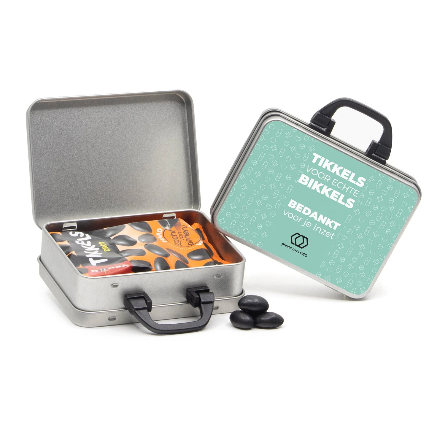 Tikkels voor echte Bikkels! Zet de hardwerkende zorgwerkers in het zonnetje tijdens de Dag van de Verpleging. Een blikken koffertje met zwart hengsel gevuld met twee zakjes tikkels en de mogelijkheid om een tekst en/of foto toe te voegen aan het etiket. Zo maak je het bedankje extra persoonlijk en laat je jouw waardering op een originele en lekkere manier blijken!