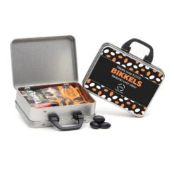 Tikkels voor echte Bikkels! Een blikken koffertje met zwart hengsel en scharnierdeksel en een persoonlijk etiket. Gevuld met twee zakjes tikkels. Je kunt het koffertje persoonlijk maken met een eigen etiket. Dit etiket kun je ontwerpen via onze online ontwerptool.