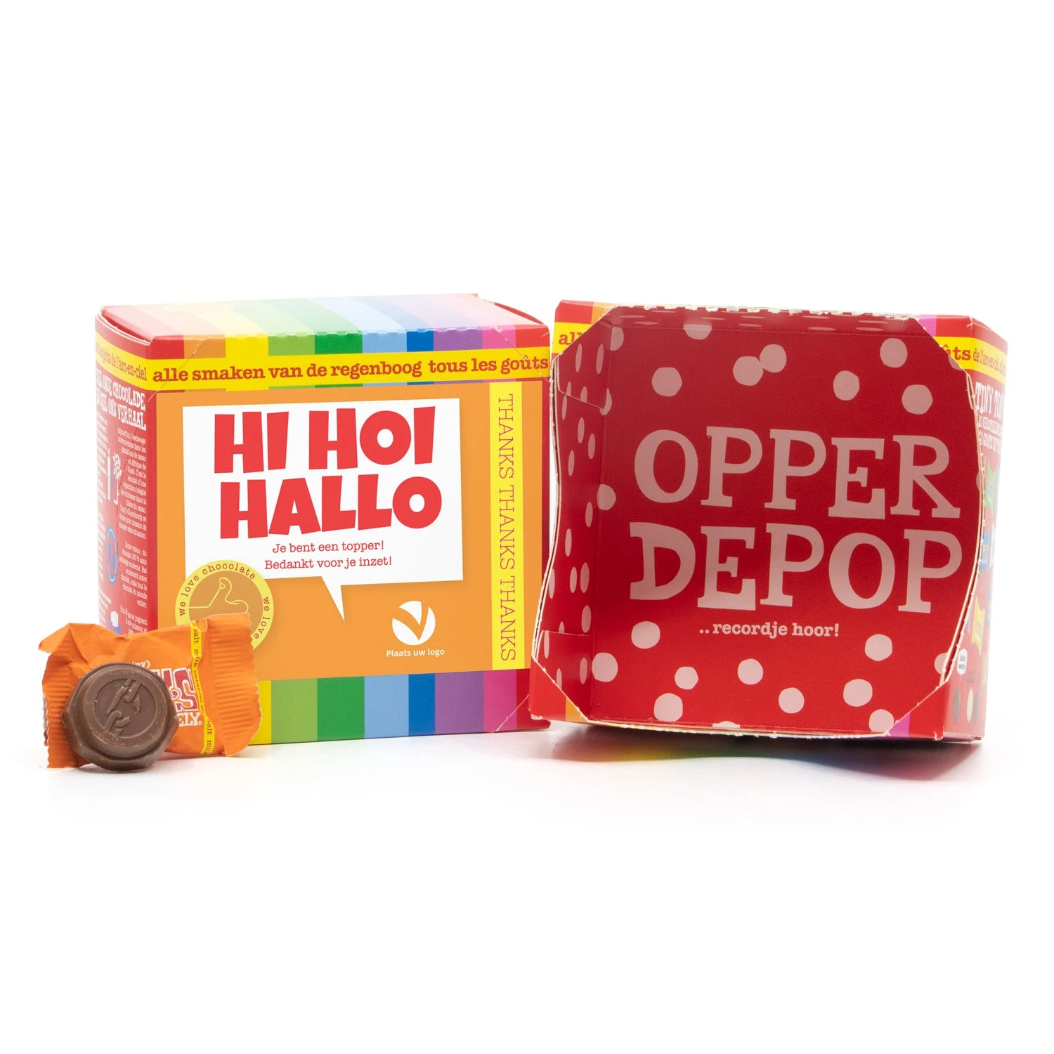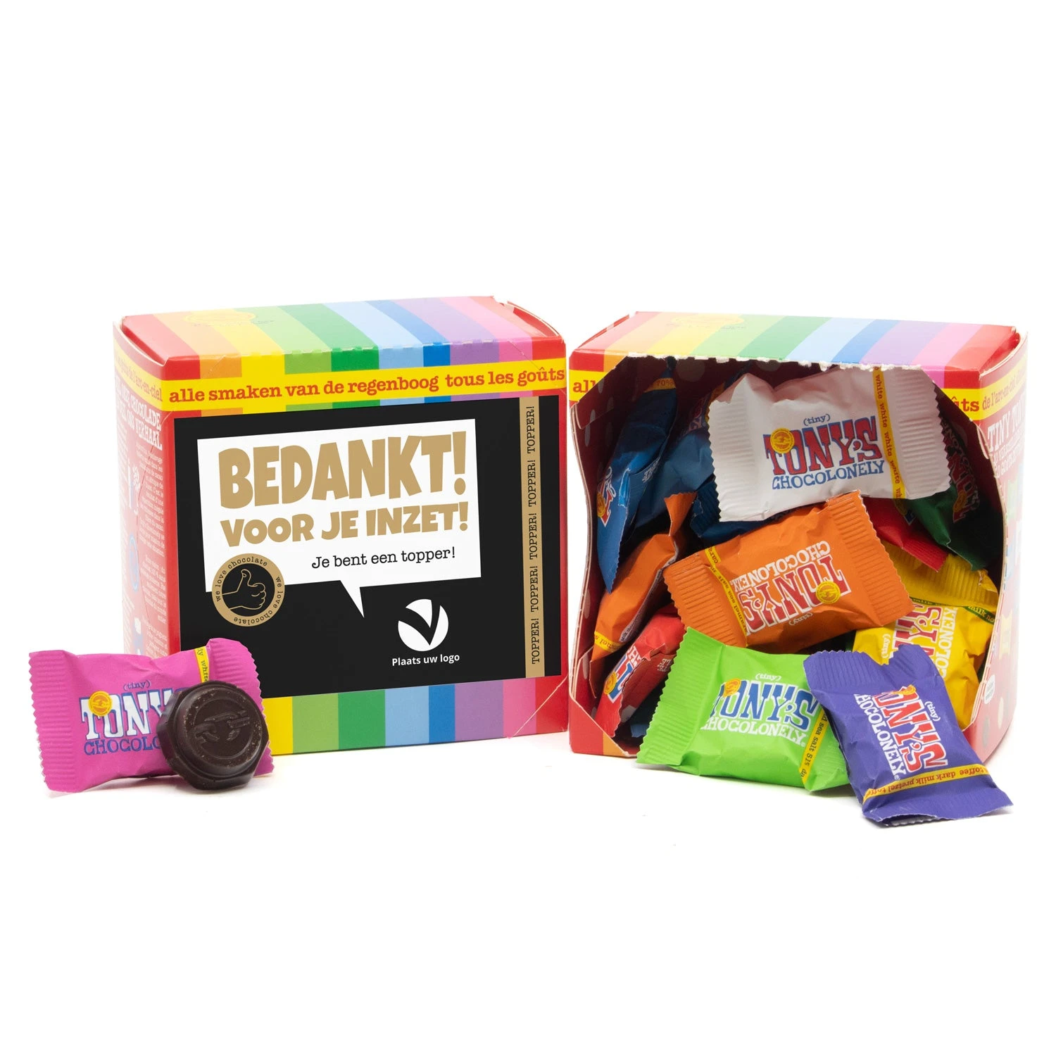 Een super grappig doosje van Tony’s chocolonely. In dit kadoosje zitten 22 tiny tony’s in een mix van 10 smaken. Een origineel en heerlijk cadeau voor alle medewerkers of klanten. Dit kadoosje bevat een persoonljke sticker die je gemakkelijk zelf kunt opmaken via onze online ontwerptool. Voeg bijvoorbeeld je eigen tekst en/of logo toe! Hier maak je iedereen blij mee!