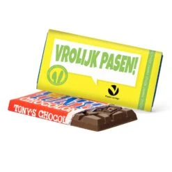 Tony’s Chocolonely chocoladereep van 180 gram met een persoonlijk ontwerp voor pasen op het wikkel! Je kunt het wikkel ontwerpen op onze website of zelf een ontwerp aanleveren. Wij versturen deze repen per stuk naar een adressenbestand.