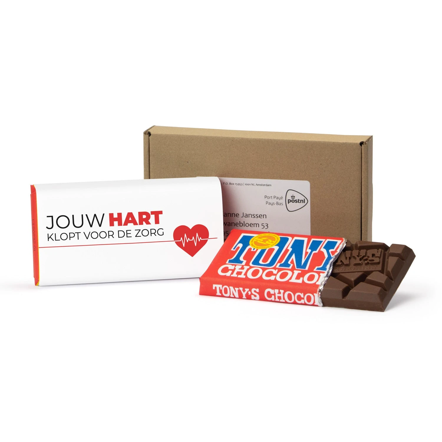 Tony’s Chocolonely chocoladereep van 180 gram met persoonlijk ontwerp op het wikkel! Je kunt het wikkel personaliseren in onze ontwerptool of zelf een ontwerp aanleveren. Wij versturen deze repen, indien gewenst, per stuk naar een adressenbestand.