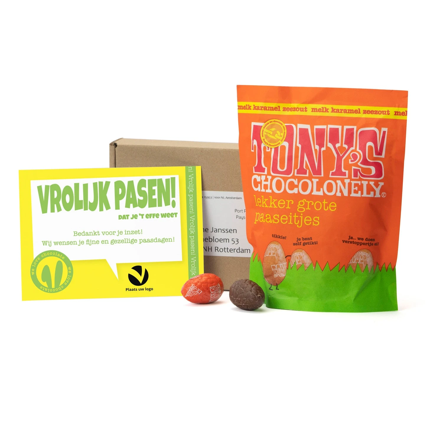 Het lekkerste paasgeschenk. Iemand verrassen met een overheerlijk paaspakketje? Maak een persoonlijk pakketje met een kaart die je zelf kunt ontwerpen. Dit doosje bevat een zak met 180 gram originele Tony’s Chocolonely paaseitjes in de smaak melk karamel zeezout.