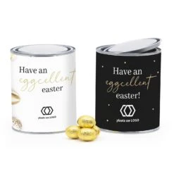 Groot verfblik van 1 liter, inclusief een eigen wikkel die je kunt voorzien van een eigen tekst en/of logo. Dit kun je gemakkelijk doen in onze ontwerptool. Het blik is gevuld met 780 gram paaseitjes. Deze melkchocolade paaseitjes hebben een hazelnoot crème vulling.