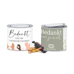 Medium verfblik van 0,5 liter, inclusief een eigen wikkel die je kunt voorzien van een eigen tekst en/of logo. Kies een passende vulling en je hebt een heel gaaf geschenk voor personeel of klanten. Het blik zal zeker bewaard worden, dus de boodschap die je erop zet zal nog lang te zien zijn. Al vanaf 12 stuks met eigen wikkel.