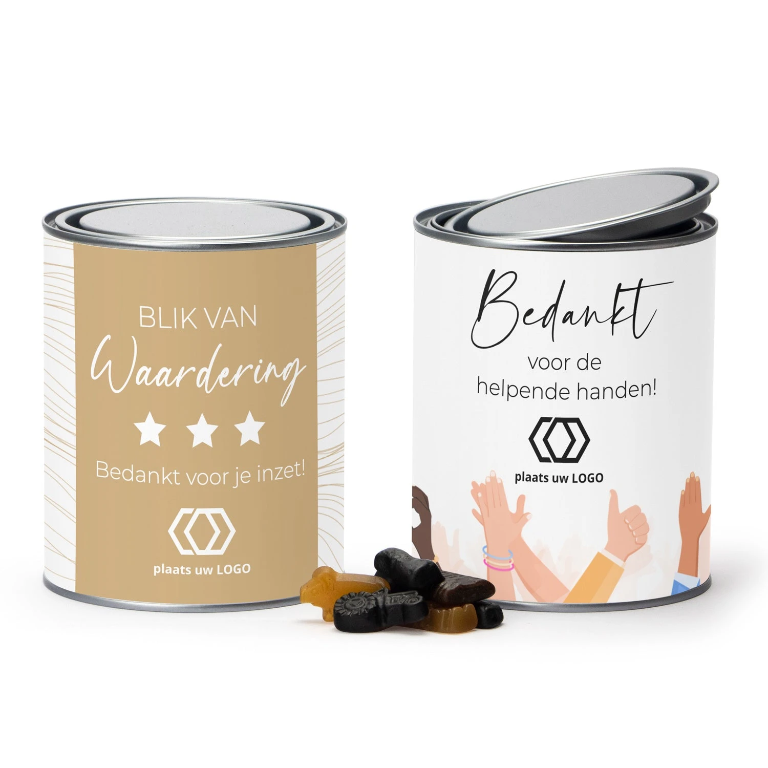 Groot verfblik van 1 liter, inclusief een eigen wikkel die je kunt voorzien van een eigen tekst en/of logo. Kies een passende vulling en je hebt een heel gaaf geschenk voor personeel of klanten. Het blik zal zeker bewaard worden, dus de boodschap die je erop zet zal nog lang te zien zijn. Al vanaf 10 stuks met eigen wikkel.